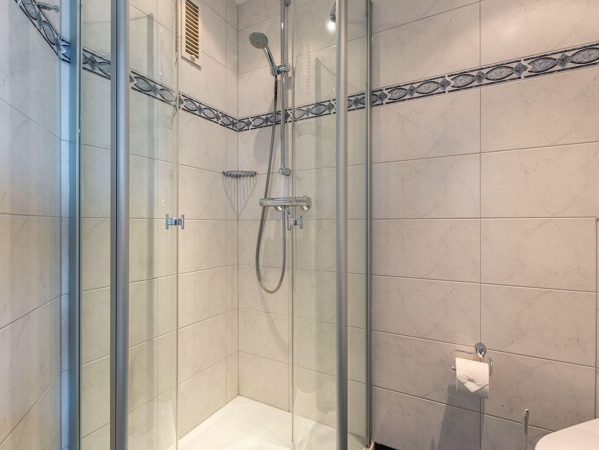 Modernes Badezimmer (Duschbad) mit Dusche mit niedrigem Eintritt (ca. 15cm), WC und Föhn.
