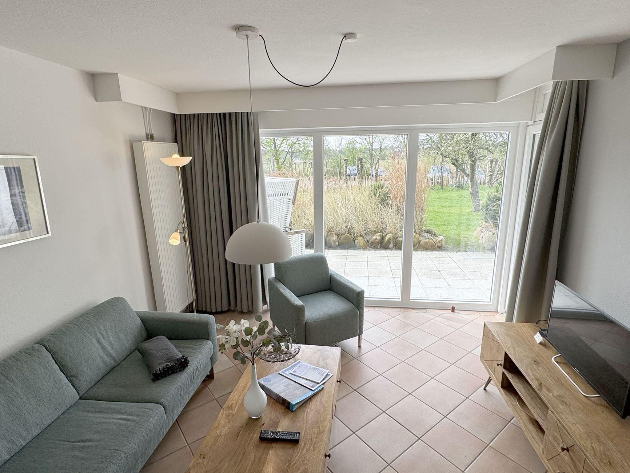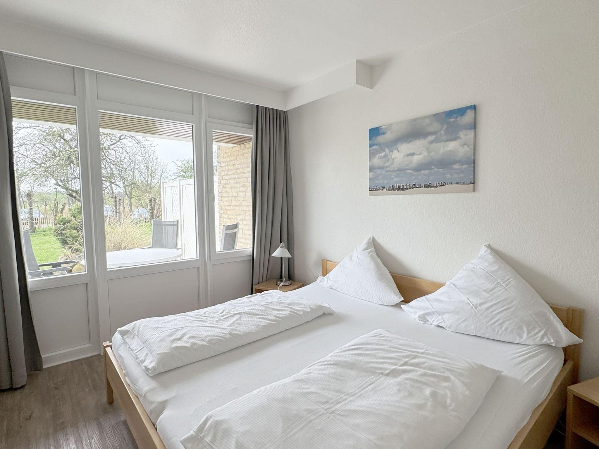 Die ca. 55 qm teilen sich folgendermaßen auf:Eingangsbereich mit Garderobe, offener Wohnraum mit Essbereich und integrierter Einbauküche,Einzelschrankbett (90x200cm,Matratze ), direkter Zugang zur Loggia und Garten, Schlafzimmer mit Doppelbett (180x200cm,getrennte Matratzen), 1 Duschbad mit WC und Waschbecken.