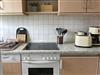 Küche mit Ceran-Kochfeld, Backofen, Kühlschrank.