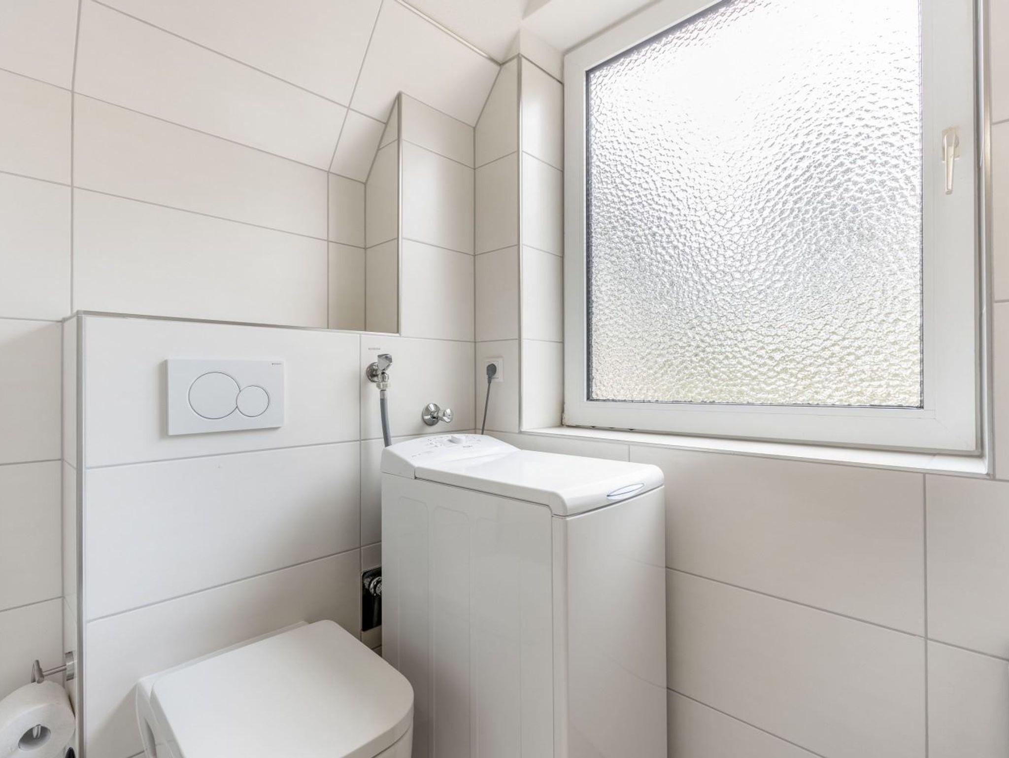 Badezimmer (Duschbad) mit Dusche (ca. 70x85cm), WC, Waschmaschine (Toploader), Heizlüfter, Föhn und Tageslicht.