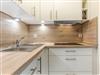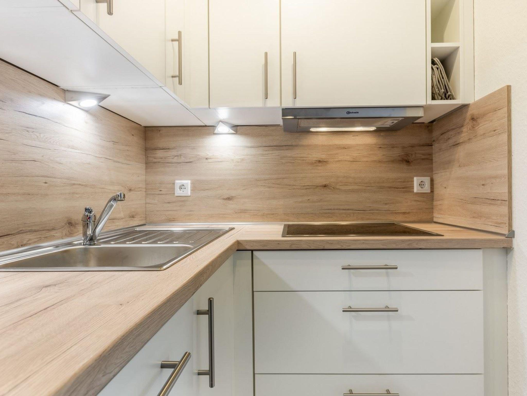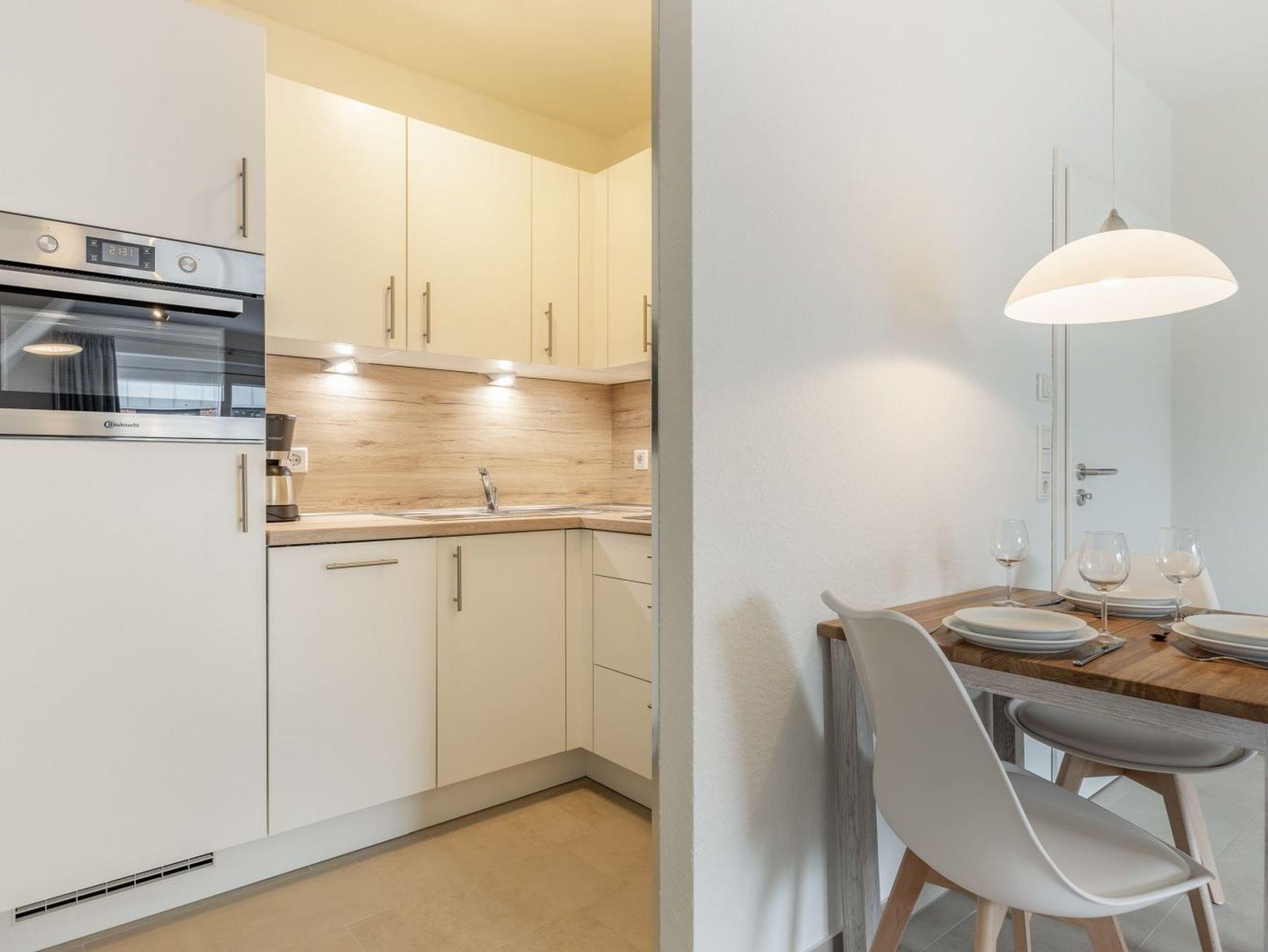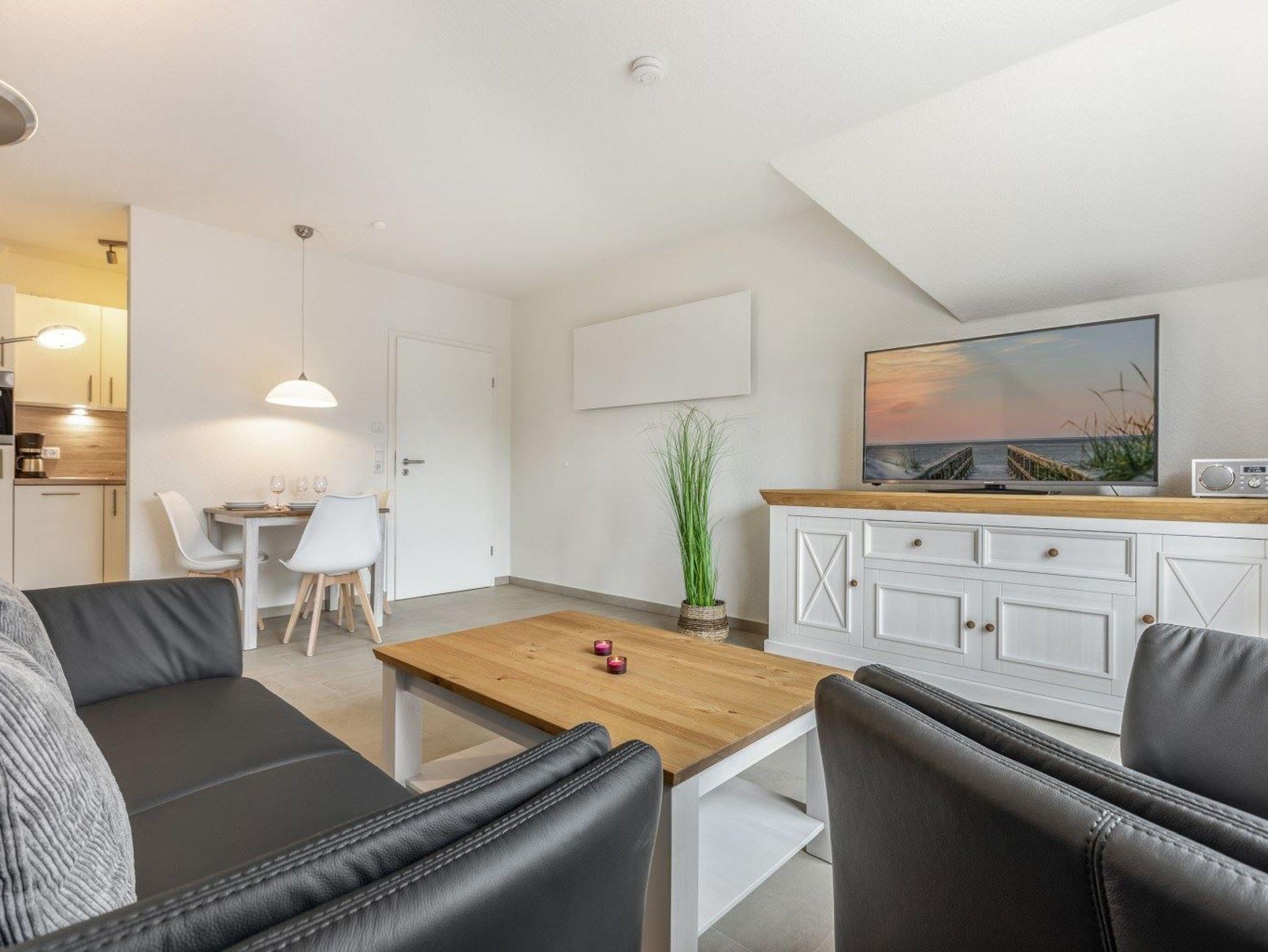 Wohnzimmer mit Sofa (2er), 1 Sessel, großes SMART-TV (Kabel) und Esstisch mit 3 Stühlen. Direkter Zugang zum möblierten Balkon nach Südwesten. Halboffene Küche mit Kombibackofen mit Mikrowelle, Kühlschrank mit Gefrierfach und Geschirrspüler.