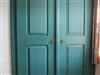 Weitere Details: Sideboard und Vitrine aus massiver blau lasierter Kiefer und antiker Kleiderschrank (Nussbaum).