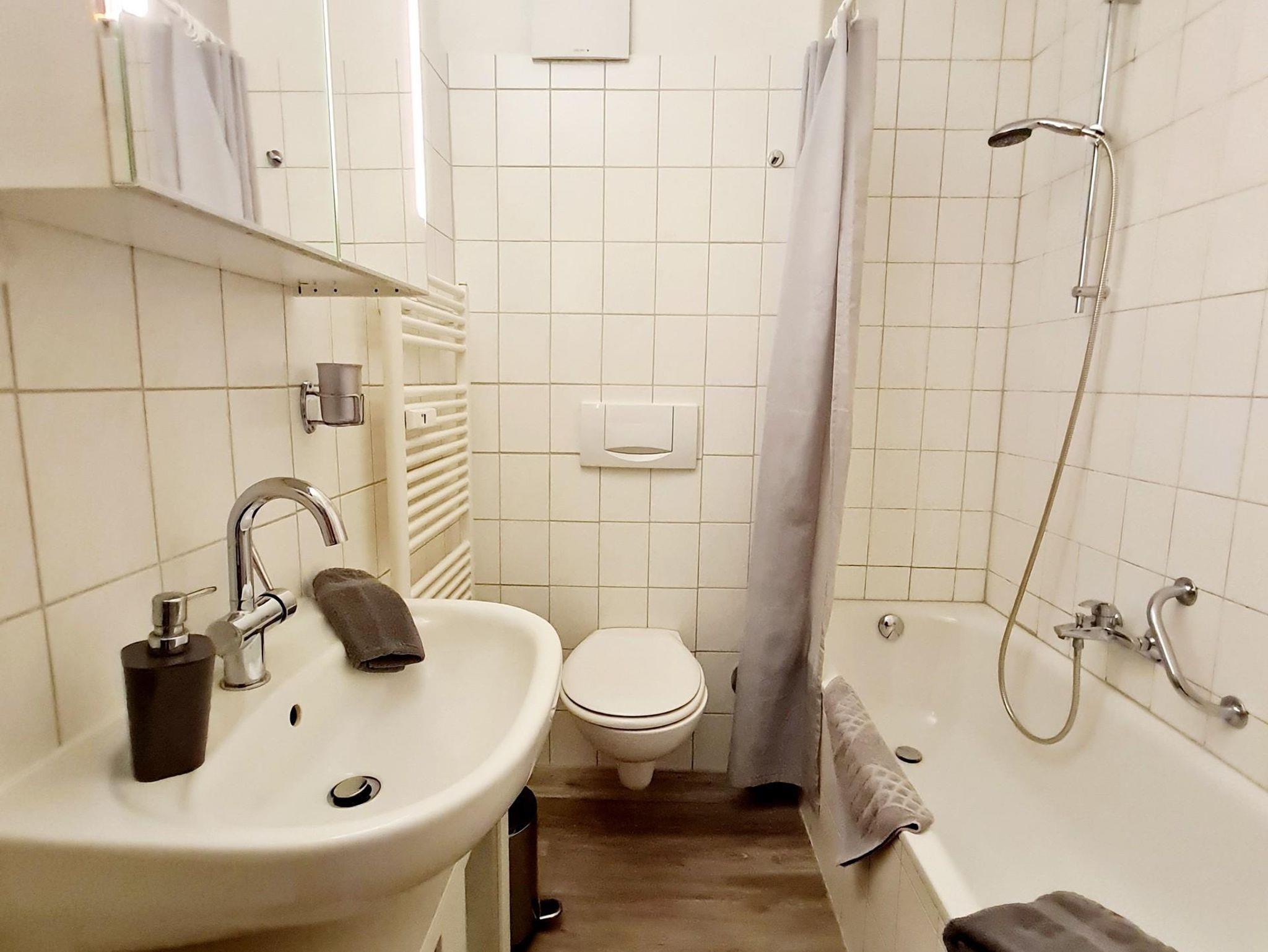 Ein modern und hell gestaltetes Badezimmer mit Badewanne runden das Ambiente ab.