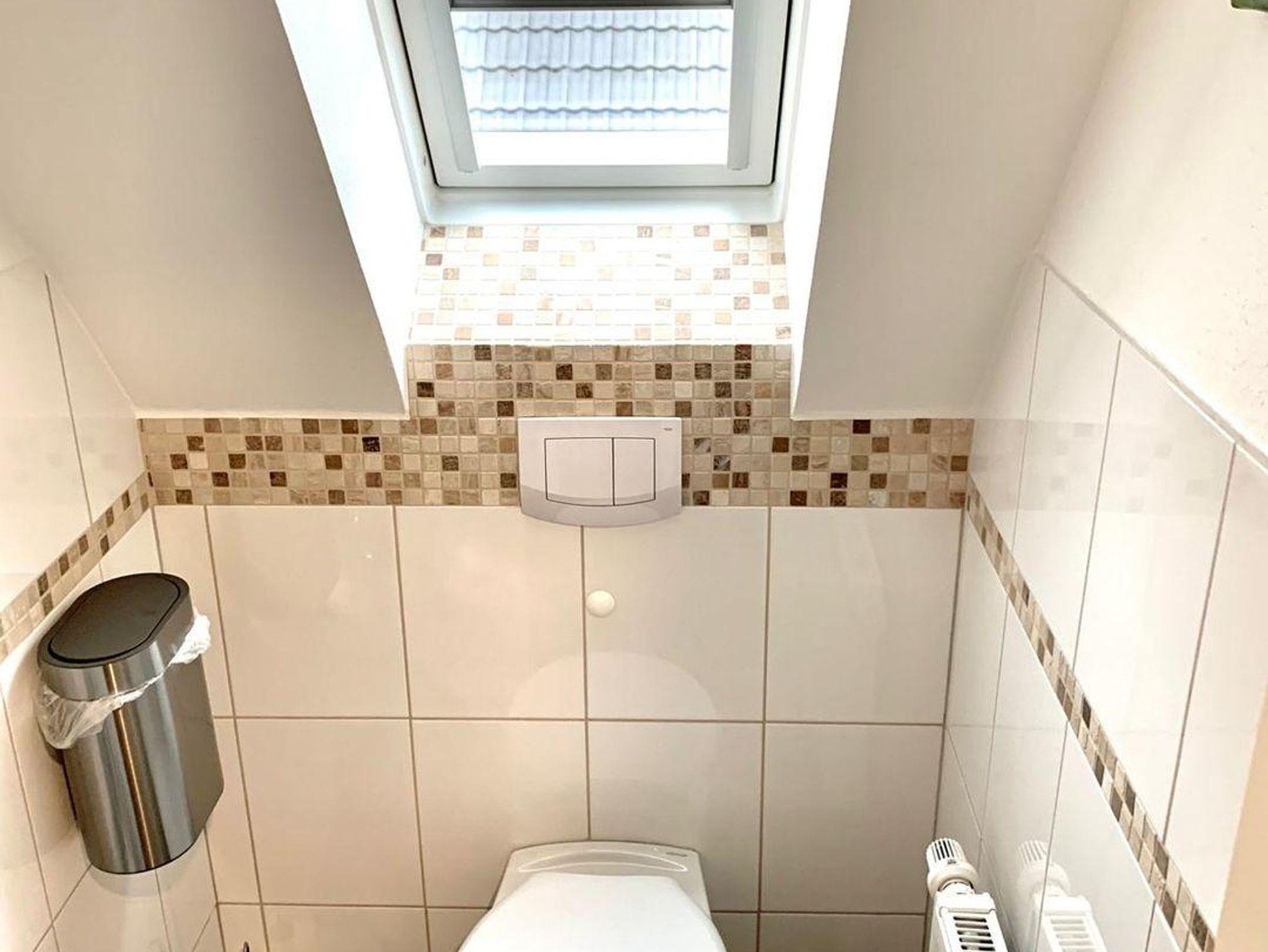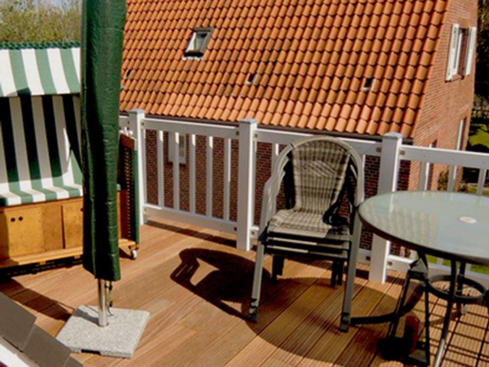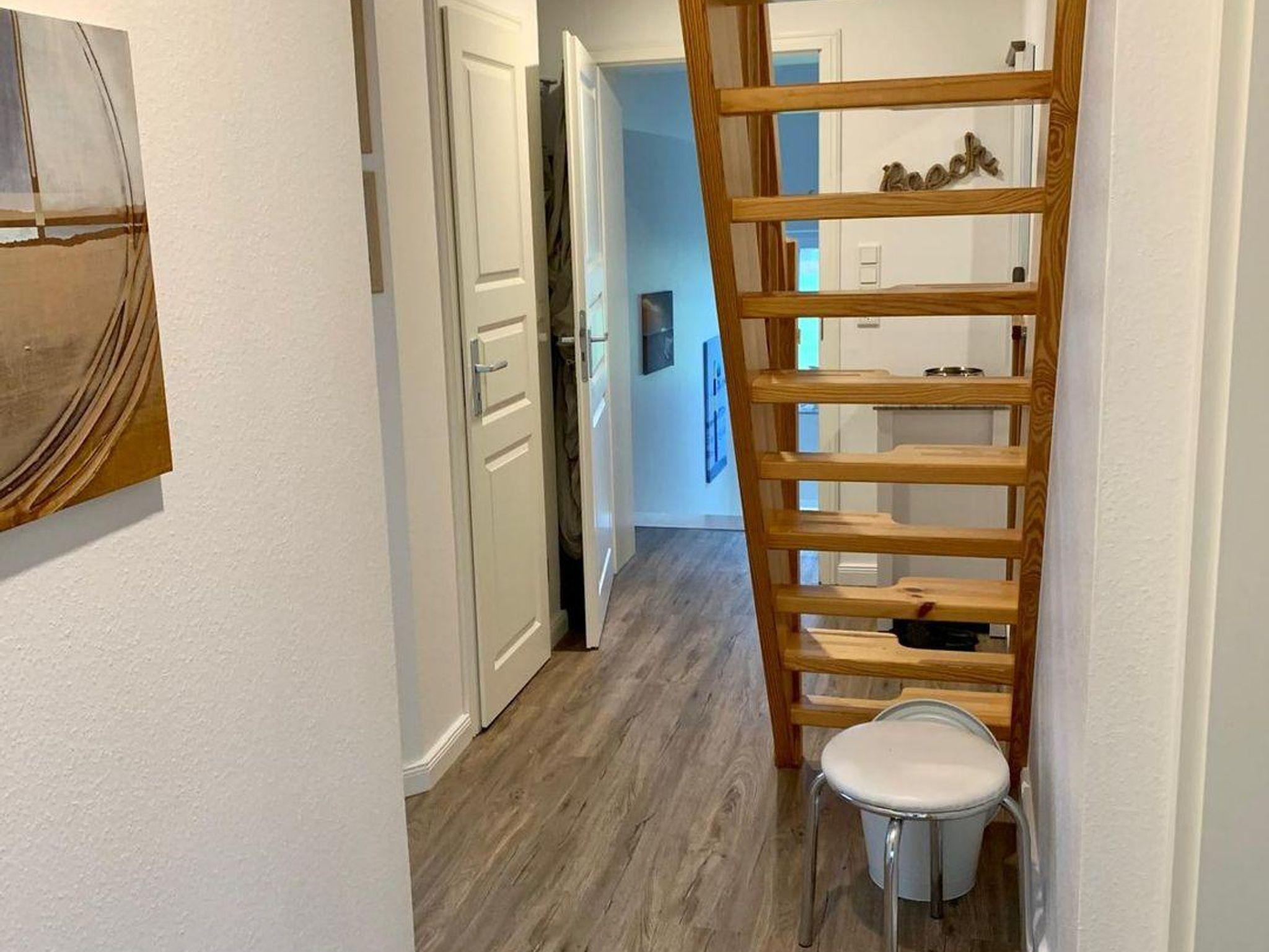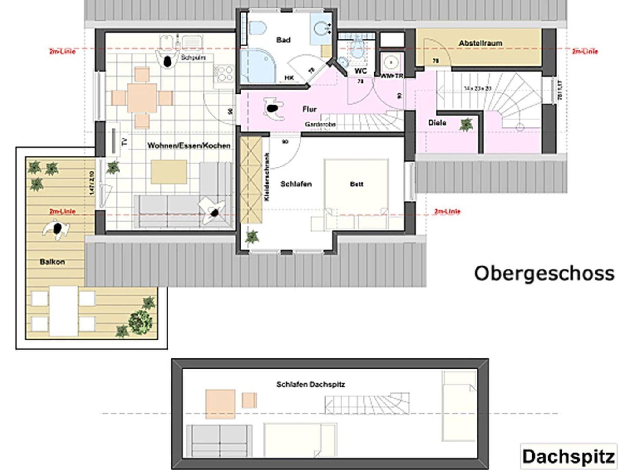Obergeschoß, ca 50 qm Wohnfläche sowie ein Spitzboden, aufgeteilt in drei Zimmer (incl. Spitzboden) Wohn-Esszimmer mit offener Küche. Ausgang auf einen großen Ost-Süd-Westbalkon, ausgestattet mit Gartenmöbeln, Sonnenschirm sowie Strandkorb. Schlafzimmer mit einem großen Boxspringbett, im Spitzboden zwei Betten & Sitzgelegenheit, Duschbad/WC, separates WC, Abstellraum.