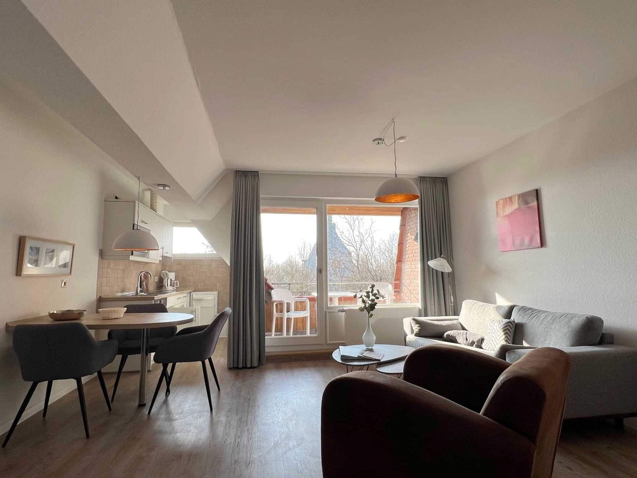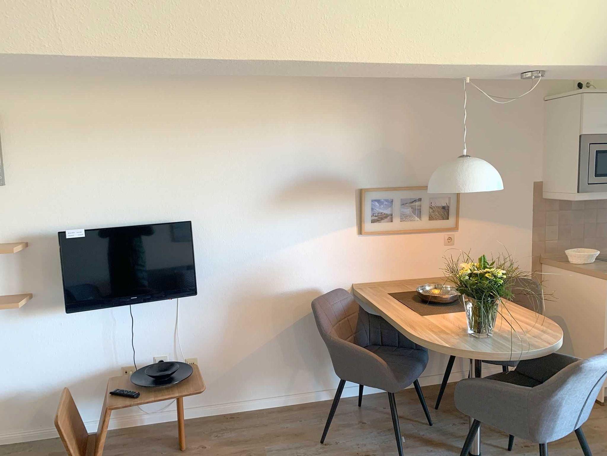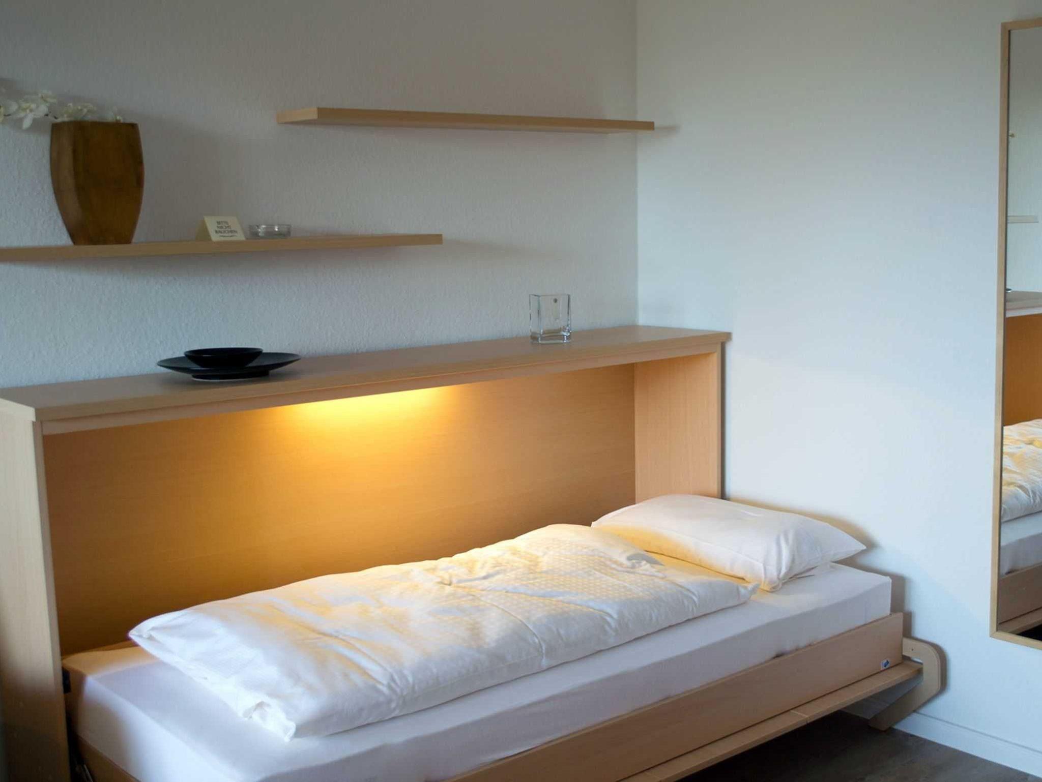 Sie teilt sich wie folgt auf: Eingangsdiele mit Garderobe, Schlafzimmer mit Doppelbett, Duschbad mit WC. Der großzügige Wohnraum mit direktem Zugang zur Loggia überzeugt mit seiner gemütlichen Sitzecke, der modernen weißen Küche, der Essecke und als weitere Schlafmöglichkeit 1 Schrankbett,