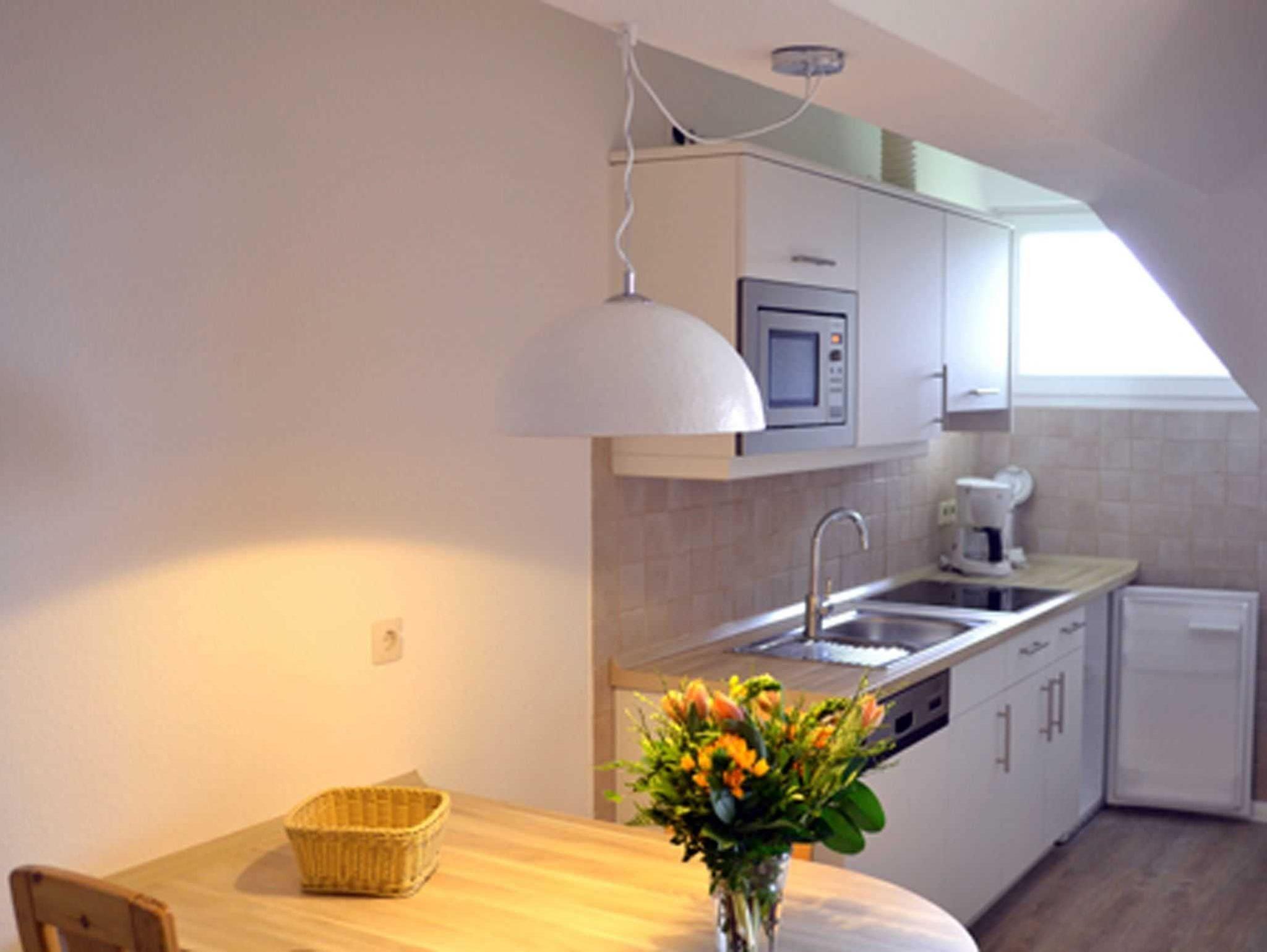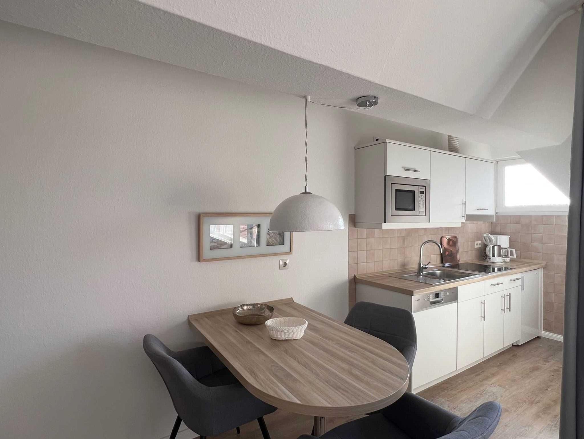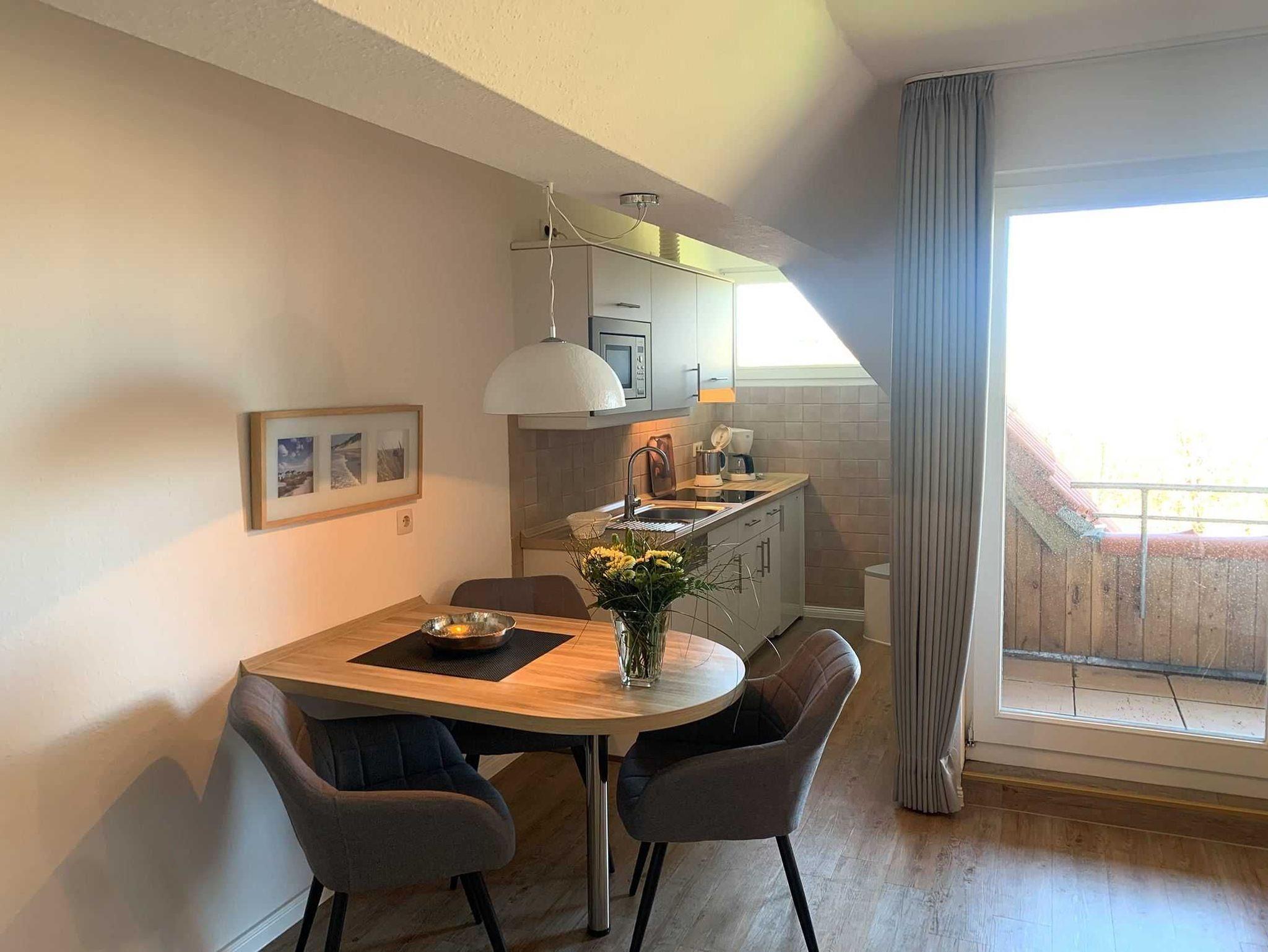 Sie teilt sich wie folgt auf: Eingangsdiele mit Garderobe, Schlafzimmer mit Doppelbett, Duschbad mit WC. Der großzügige Wohnraum mit direktem Zugang zur Loggia überzeugt mit seiner gemütlichen Sitzecke, der modernen weißen Küche, der Essecke und als weitere Schlafmöglichkeit 1 Schrankbett,