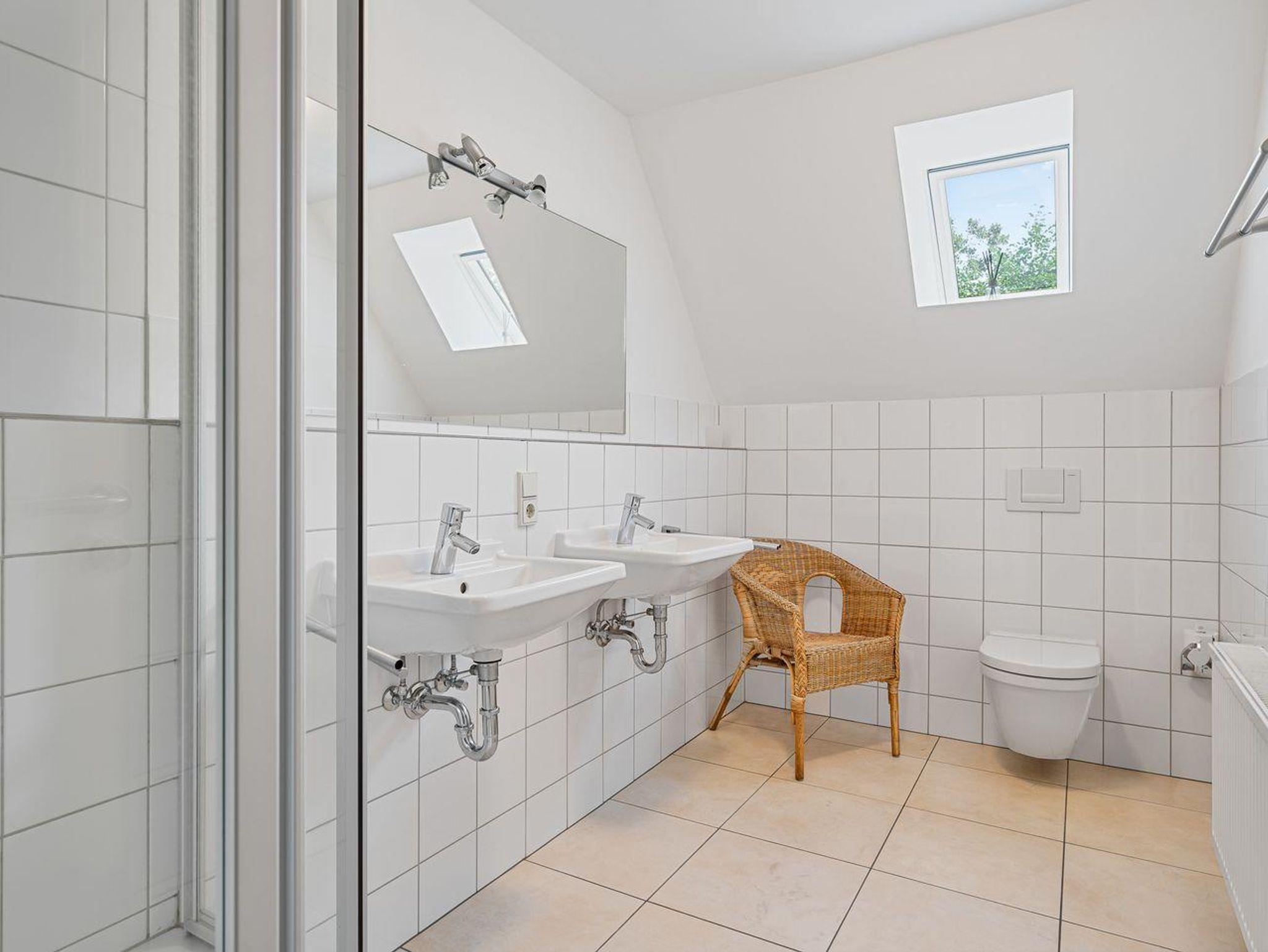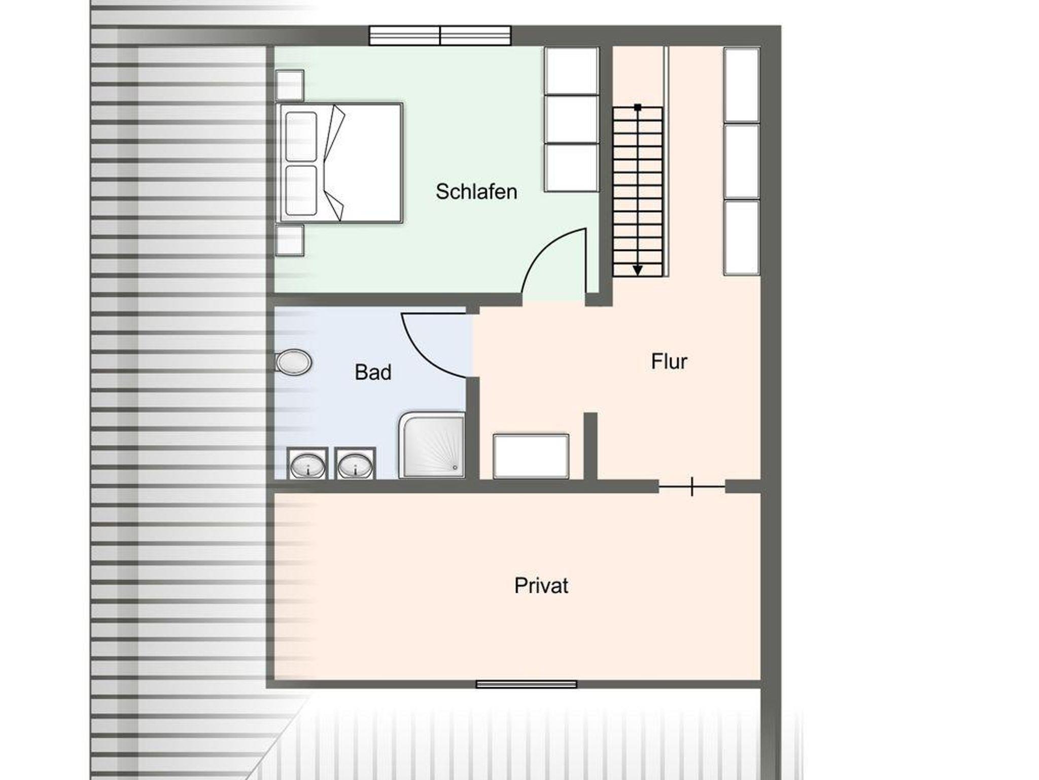Über eine Holztreppe gelangen Sie in das Obergeschoss. Ein Schlafzimmer mit einem Doppelbett (1,80 x 2,00) ist ausgestattet mit einem großen Kleiderschrank. Darüber hinaus befindet sich im Obergeschoss ein weiteres Bad mit Dusche.