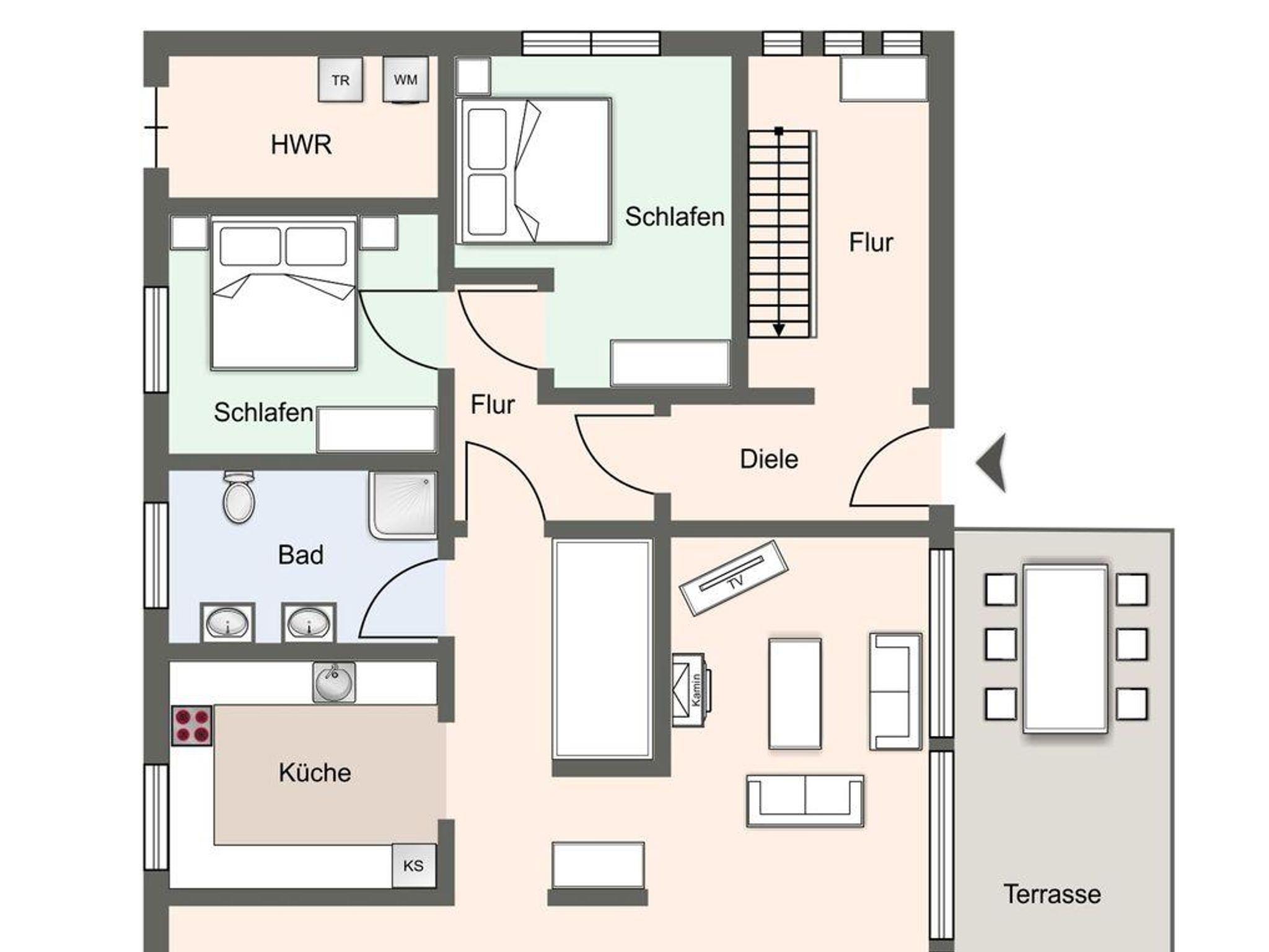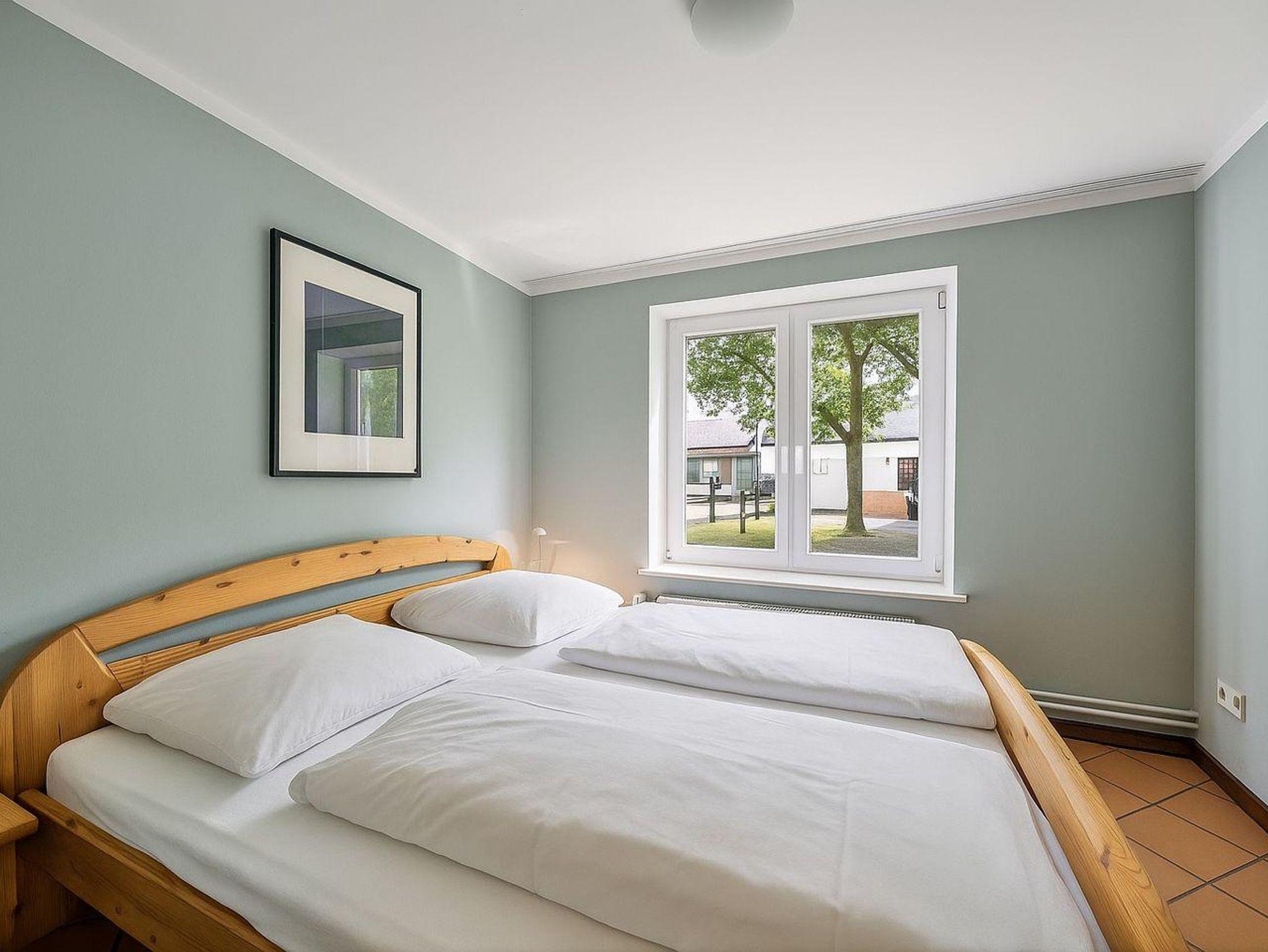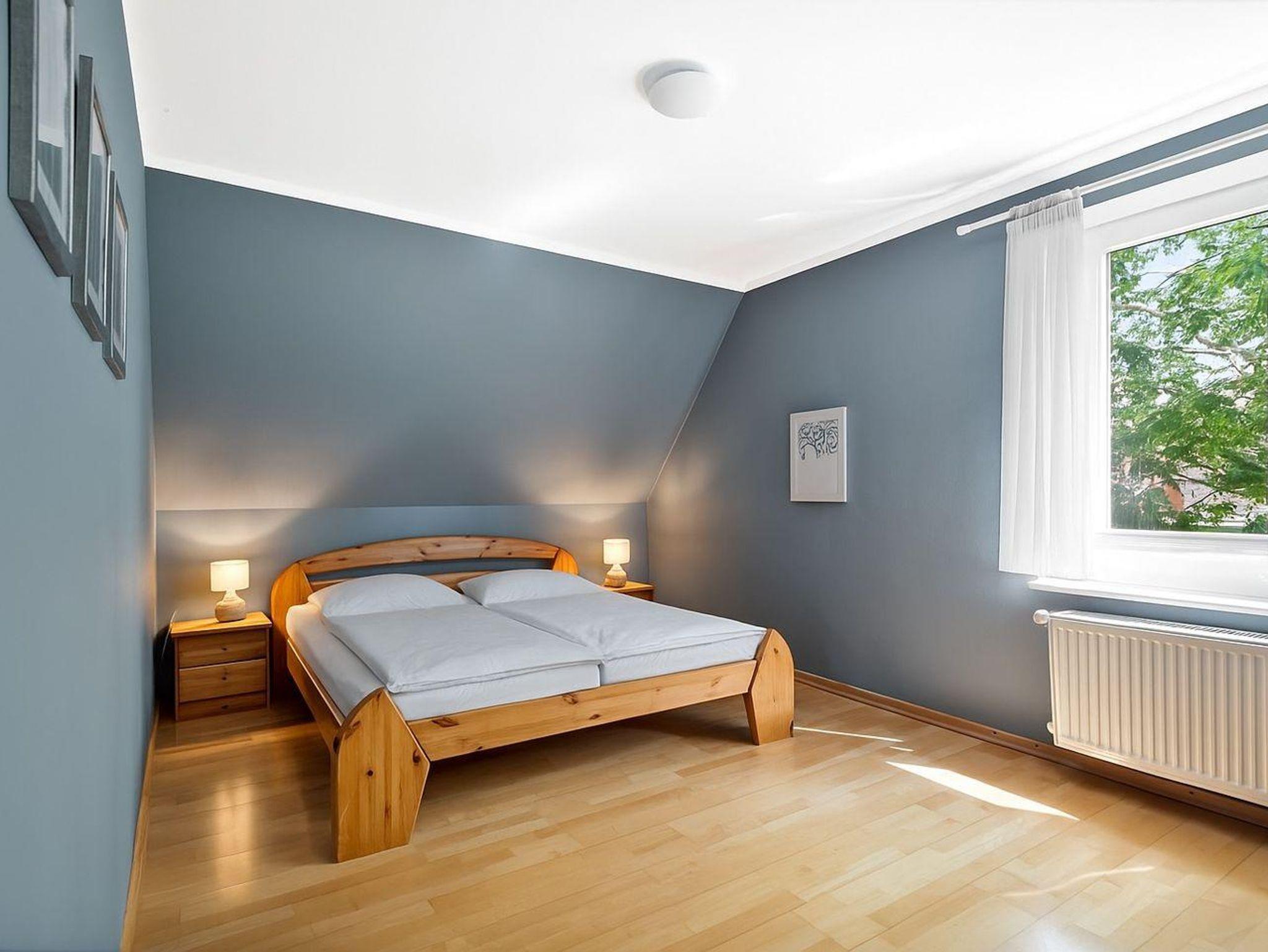 Vom Flur mit Garderobe, gelangen Sie in ein Duschbad, sowie in die zwei Doppelschlafzimmer (1,80 x 2,00 Meter und ein Bett 1,60 x 2,00 Meter)
