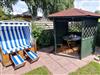 TerrasseSüdterrasse mit Gartenmöbeln aus Holz für 6 Personen, Strandkorb und Gästegrill
