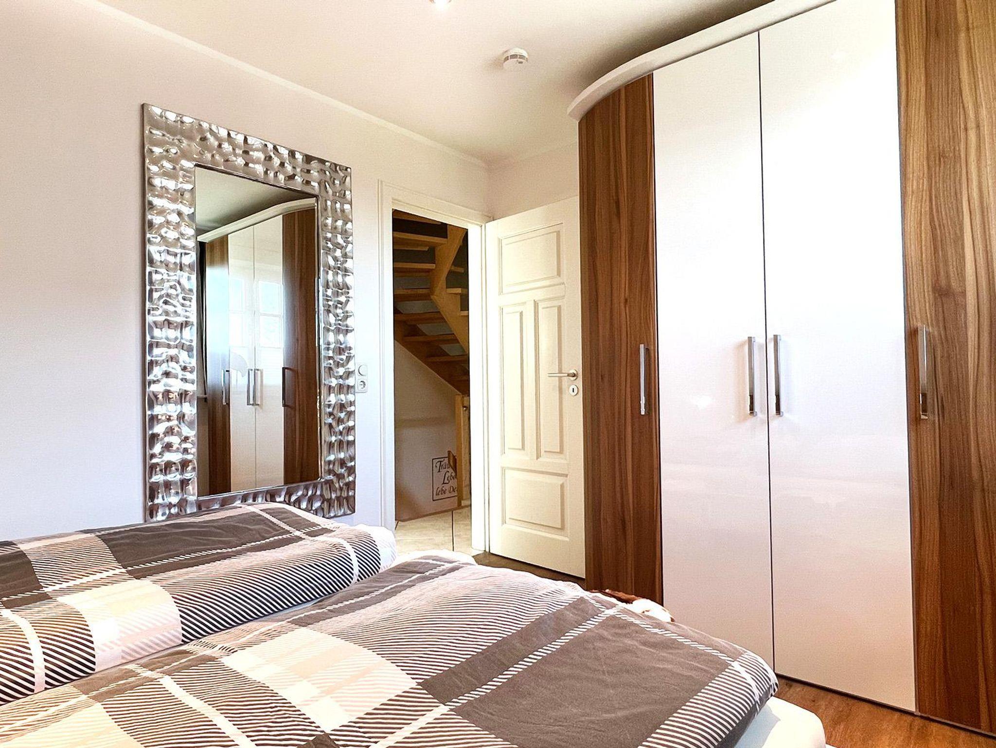Schlafzimmer1. OG: Doppelbett 2,00 x 1,80 m, Lattenrost Kopf- und Fussteil verstellbar, 2 Nachttische, Kleiderschrank, Spiegel, mit kleiner Nische für Kosmetik oder als Arbeitsplatz nutzbar
