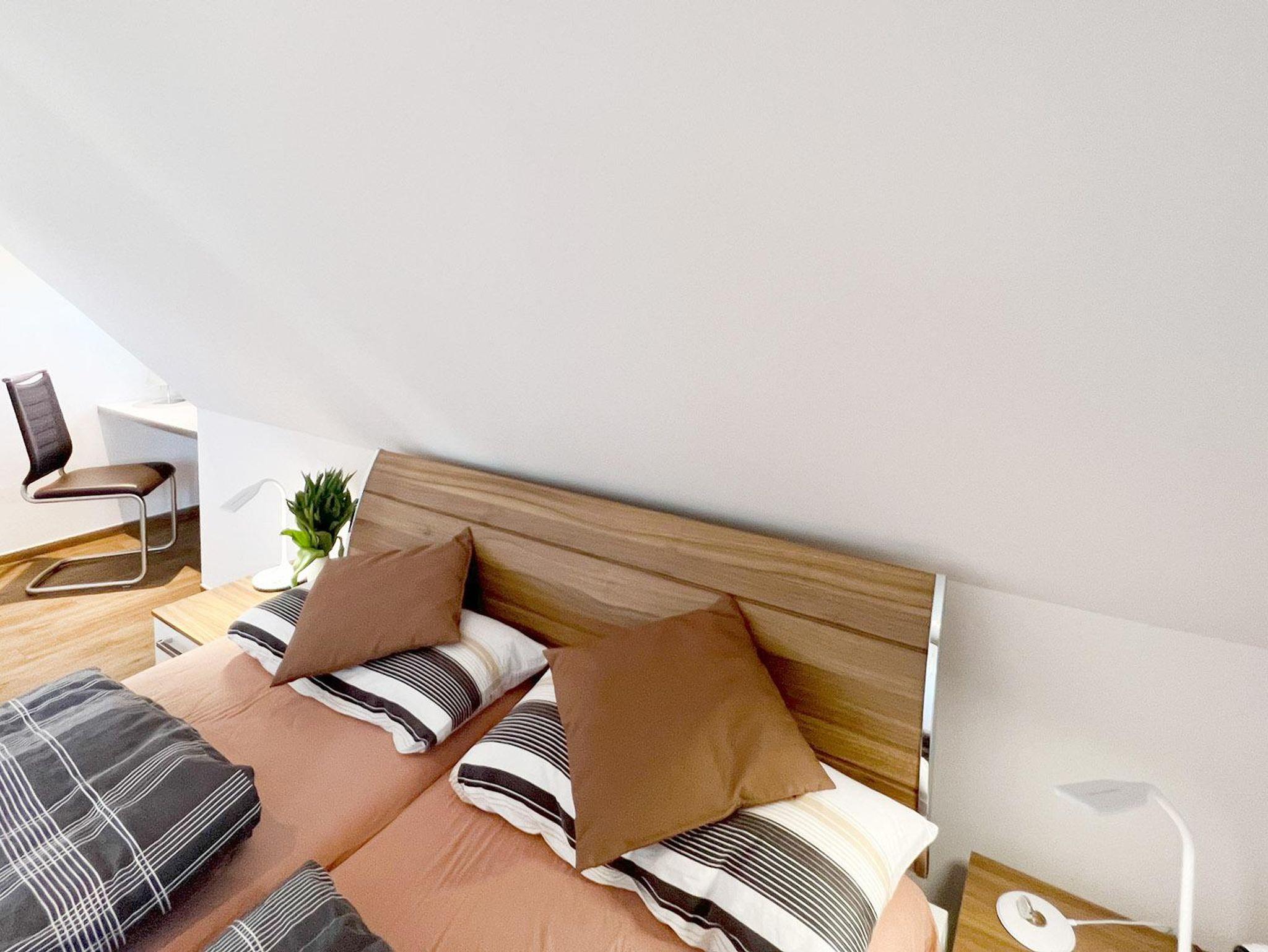 Schlafzimmer 21. OG: Doppelbett 2,00 x 1,80 m, Lattenrost Kopf- und Fussteil verstellbar, 2 Nachttische, Kleiderschrank, Spiegel,
