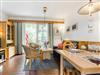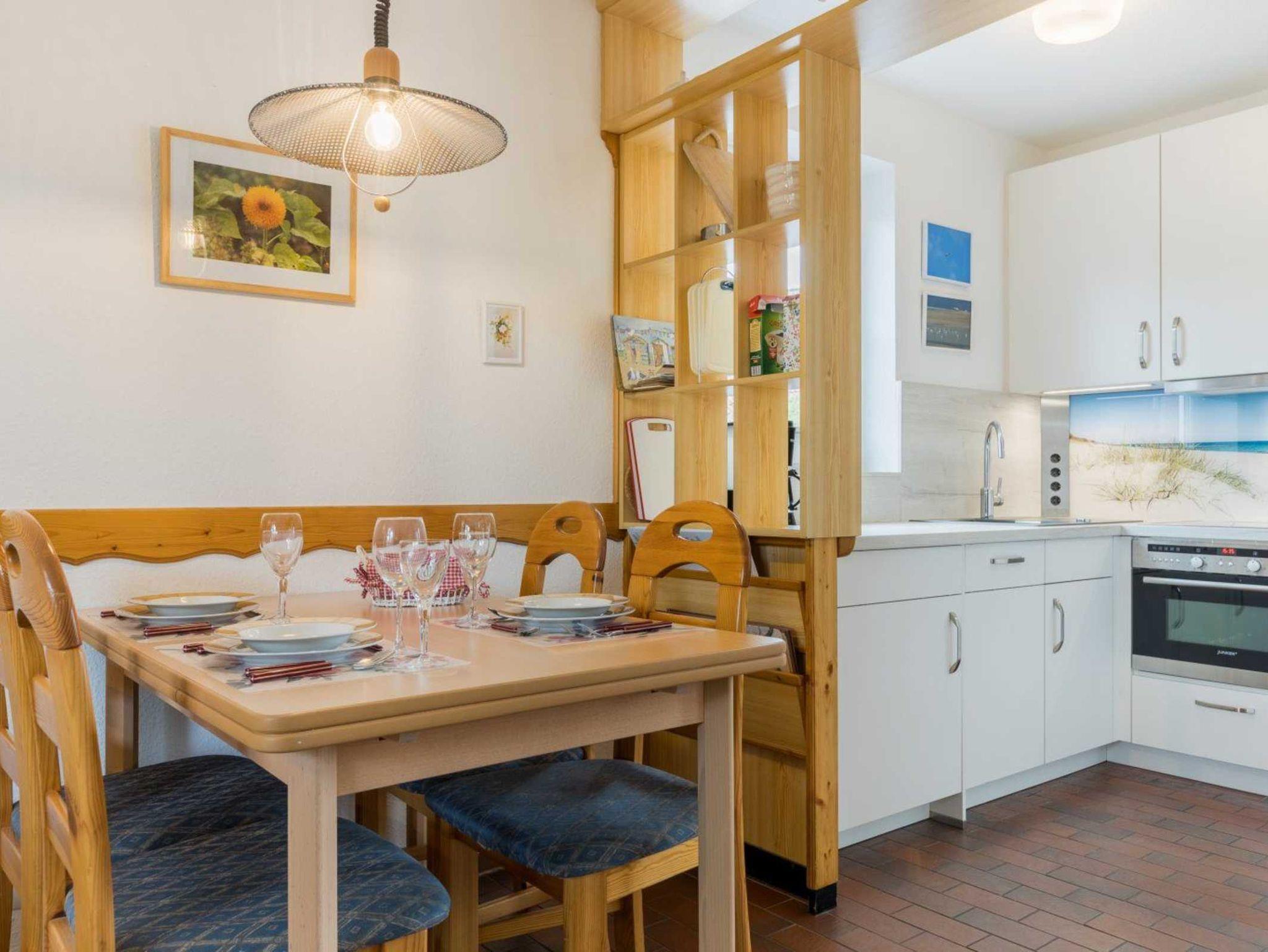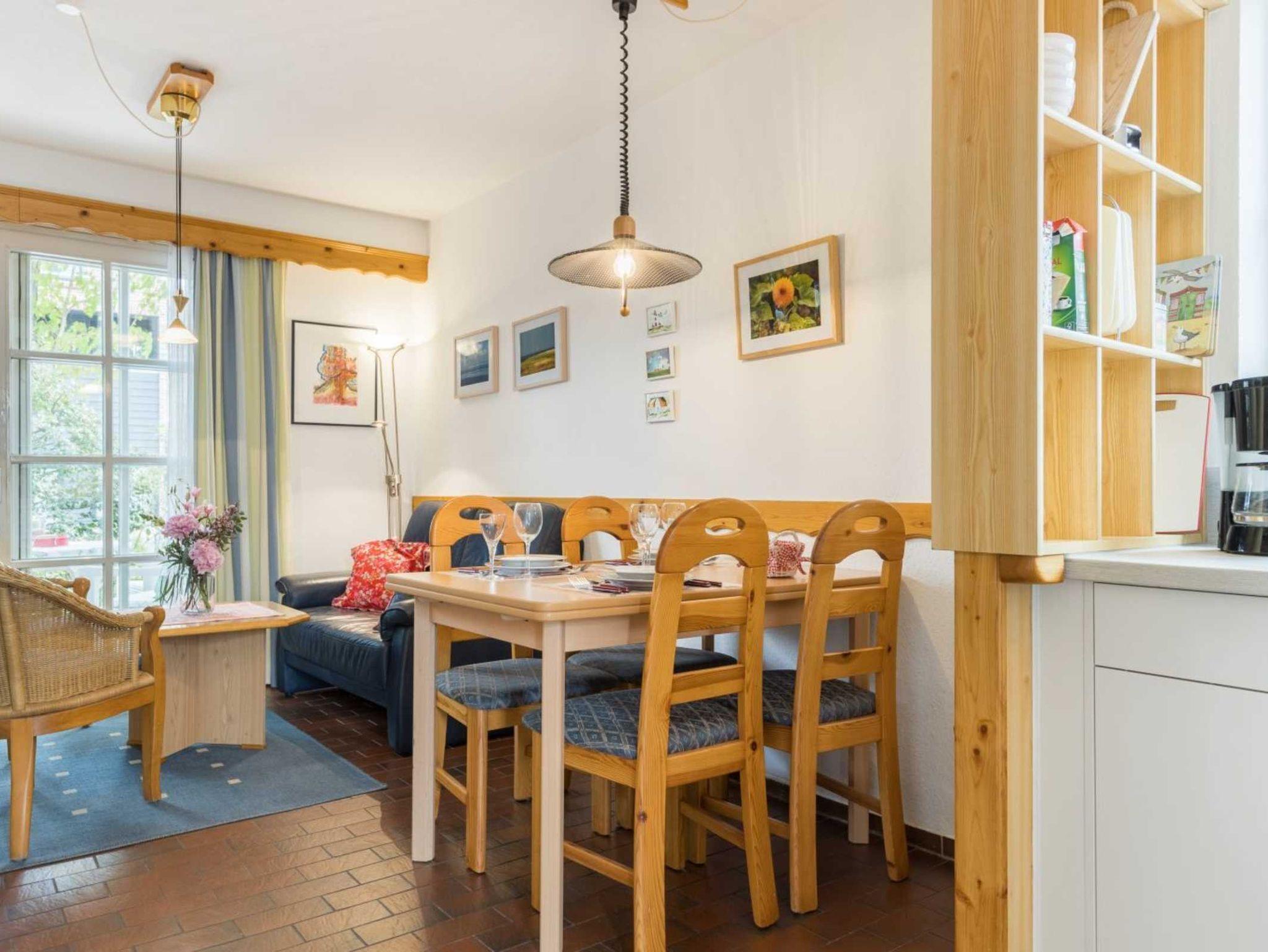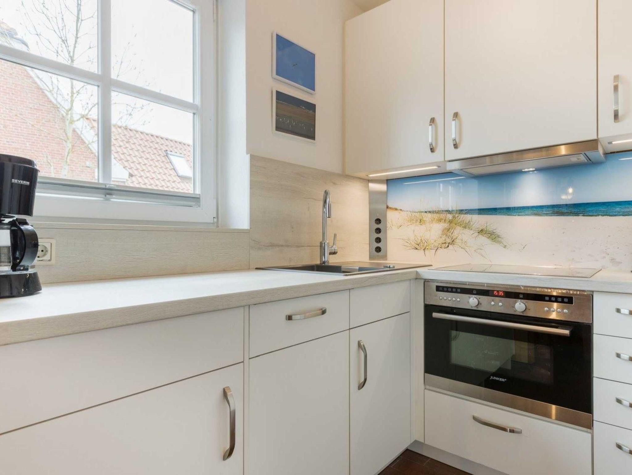 Wohnzimmer mit Sofa (2er), TV (Sat), DVD-Player, Stereo-Kompaktanlage, Kaminofen und separater Essecke mit 4 Stühlen. Offene Küche mit Backofen, Mikrowelle, Kühlschrank mit Gefrierfach und Geschirrspüler. Direkter Zugang zur windgeschützten, möblierten Terrasse nach Osten mit Strandkorb.
