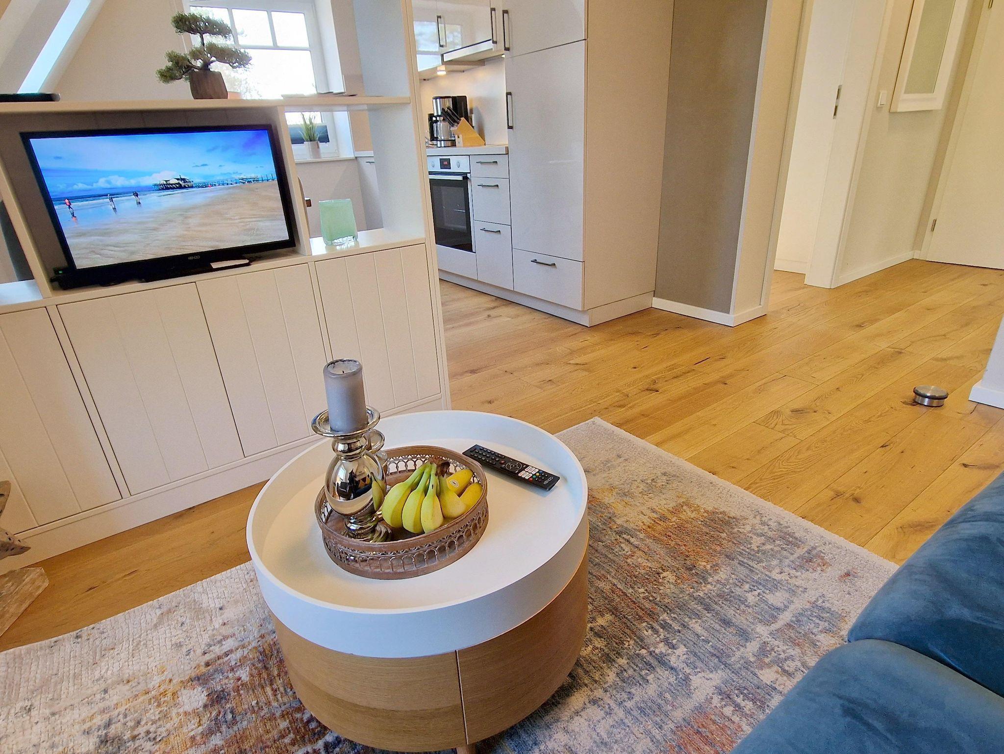 Wohnzimmer: Couch, Couchtisch, Flachbild-TV, Stehlampe, Essplatz mit 4 Stühlen.