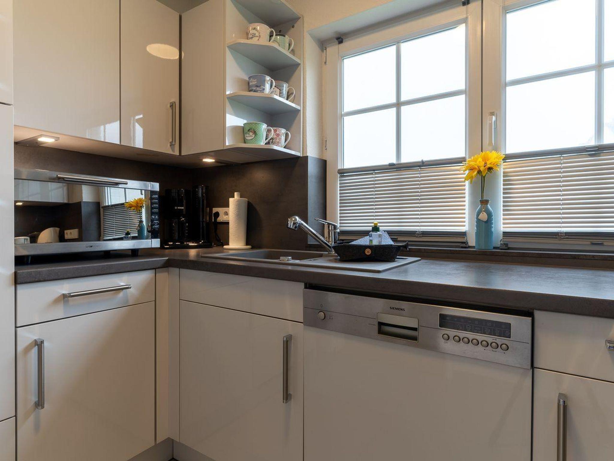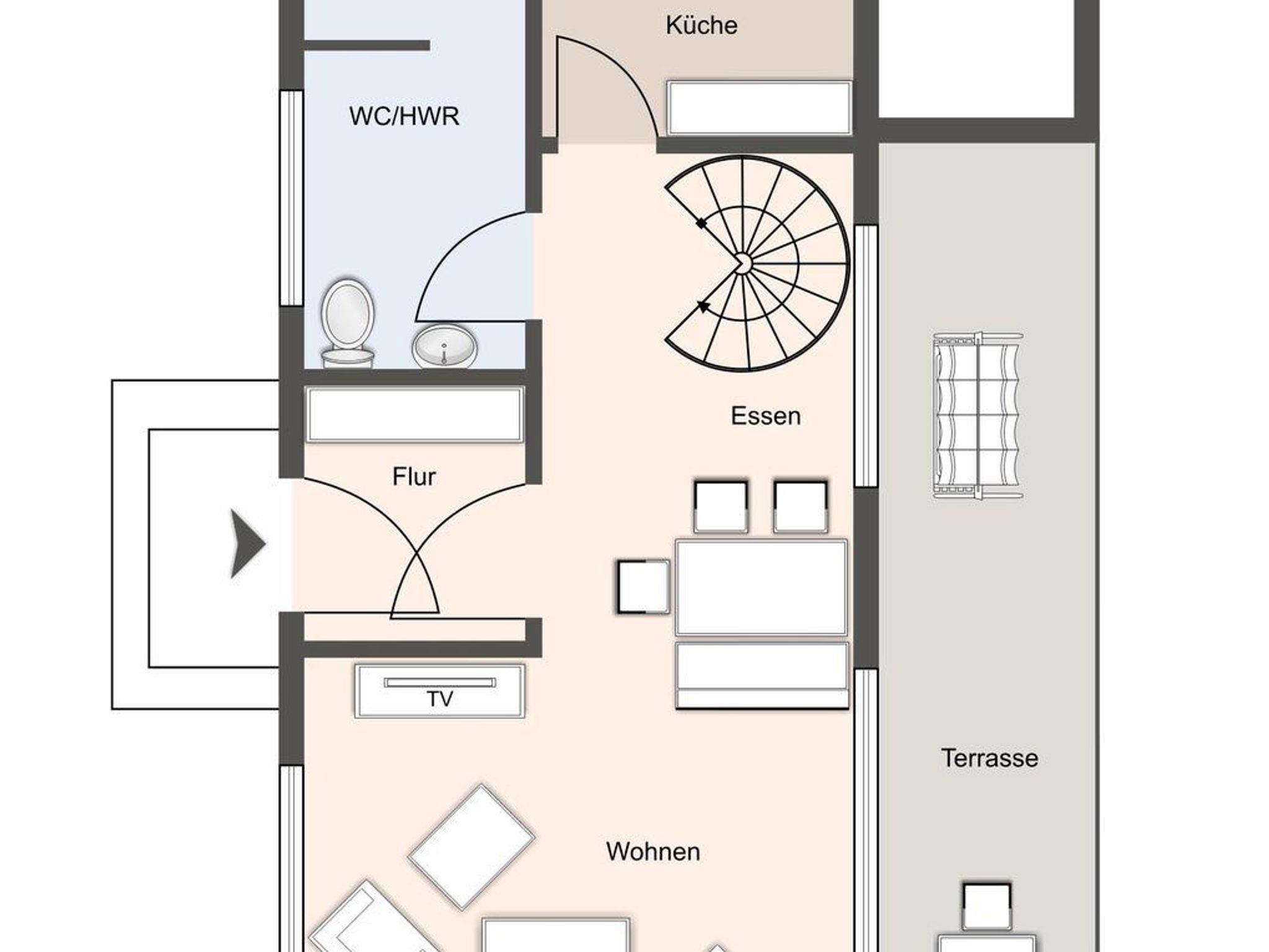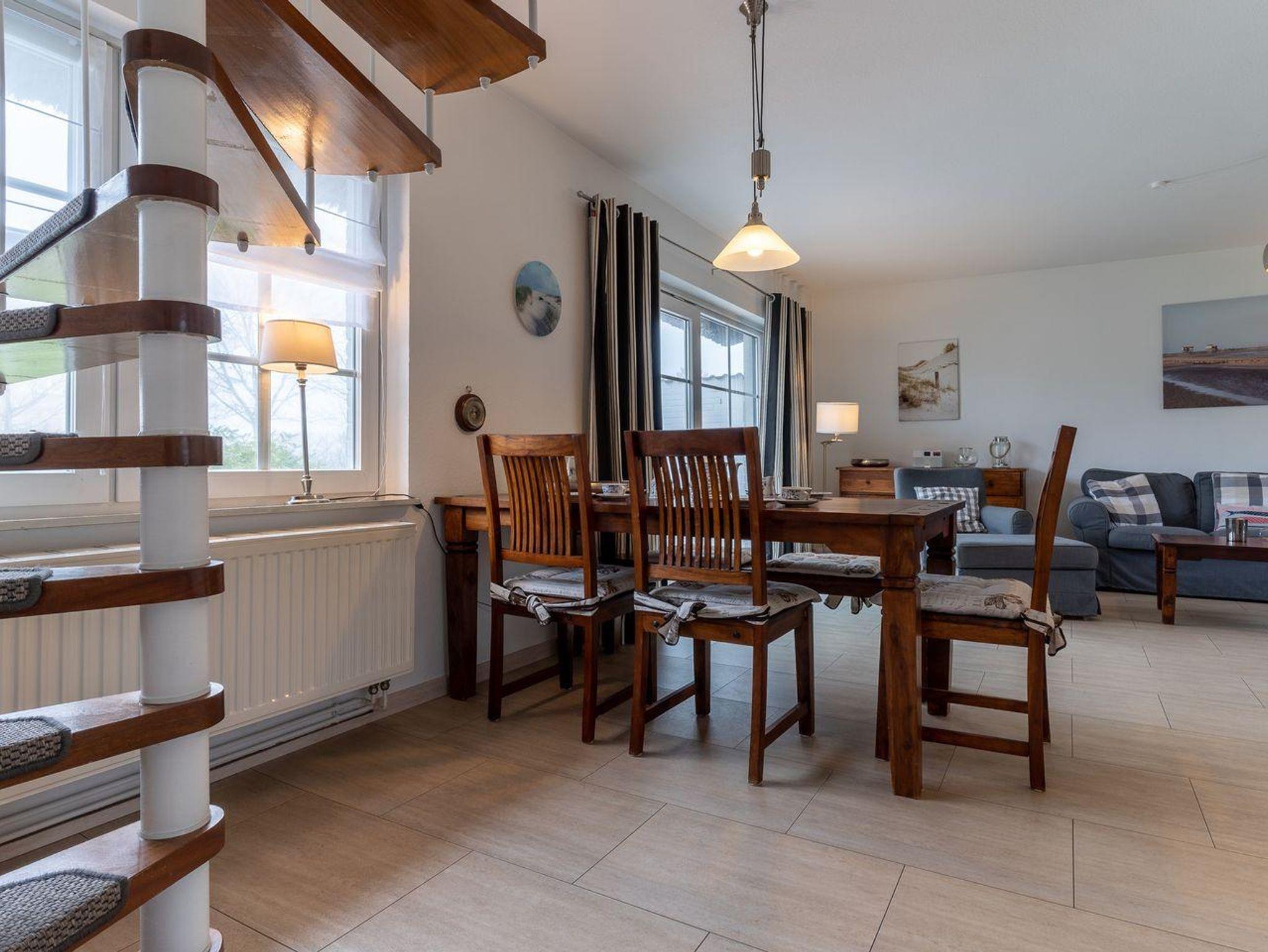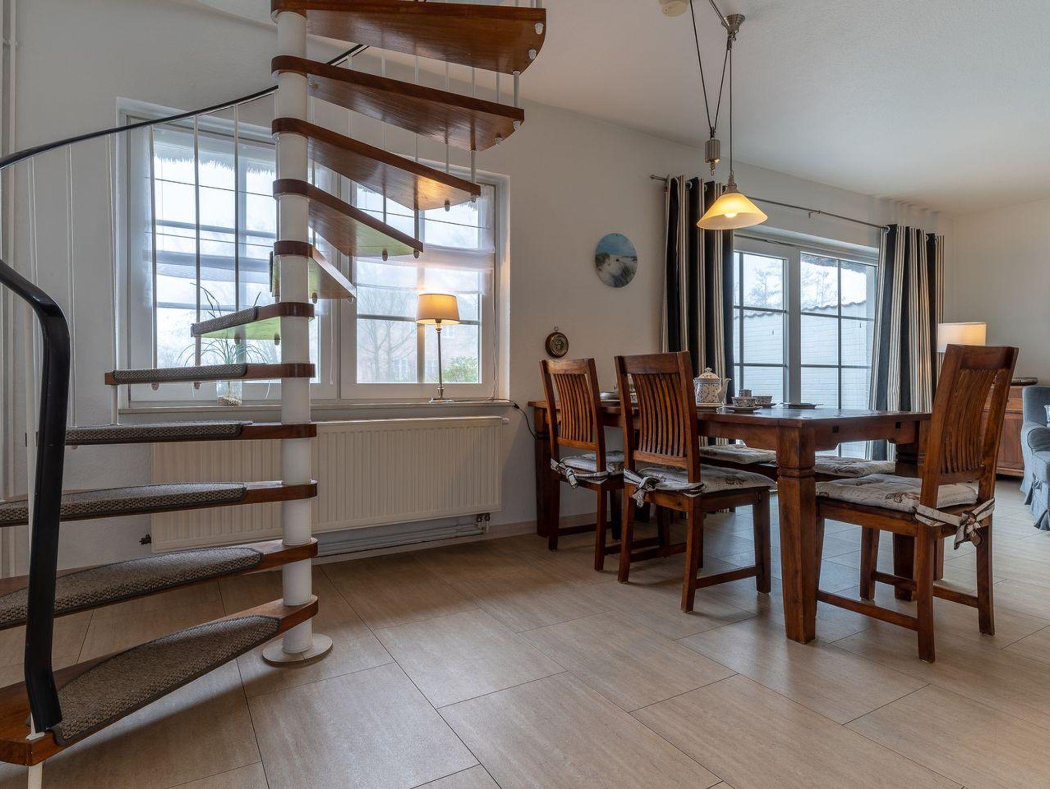 Im Erdgeschoss befindet sich der Wohnraum mit einer großzügigen Sitzecke und einem Essbereich. Vom Essbereich geht es direkt in die Küche, die voll ausgestattet ist. Im Erdgeschoss ist ebenso ein Flur mit eingebauter Garderobe, ein Hauswirtschaftsraum mit Gäste WC.