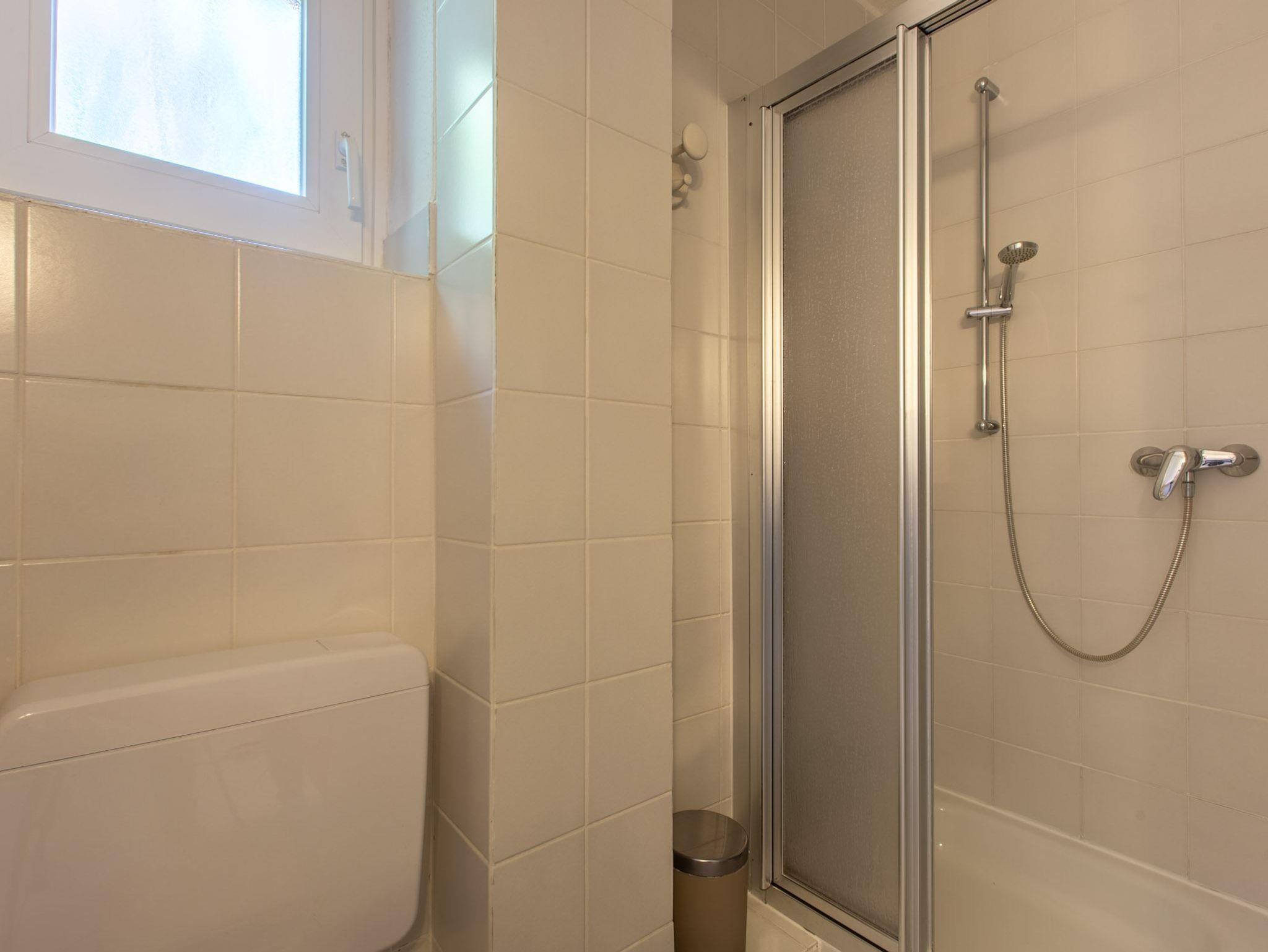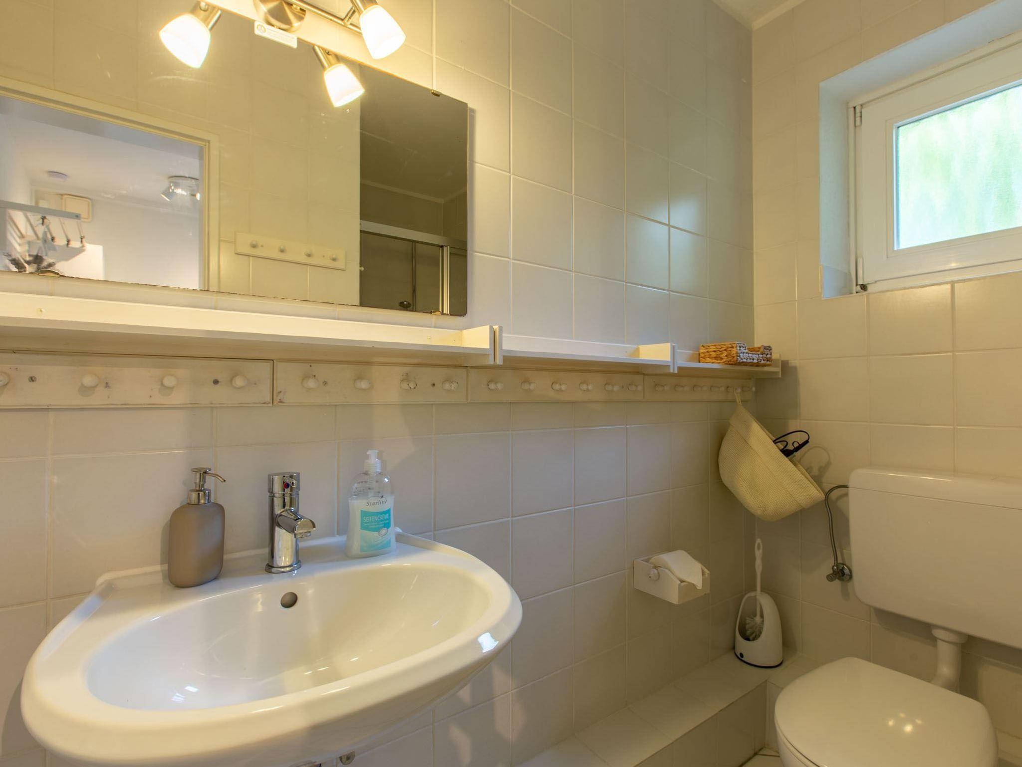Badezimmer (Duschbad) mit Dusche, WC, Tageslicht und Föhn.