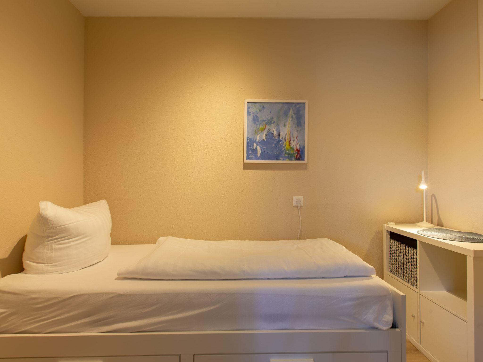 2. Schlafzimmer mit Einzelbett (80x200cm), das zum Doppelbett ausziehbar ist (2x 80x200cm), und Kommode.