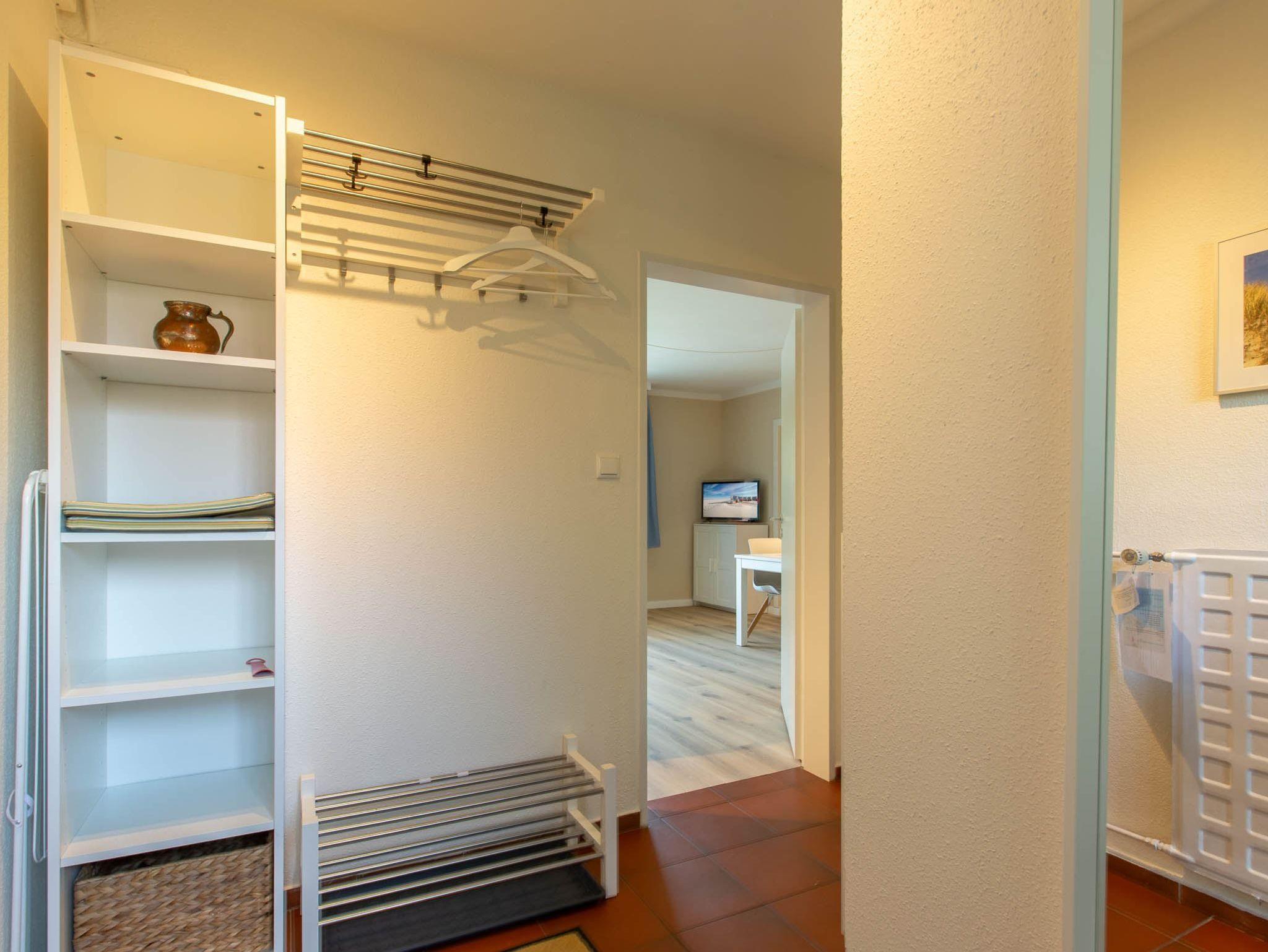 Flur mit Garderobe, Schuhablage und Haushaltskommode mit Staubsauger im Eingangsbereich. Die Wohnung verfügt über einen separaten Eingang, vor dem sich auch eine kleine Terrasse befindet.