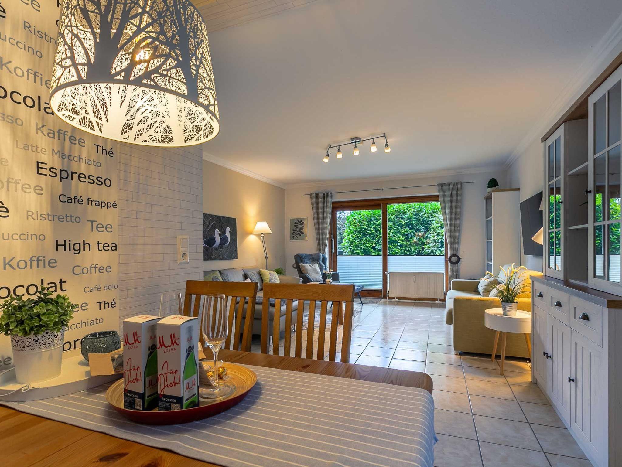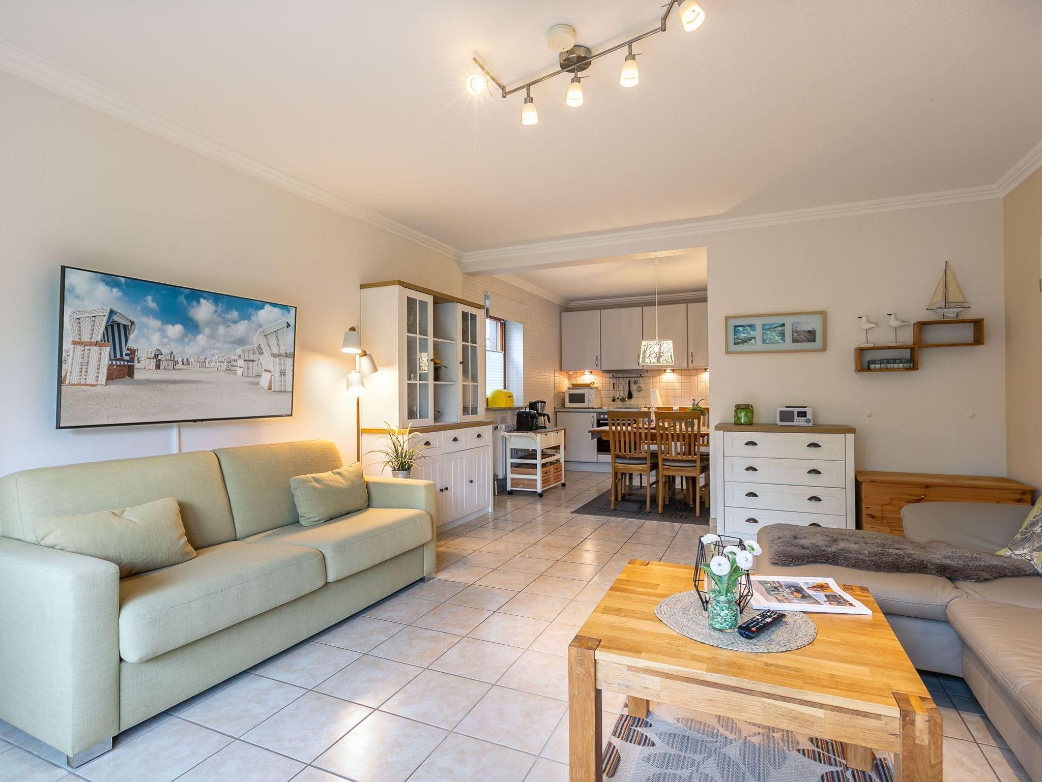 Großes Wohnzimmer mit ausziehbarem Schlafsofa (150x190cm), 2 Ledersofas (2er), 1 Sessel und großem TV (Kabel). Direkter Zugang zur windgeschützten Terrasse mit Strandkorb und dem gemeinschaftlichen Garten. Moderne offene Küche mit Backofen, Mikrowelle, Geschirrspüler, Kühlschrank mit Gefrierfach, Nespresso Kapsel-Kaffeemaschine und Esstisch mit 4 Stühlen.