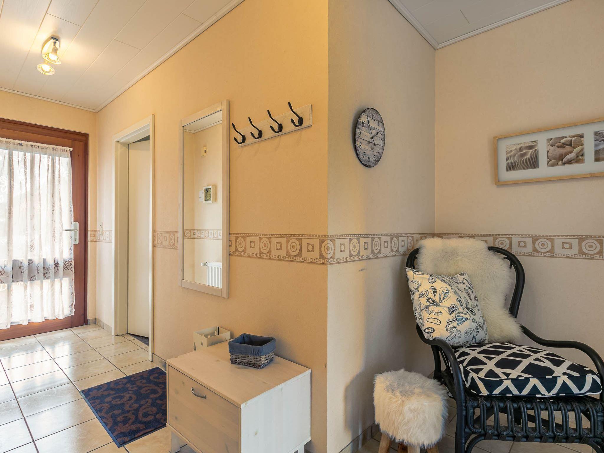 Flur mit Garderobe und bequemem Sessel im Eingangsbereich. Abstellraum mit Wäscheständer, Bügelbrett und -eisen.