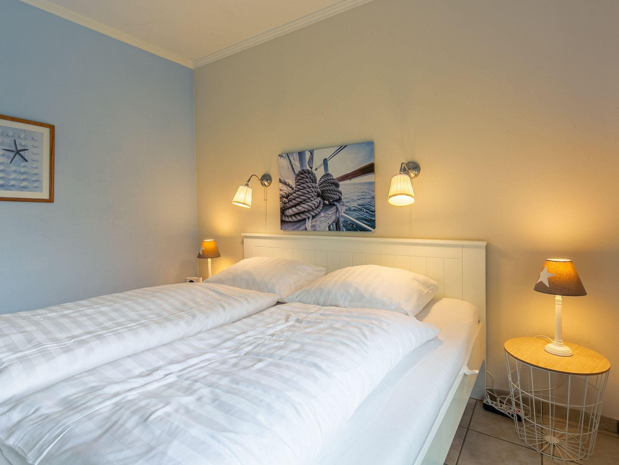 Maritim-romantisches Schlafzimmer mit Doppelbett (2x 90x200cm), Sofa (2er), Kleiderschank und TV. Ebenfalls direkter Zugang zur Gartenterrasse.