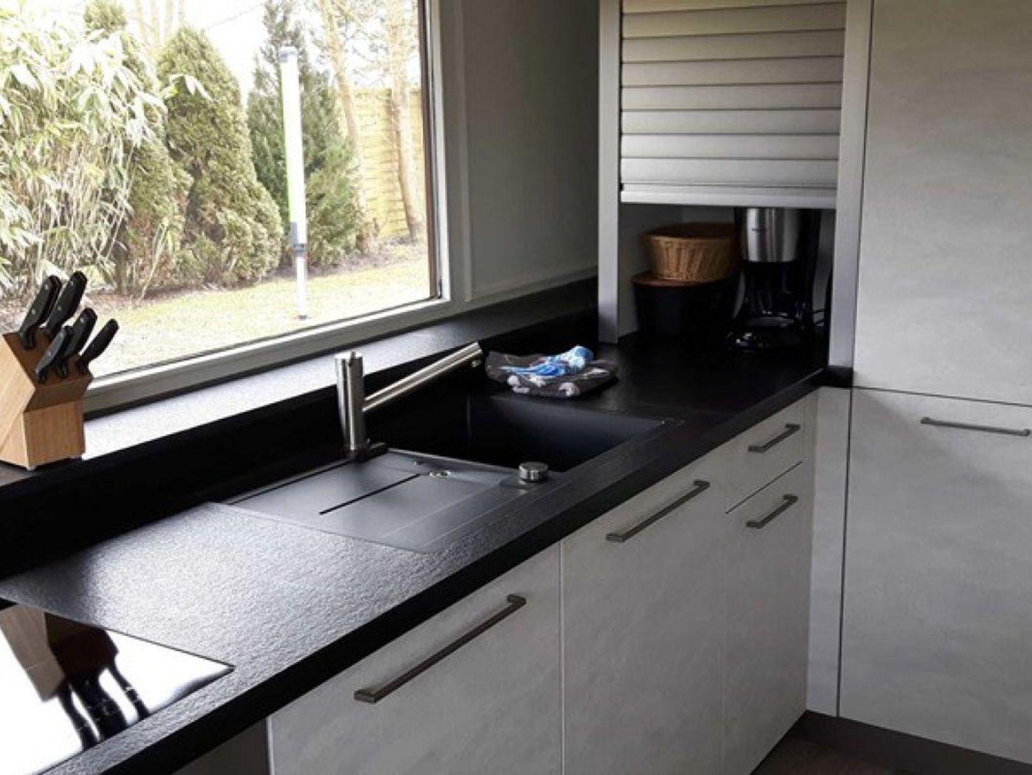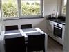 Induktionsherd mit vier Kochplatten, elektrischer Wasserkocher, Kaffeefiltermaschine, Toaster, Mixer, Handrührgerät etc.) plus Esstisch für bis zu sechs Personen.
