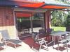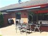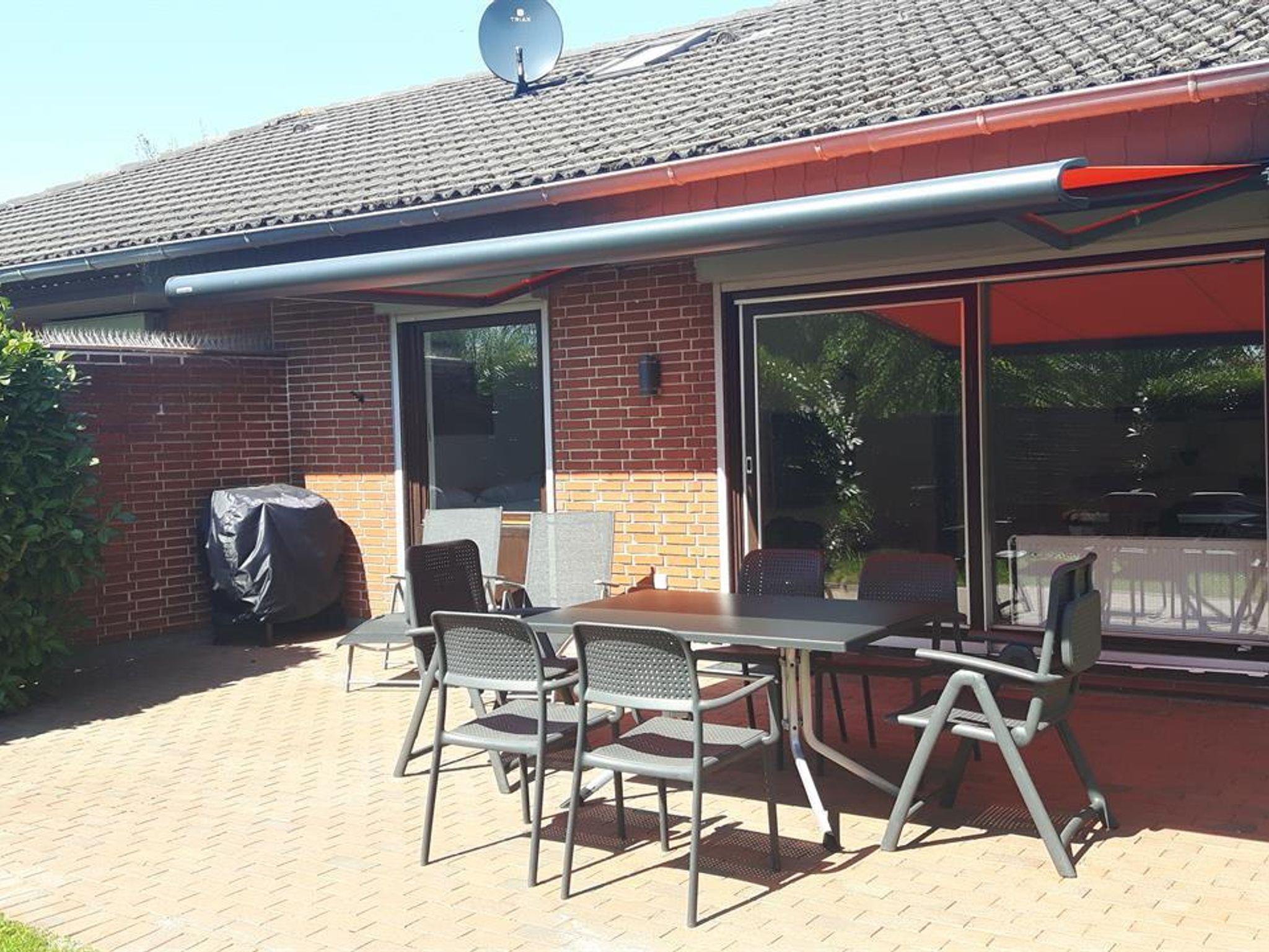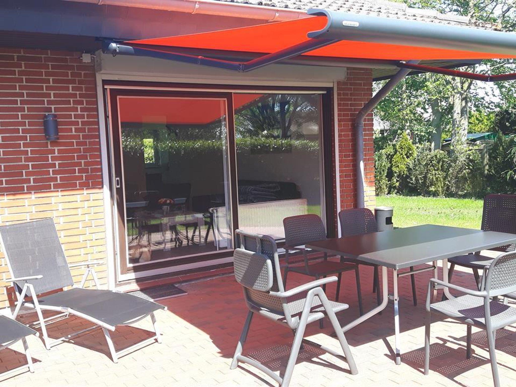 Terrasse mit Markise, Tisch und sechs Stühlen, zwei Liegen sowie Holzkohlegrill stehen zur Haupt- und Nebensaison (April bis Oktober) bereit. NEU ab 03/2025: Mini-Außensauna für eine Person liegend und bis zu drei Personen sitzend!