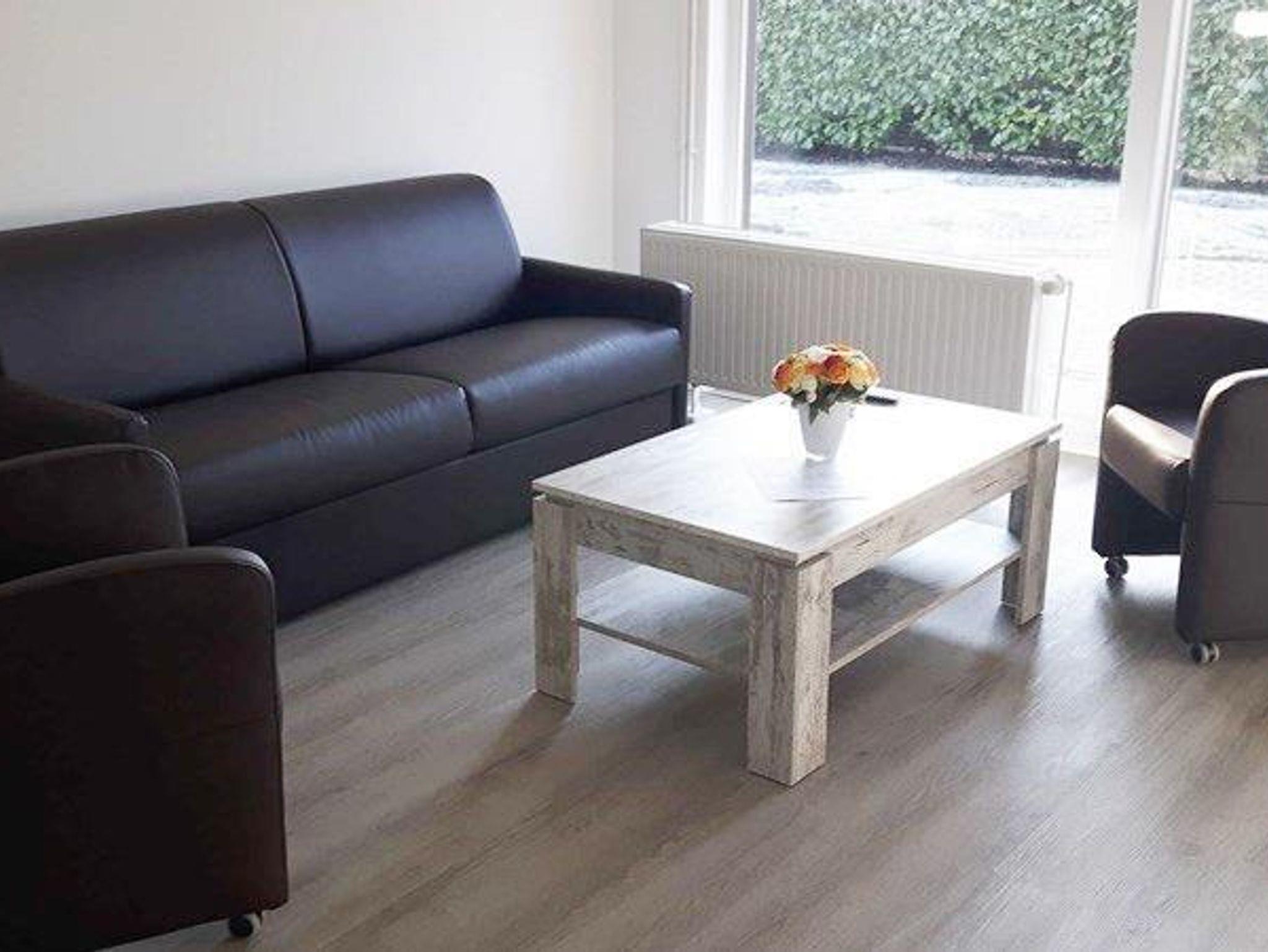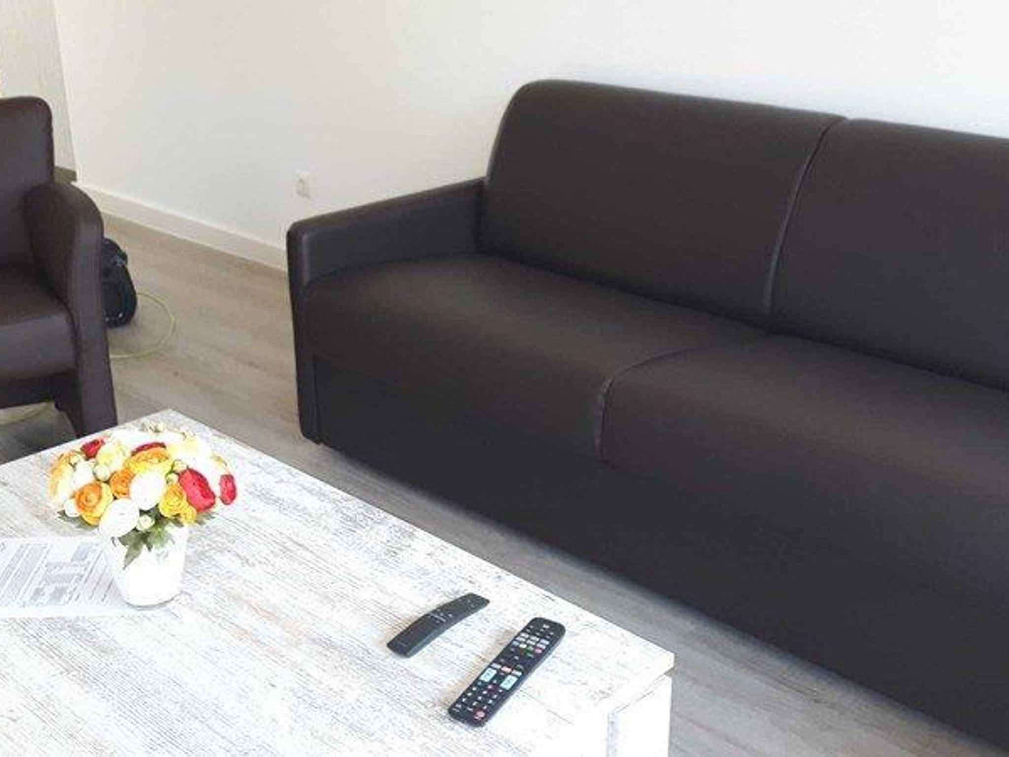 Wohnzimmer mit einem Dauerschlafsofa (mit innenliegender Matratze von 160x200cm). Flat-TV´s mit Satellitenanschluss im großen Schlafzimmer (43 Zoll) sowie im Wohnzimmer (55 Zoll).