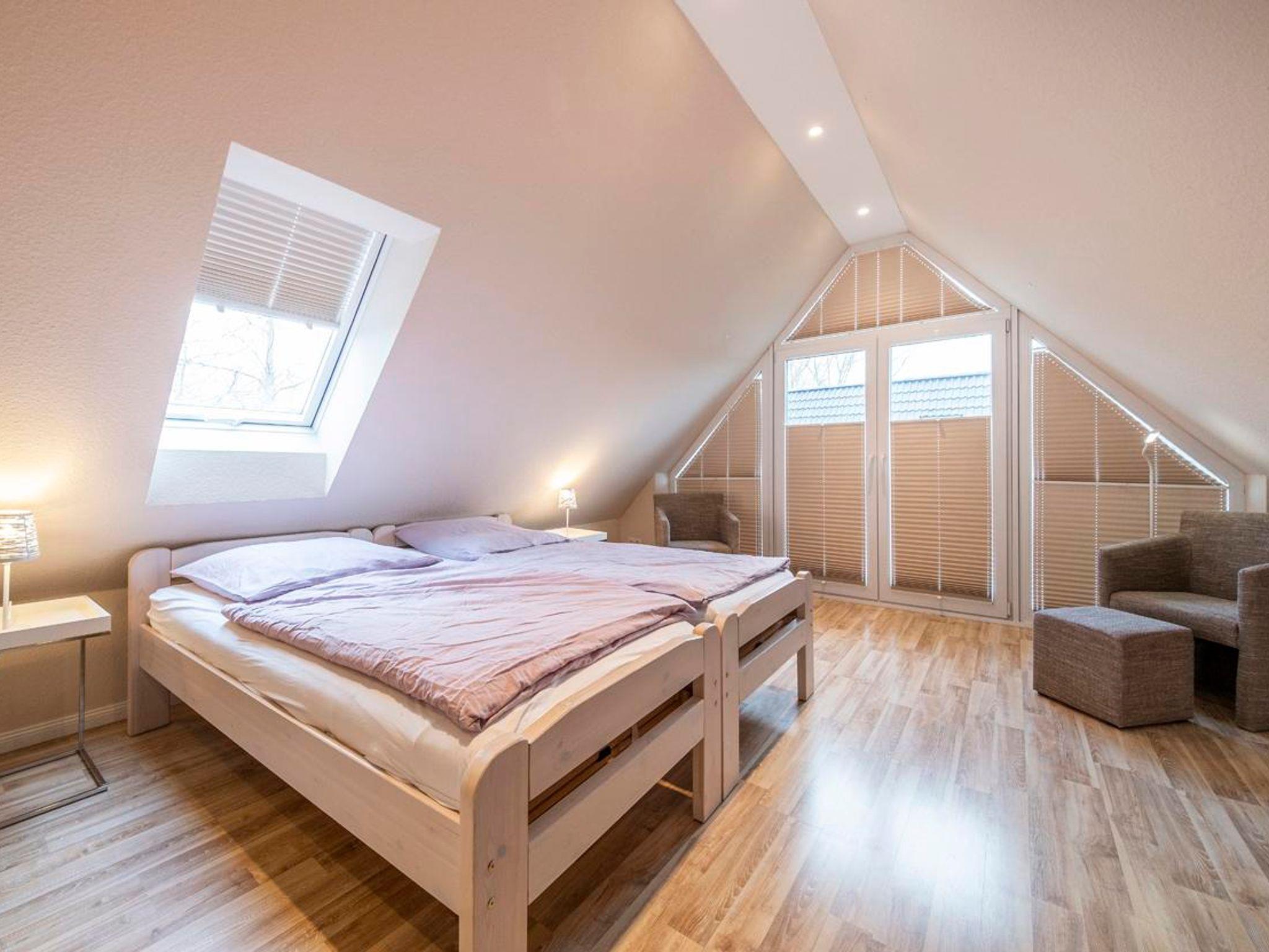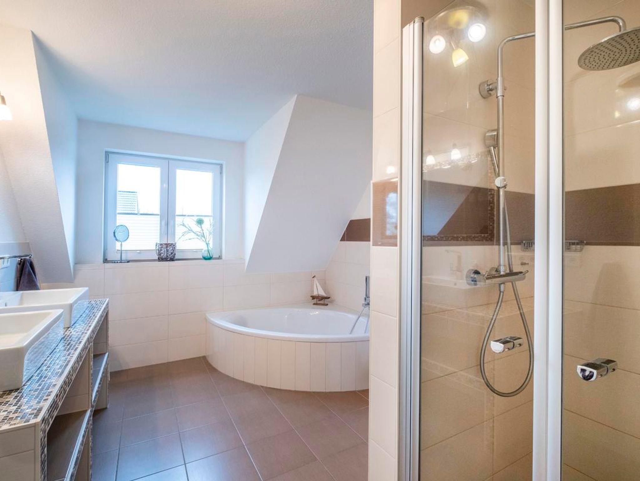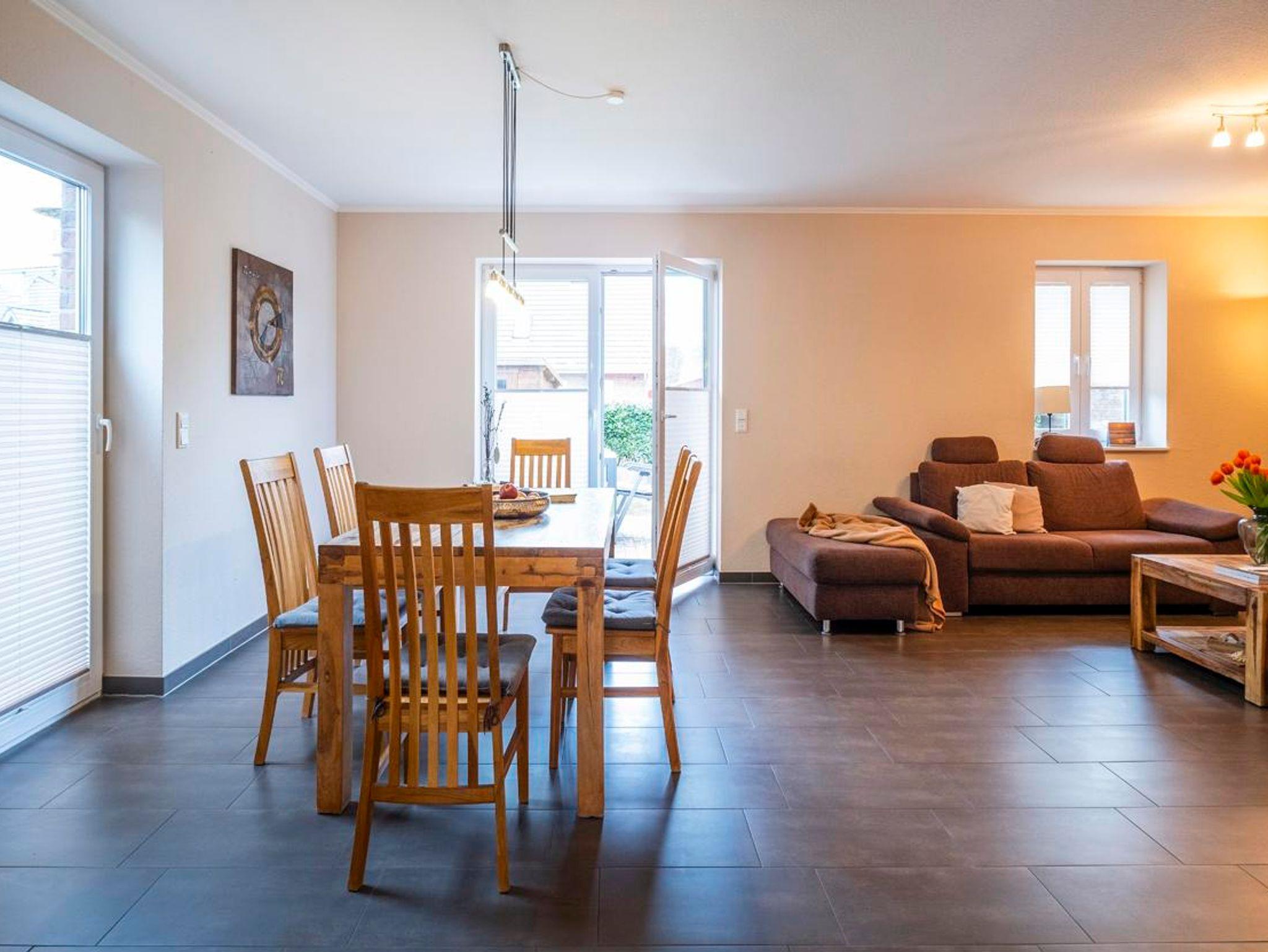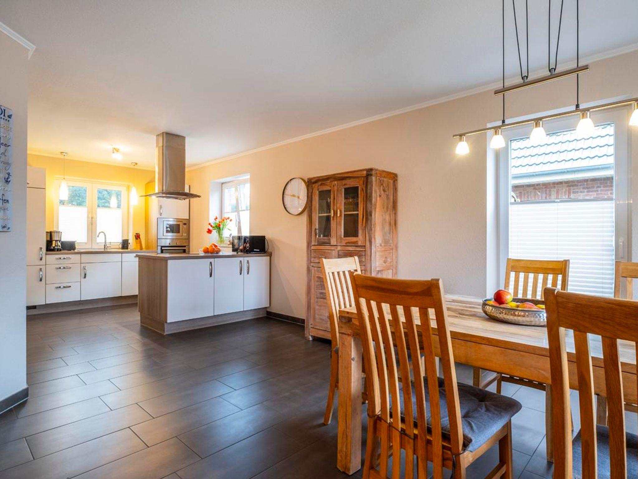 Im Erdgeschoss empfängt Sie ein großer Flur, der auch für notwendige Mitbringsel, wie z.B. einem Kinderwagen, gut Platz bietet. Die Garderobe ist großzügig ausgestattet. Im Hauswirtschaftsraum können Sie Ihre Utensilien, wie z. B. Wasser- oder Bierkasten unterstellen. Vom Flur aus erreichen Sie auch das Gäste-WC. Das Wohn-/Esszimmer ist großzügig ausgelegt. Sie können es sich auf der Wohnlandschaft gemütlich machen und der Musik aus der Stereoanlage lauschen. Für den besonderen Genuss gehört ein Full-HD-Flachbildfernseher zur Ausstattung. Zum Esszimmerbereich gehört ein Massivholztisch mit Stühlen. Wie überall im Ferienhaus finden Sie auch hier ausreichend Platz für Ihre Utensilien. Weiterhin wartet ein Kaminofen für gemütliche Stunden auf Sie. Die moderne Einbauküche ist mit allem was man benötigt ausgestattet. Sie finden eine große Geschirrspülmaschine, ein Cerankochfeld, einen Backofen, einen Mikrowellenherd, Kühlschrank, Gefrierschrank, viel Geschirr und auch viel Raum für Ihre Vorräte. Im 1. Stock finden Sie 2 Bäder. Das größere Badezimmer ist zusätzlich mit einem 2. Waschtisch und Eckbadewanne ausgestattet. Dieses Bad verfügt über ein Außenfenster in der Dachgaube. Im 2. Bad ( Veluxfenster ) finden Sie neben der Dusche Waschmaschine und Trockner. Die 2 Schlafzimmer sind geräumig. Die Betten sind 2 x 2 m . Zur Einrichtung gehört ist ein großer Schrank, eine Kommode und jeweils 1 Flachbildfernseher.Im Obergeschoss befindet sich ein großzügiges lichtdurchflutetes Studio in dem man sich wunderbar zurückziehen kann, mit 2 Einzelbetten und gemütlicher Sitzecke.