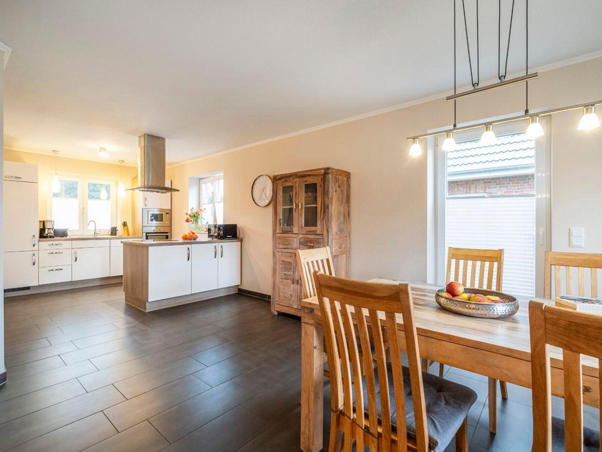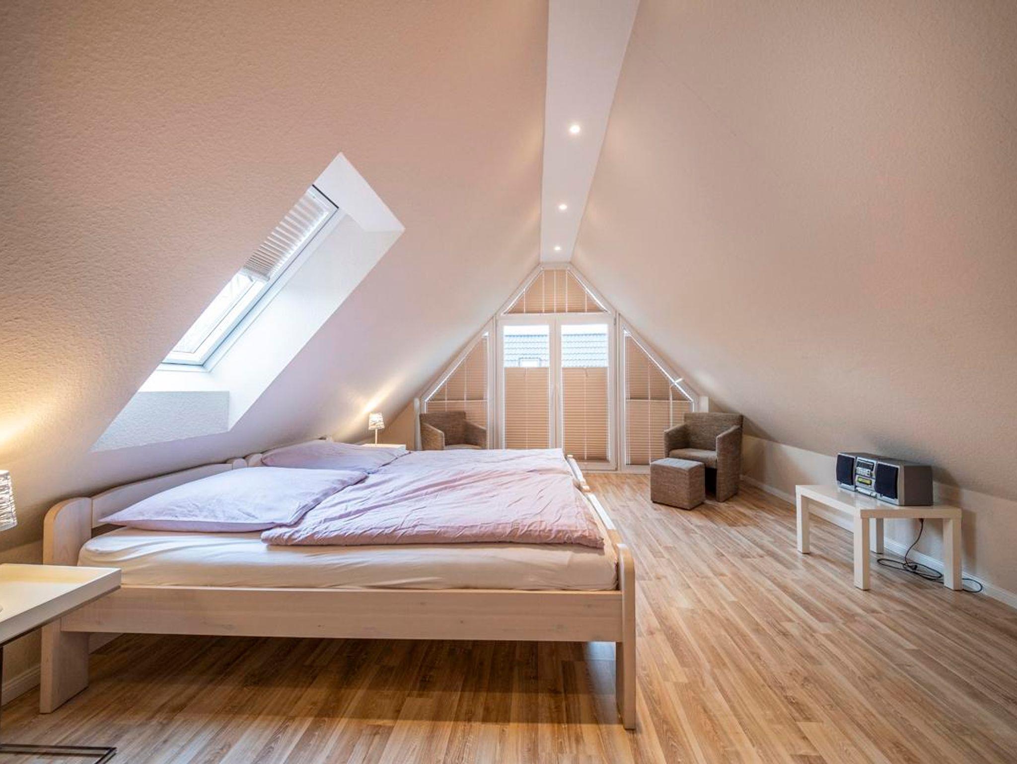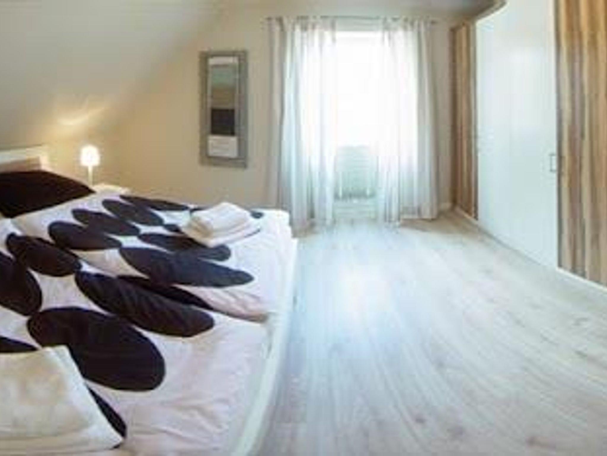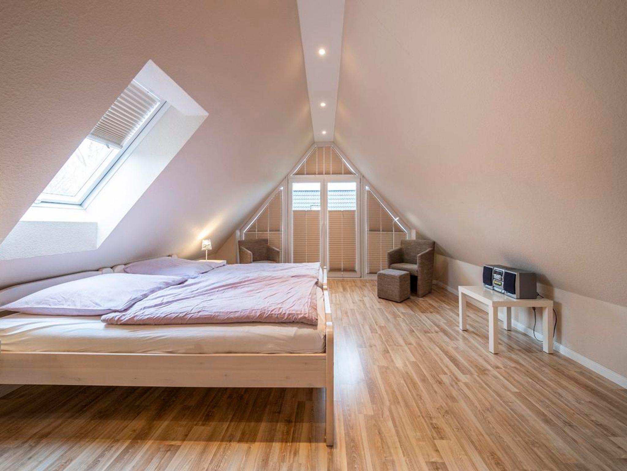 Im Erdgeschoss empfängt Sie ein großer Flur, der auch für notwendige Mitbringsel, wie z.B. einem Kinderwagen, gut Platz bietet. Die Garderobe ist großzügig ausgestattet. Im Hauswirtschaftsraum können Sie Ihre Utensilien, wie z. B. Wasser- oder Bierkasten unterstellen. Vom Flur aus erreichen Sie auch das Gäste-WC. Das Wohn-/Esszimmer ist großzügig ausgelegt. Sie können es sich auf der Wohnlandschaft gemütlich machen und der Musik aus der Stereoanlage lauschen. Für den besonderen Genuss gehört ein Full-HD-Flachbildfernseher zur Ausstattung. Zum Esszimmerbereich gehört ein Massivholztisch mit Stühlen. Wie überall im Ferienhaus finden Sie auch hier ausreichend Platz für Ihre Utensilien. Weiterhin wartet ein Kaminofen für gemütliche Stunden auf Sie. Die moderne Einbauküche ist mit allem was man benötigt ausgestattet. Sie finden eine große Geschirrspülmaschine, ein Cerankochfeld, einen Backofen, einen Mikrowellenherd, Kühlschrank, Gefrierschrank, viel Geschirr und auch viel Raum für Ihre Vorräte. Im 1. Stock finden Sie 2 Bäder. Das größere Badezimmer ist zusätzlich mit einem 2. Waschtisch und Eckbadewanne ausgestattet. Dieses Bad verfügt über ein Außenfenster in der Dachgaube. Im 2. Bad ( Veluxfenster ) finden Sie neben der Dusche Waschmaschine und Trockner. Die 2 Schlafzimmer sind geräumig. Die Betten sind 2 x 2 m . Zur Einrichtung gehört ist ein großer Schrank, eine Kommode und jeweils 1 Flachbildfernseher.Im Obergeschoss befindet sich ein großzügiges lichtdurchflutetes Studio in dem man sich wunderbar zurückziehen kann, mit 2 Einzelbetten und gemütlicher Sitzecke.