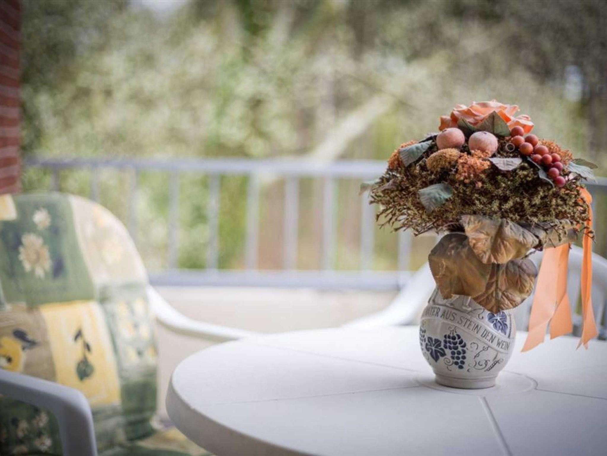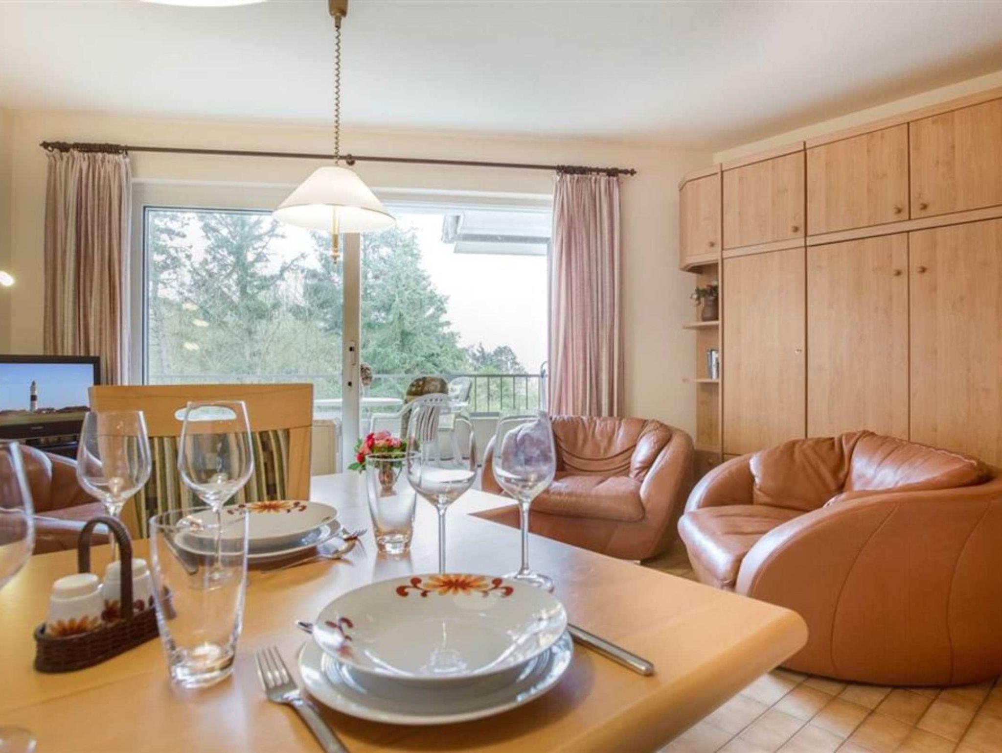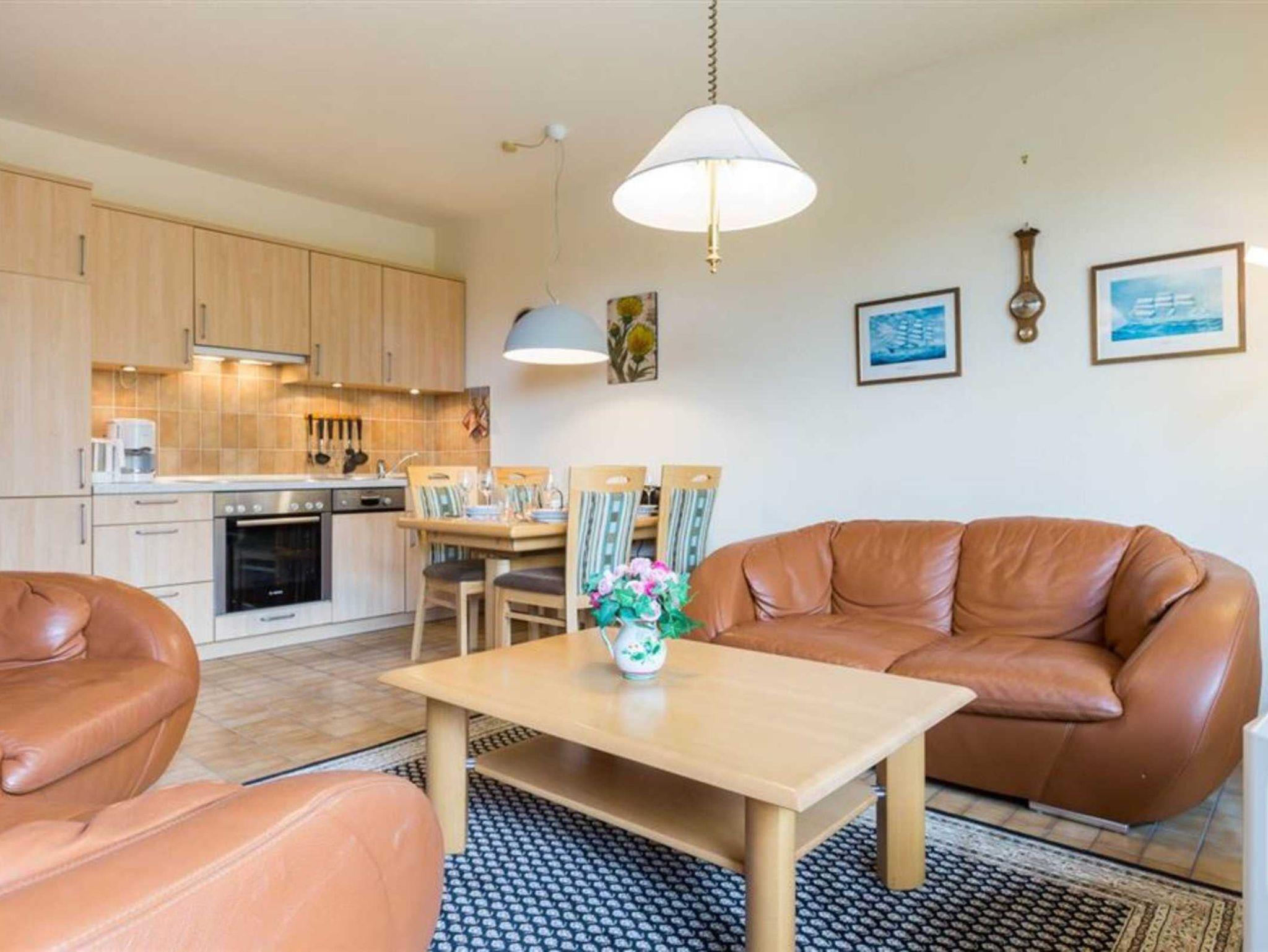 Wohn-/Schlafzimmer mit ausklappbarem Schrank-Einzelbett (90x200cm), Sofa für 2 Personen, 2 Sesseln, TV (Sat), Radio und Esstisch mit 4 Stühlen. Direkter Zugang zum möblierten Südbalkon mit Meeresblick. Offene Küche mit Backofen, Geschirrspüler und Kühlschrank mit Gefrierfach. Keine Mikrowelle.