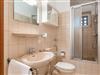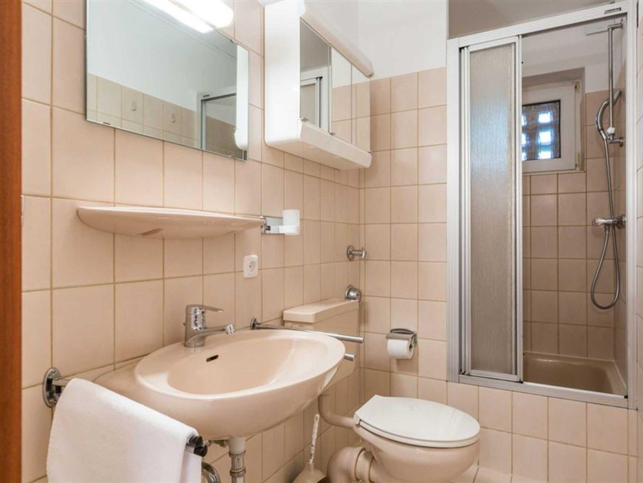 Badezimmer (Duschbad) mit Dusche (Eintritt: ca. 45cm), WC, kleinem Aussenfenster und Föhn.