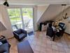Wohnzimmer: Couch, Couchtisch, 2 Sessel, Nachtspeicherofen, Esstisch, 4 Stühle, Regalschrank, TV-Schrank, Sat-TV, Küchenzeile mit 4 Platten-Cerankochfeld,