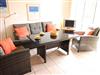 Im Wohnbereich erwartet Sie eine moderne Rattan-Couchgarnitur mit Sattelitenfernsehen und Ausblick aus dem Panoramafenster mit zwei großen Flügeltüren. Durch die Südwest-Ausrichtung können Sie Sonnenuntergänge richtig genießen.