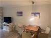 Wohnzimmer: moderne Ausstattung, Couch mit Ottomane, Couchtisch, Leselampe, 2 Stehlampen, großer Flachbild-TV, moderne Musikanlage, Eßtisch mit drei Korbsesseln, Küchenzeile, 2 Platten Ceranfeld, Minibackofen, Dunstabzugshaube, Kühlschrank mit Gefrierfach, Geschirrspülmaschine, Kaffeemaschine, Wasserkocher, Toaster, Geschirr, Kochtöpfe
