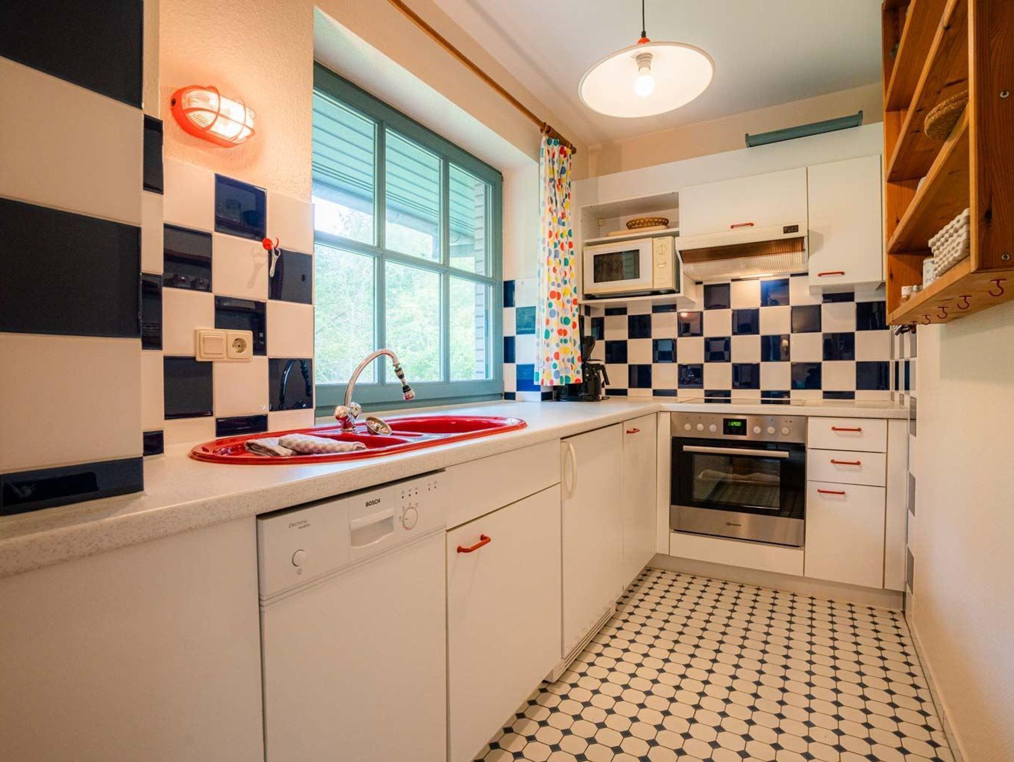 Separate Küche mit Backofen, Mikrowelle, Geschirrspüler und Kühlschrank mit Gefrierfach.