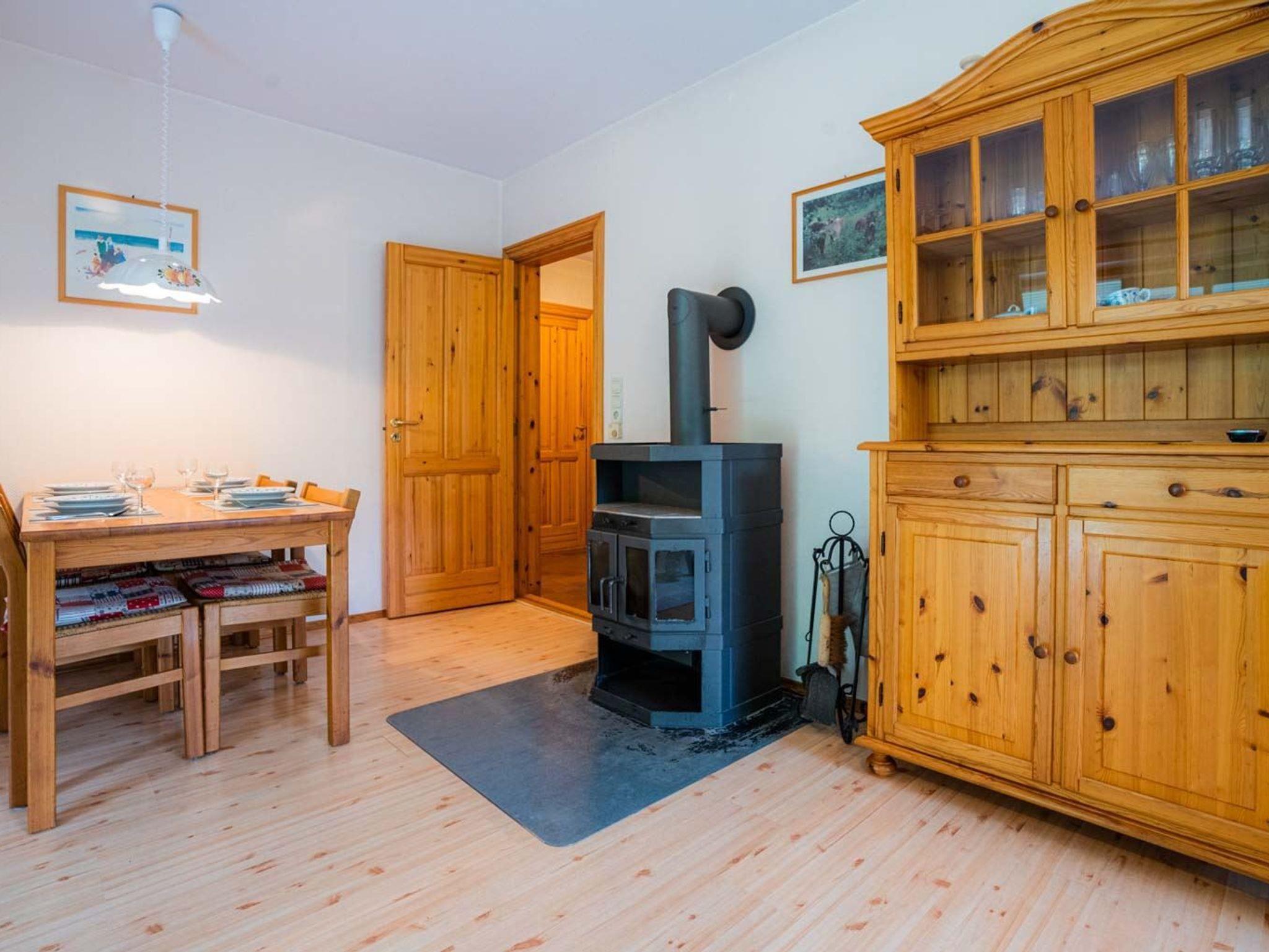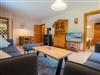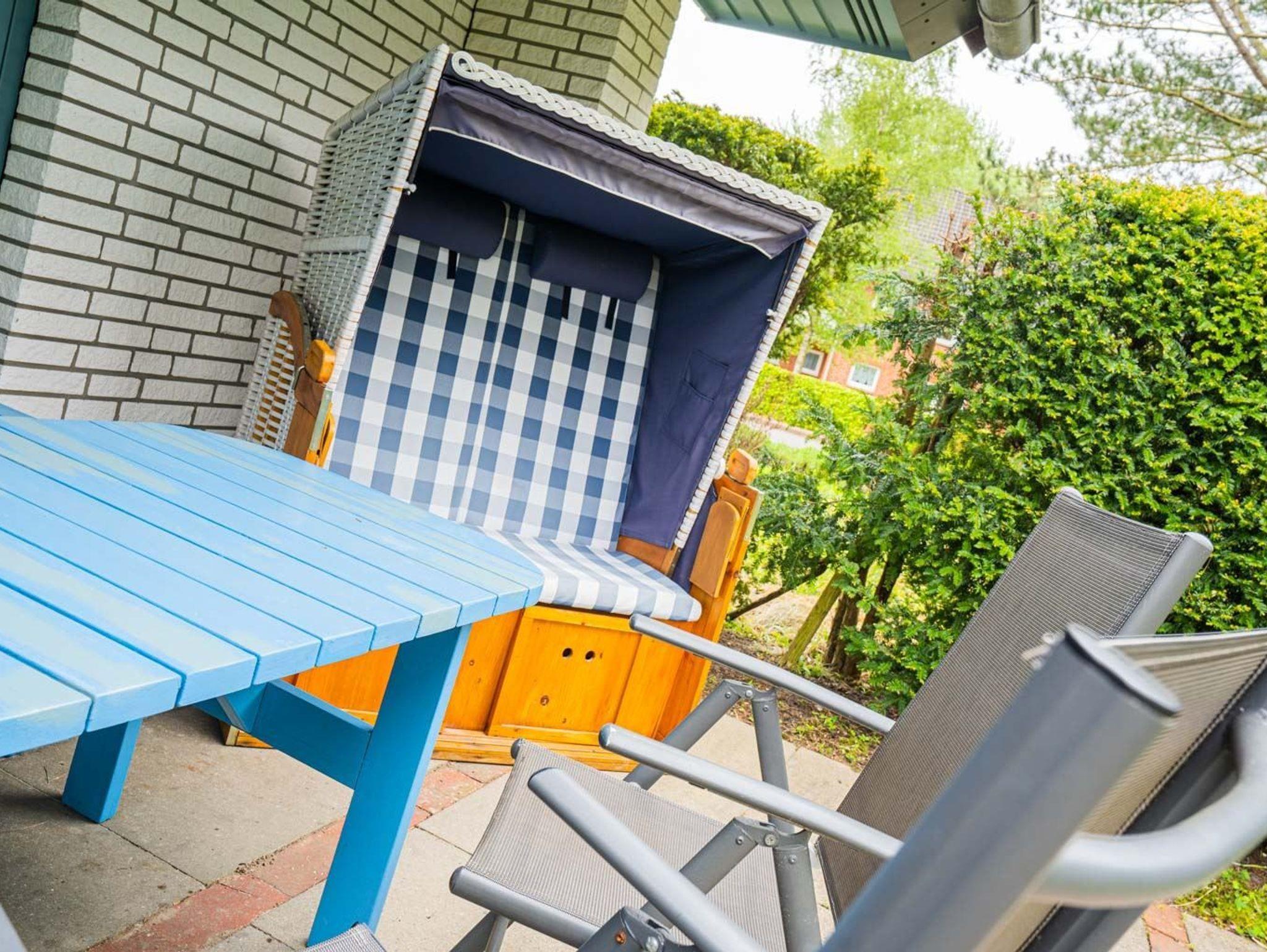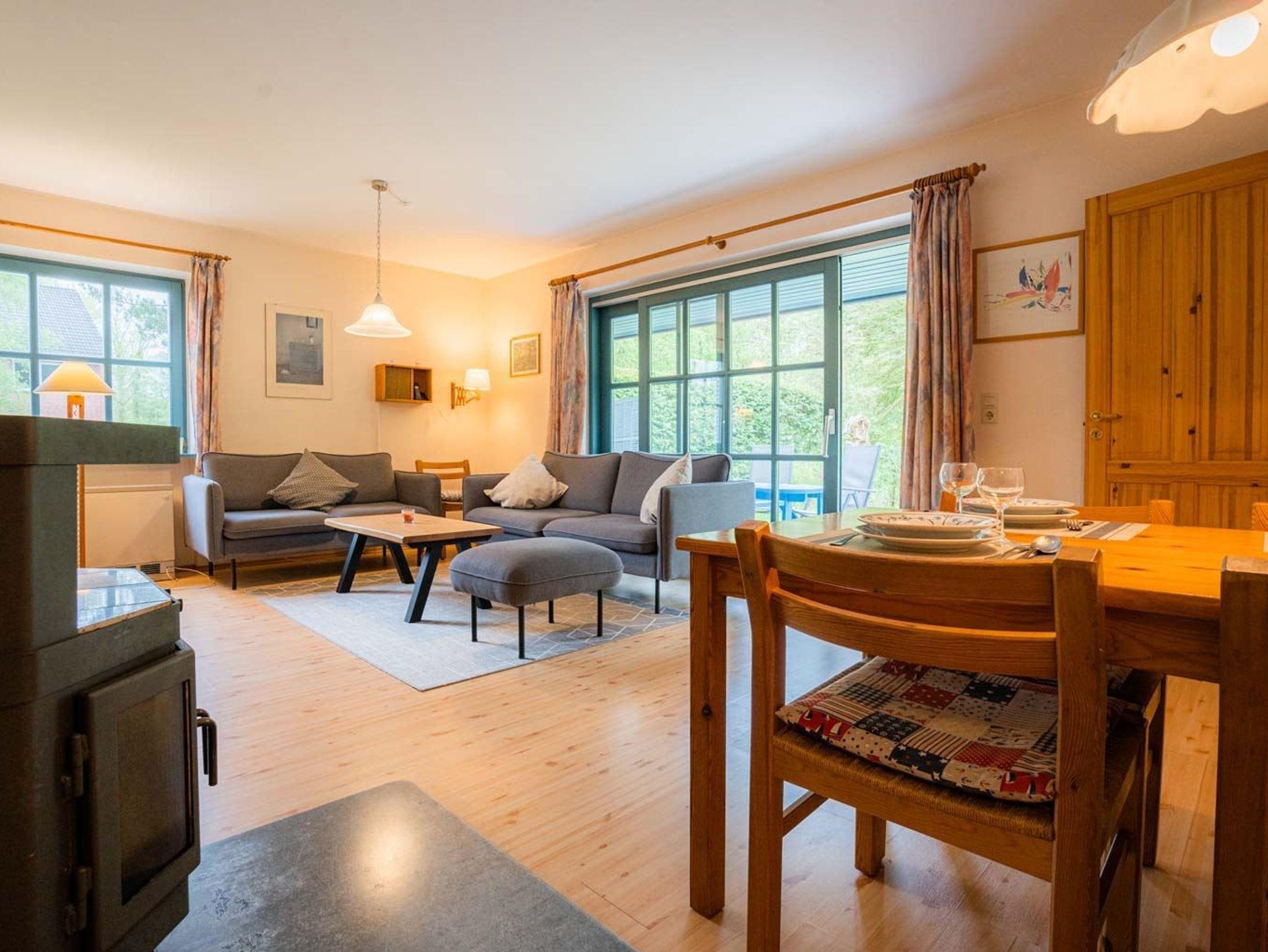 Wohnzimmer mit zwei Sofas (3er und 2er) und einem Sessel, TV (Kabel), Radio mit CD-Player, behaglichem Kaminofen und Esstisch mit 4 Stühlen. Direkter Zugang zur möblierten und windgeschützten Gartenterrasse nach Süden mit Strandkorb.
