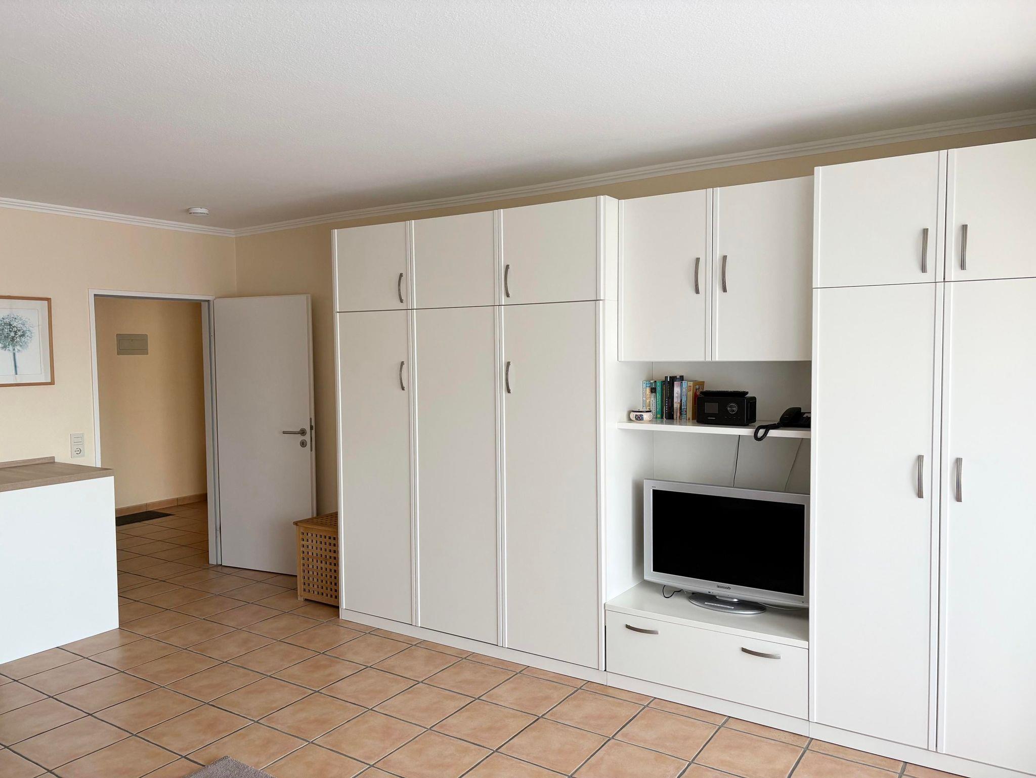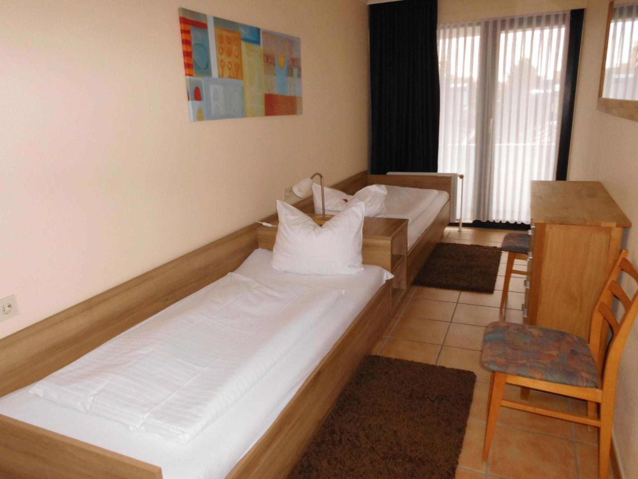 Schlafraum mit 2 Einzelbetten, Wohn-Schlafraum mit 2 Wandschrankbetten, Fußboden gefliest, Sitzecke, Essecke, Küchenzeile mit Mikrowelle, Dusche/WC, Durchwahltelefon, Kabel-TV, Balkon, PKW-Platz-Nr.47, Aufzug und Fahrradkeller.