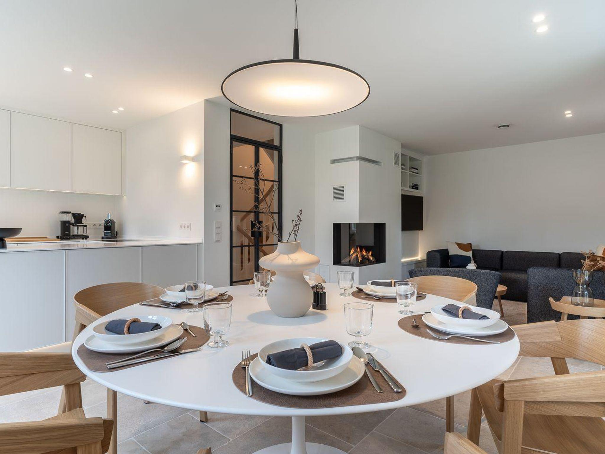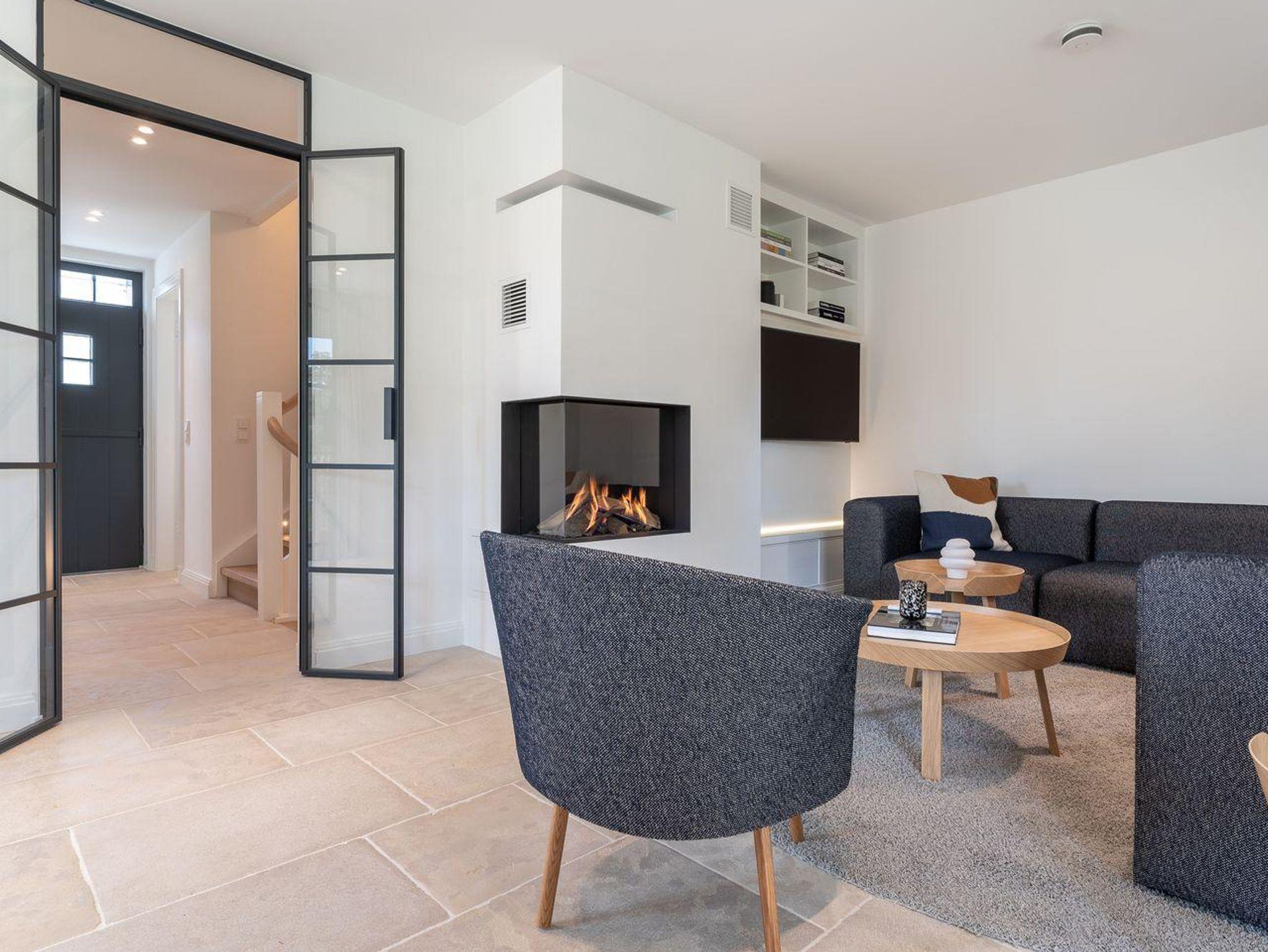 Im Erdgeschoss erwartet Sie ein lichtdurchflutetes Wohnzimmer mit Gaskamin und TV, eine offene Küche sowie ein gemütliches Esszimmer. Die Küche verfügt über hochwertige Elektrogeräte und genügend Platz zum gemeinsamen Kochen. An den Wohnbereich schließt sich ein Flur sowie ein Gäste-WC an.