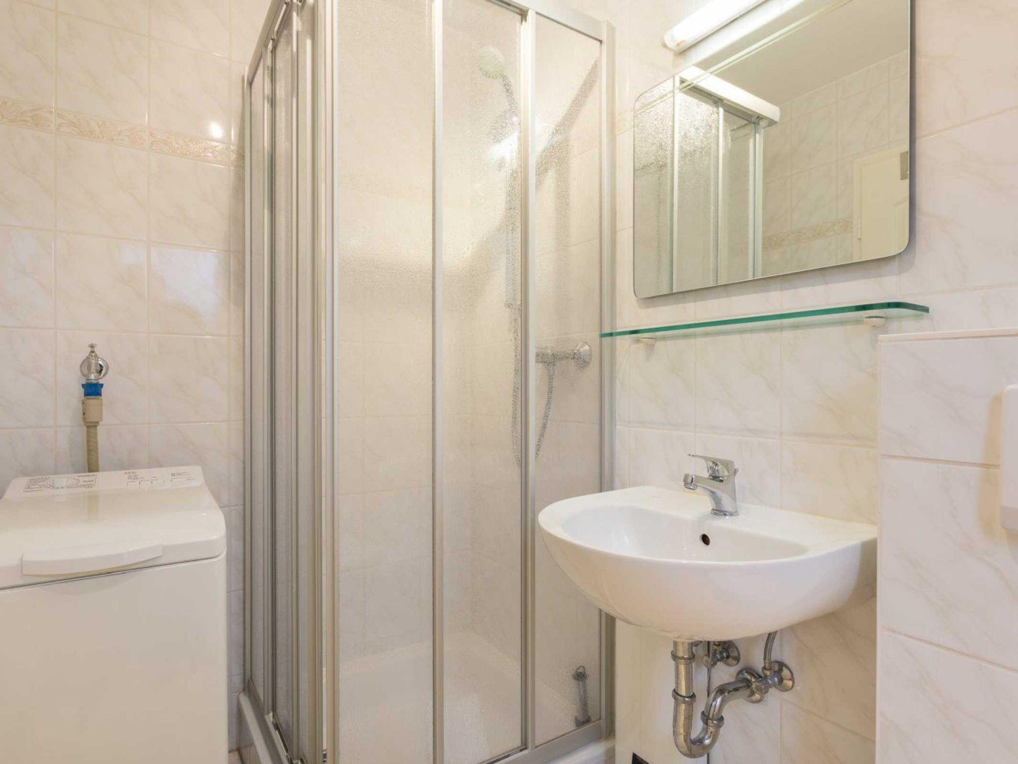 Badezimmer (Duschbad) mit Dusche, WC, Waschmaschine (Toploader), Handtuchwärmer, Tageslicht und Föhn.