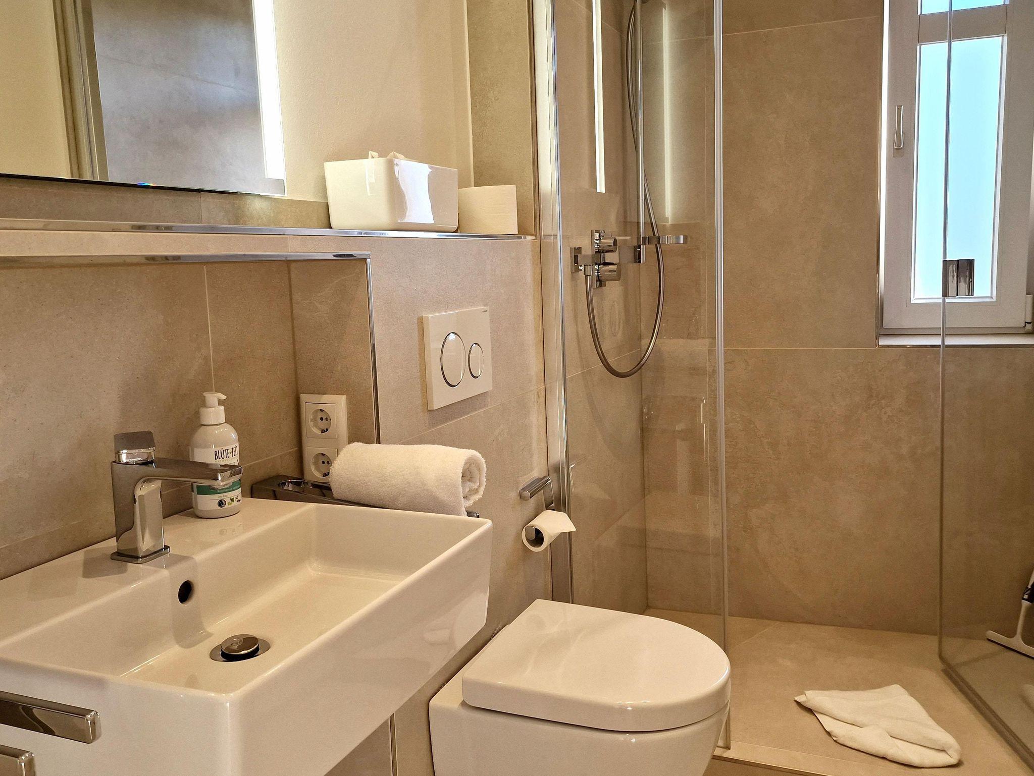 Bad: Dusche, Waschbecken, WC, Duschkabine, Spiegelschrank, Handtuchhalter, Schrank, E-Heizung