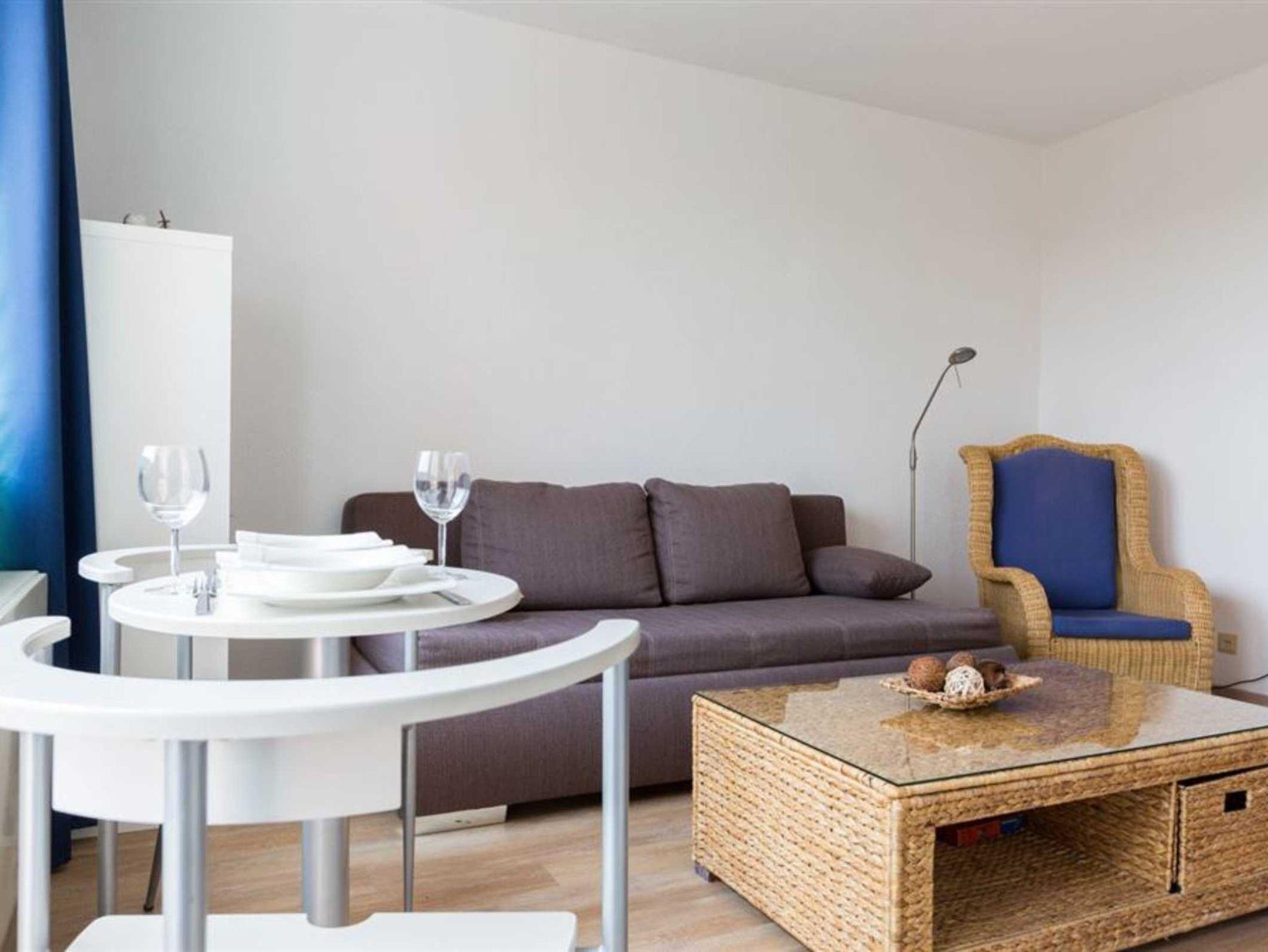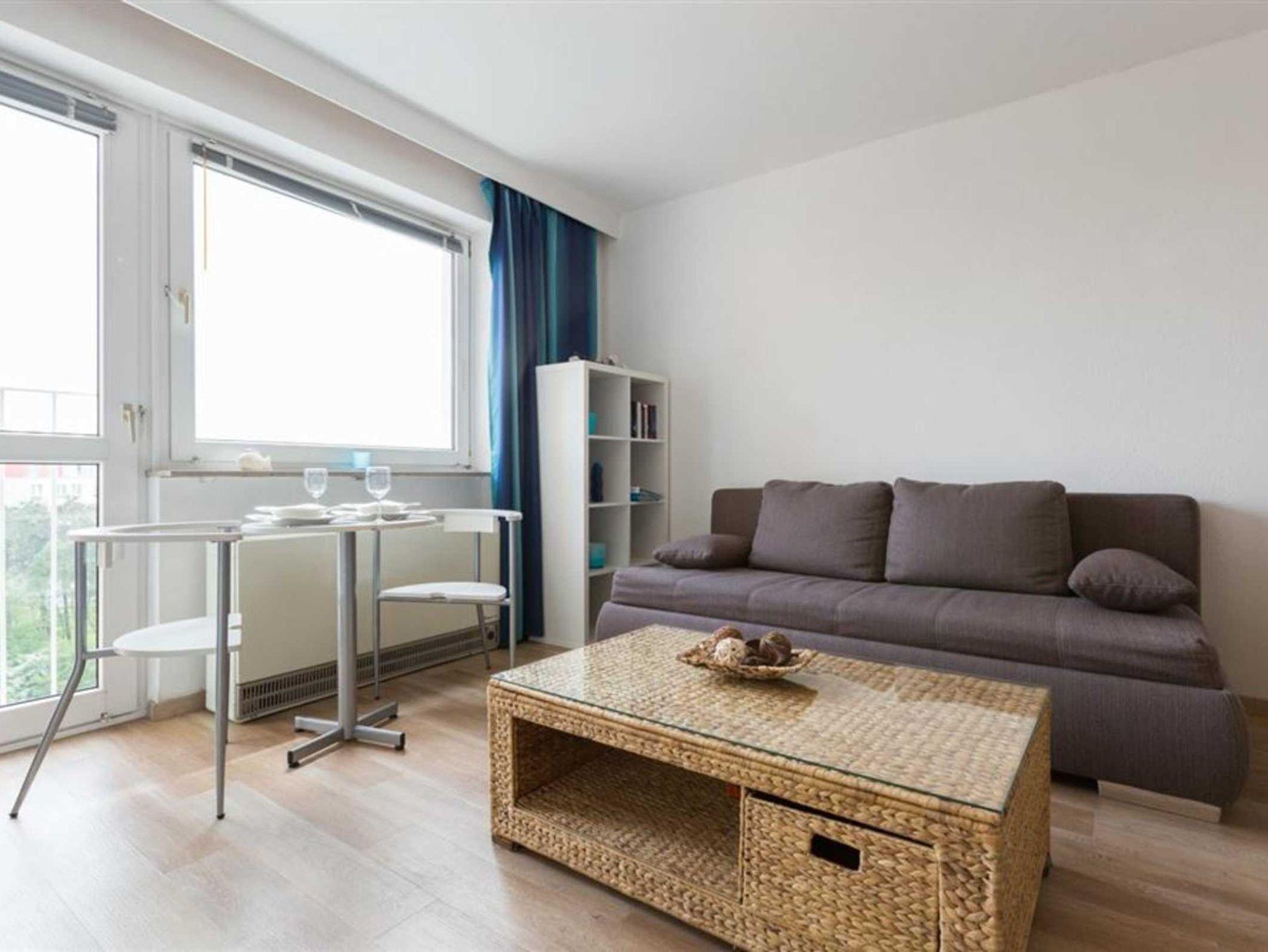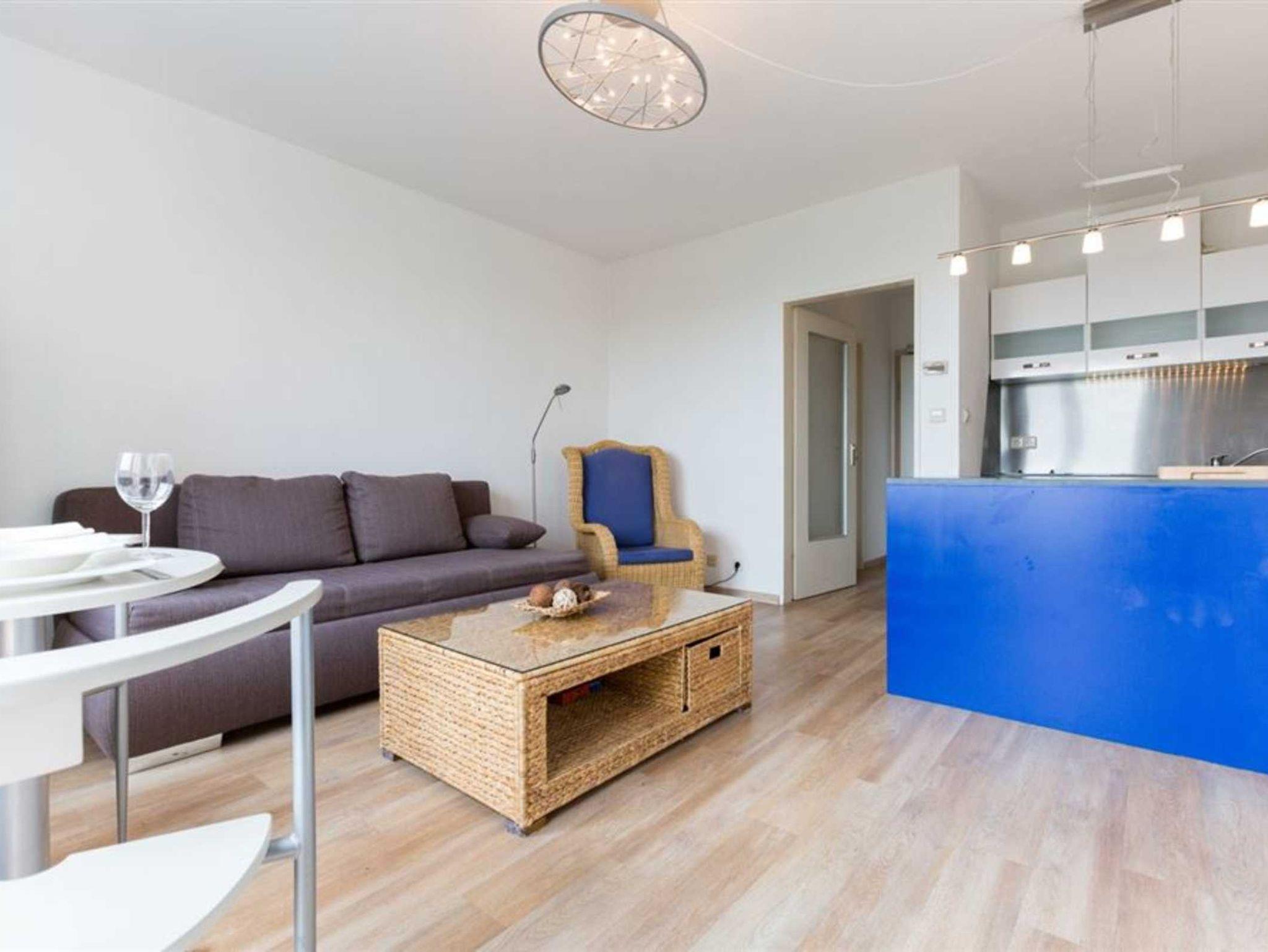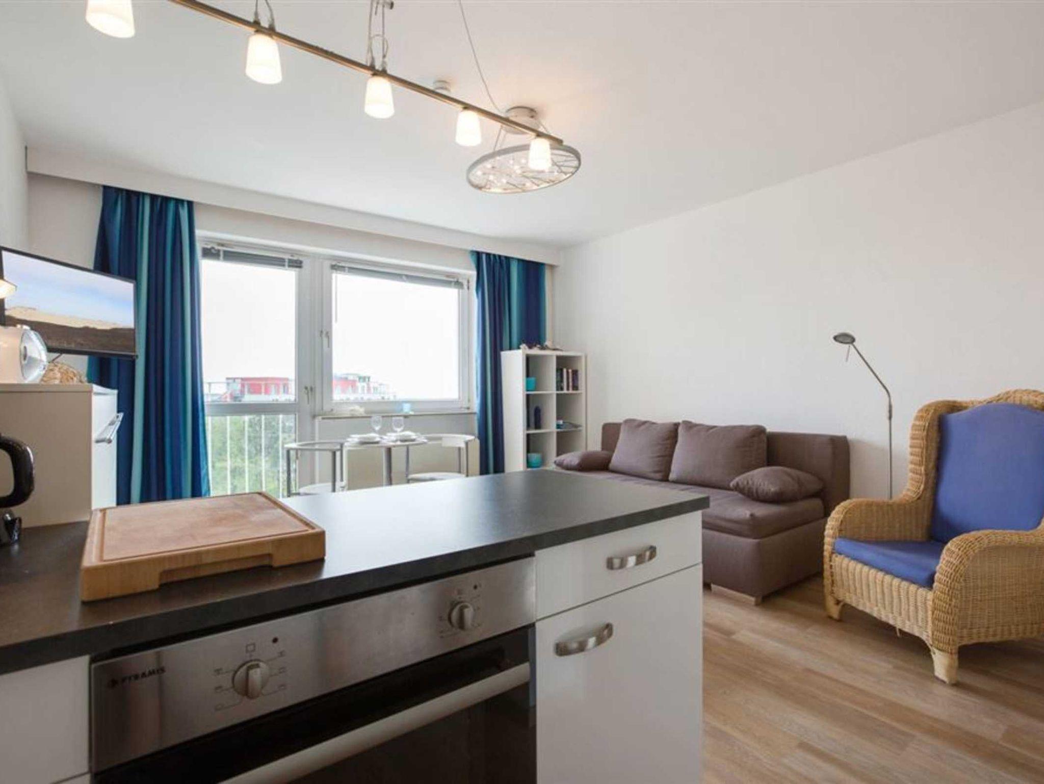 Wohn- und Schlafzimmer mit ausziehbarem Schlafsofa (160x190cm), ausklappbarem Schrank-Einzelbett (90x200cm), Korbsessel, Esstisch mit 2 Stühlen, TV (Sat) und Radio. Französischer Balkon. Offene Küche mit 2 Ceran-Kochstellen, Backofen, Mikrowelle, Geschirrspüler und Kühlschrank mit Gefrierfach.