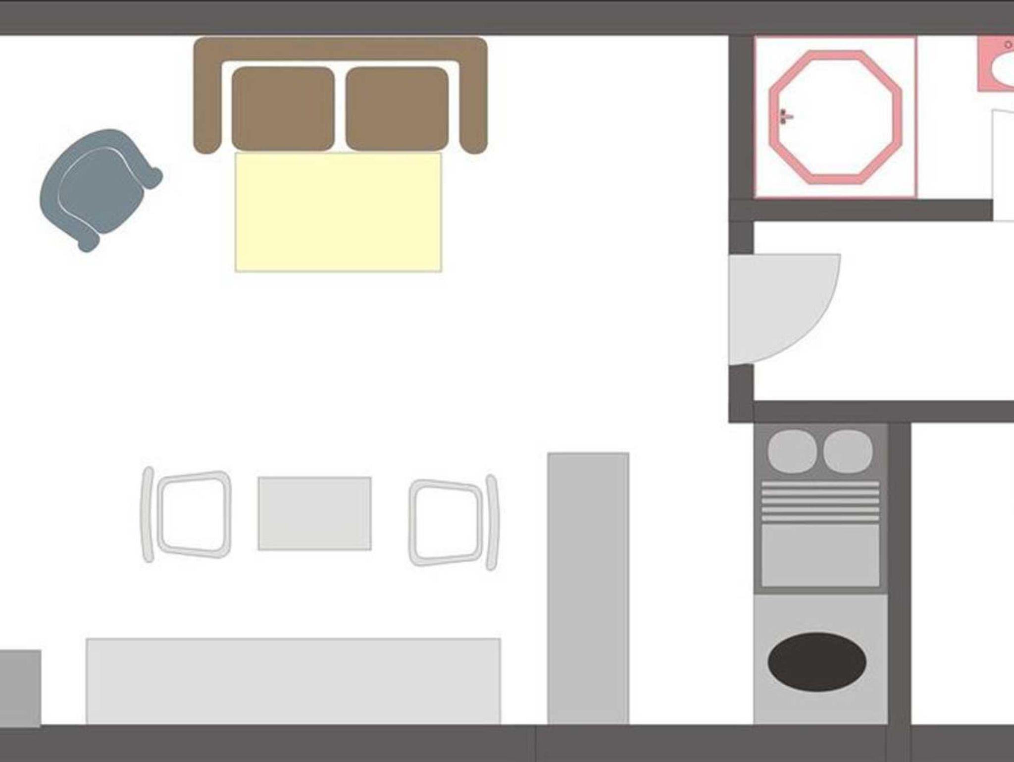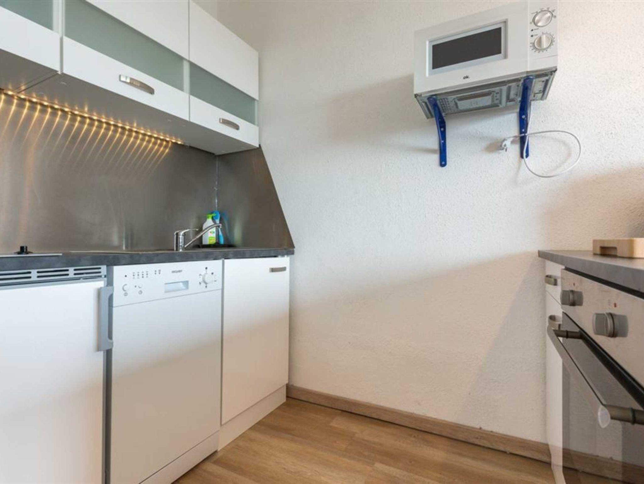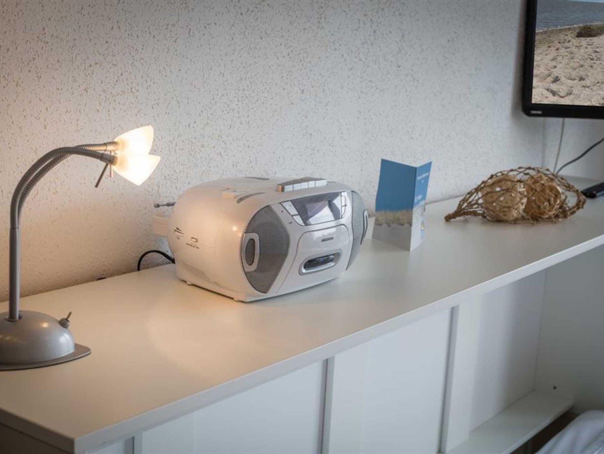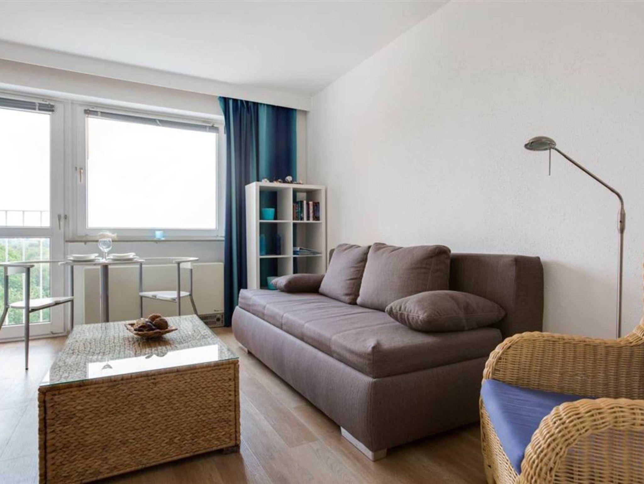 Wohn- und Schlafzimmer mit ausziehbarem Schlafsofa (160x190cm), ausklappbarem Schrank-Einzelbett (90x200cm), Korbsessel, Esstisch mit 2 Stühlen, TV (Sat) und Radio. Französischer Balkon. Offene Küche mit 2 Ceran-Kochstellen, Backofen, Mikrowelle, Geschirrspüler und Kühlschrank mit Gefrierfach.