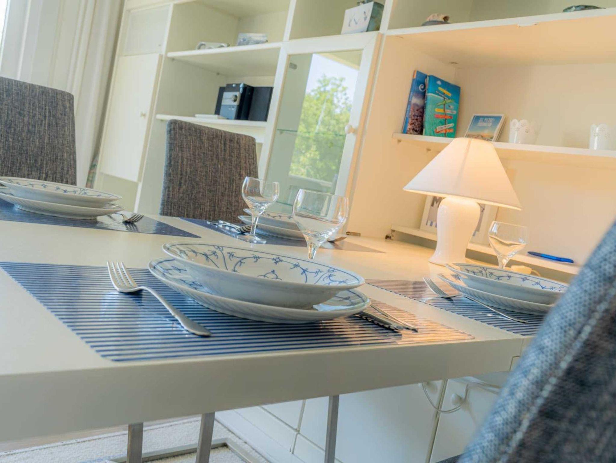 Wohn-/Schlafzimmer mit ausziehbarem Schlafsofa (160x200cm), Einbauschrank, einem Sessel, großem TV (Sat), Stereo-Kompaktanlage und Esstisch mit 4 Stühlen. Direkter Zugang zum überdachten und möblierten Balkon nach Südosten mit Blick auf den Garten und das Wäldchen. Offene Küche mit Backofen und Kühlschrank mit Gefrierfach. Die Küche ist durch einen Tresen vom Wohnzimmer abgeteilt.