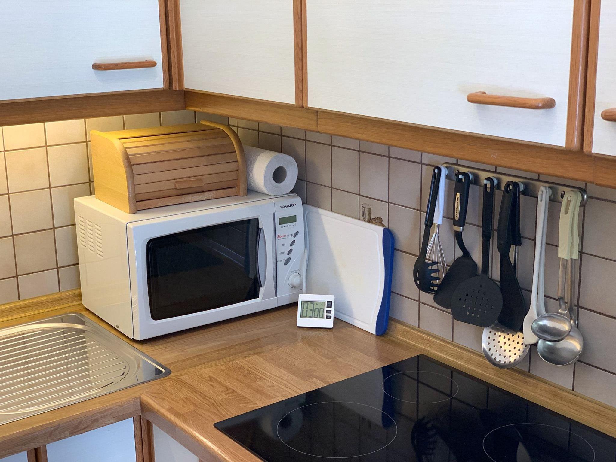 KücheEinbauküche, 4 Platten-Ceranfeld, Spülmaschine, Dunstabzugshaube, Kühlschrank, Mikrowelle, Kaffeemaschine, Wasserkocher, Eierkocher, Toaster, Brotmaschine, Geschirr, Kochtöpfe
