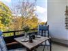 Schlafzimmer mit Doppelbett (2x 90x200cm), Kleiderschrank, Kommode und Stuhl. Direkter Zugang zum möblierten, überdachten Balkon nach Nordosten mit Blick auf den Garten.