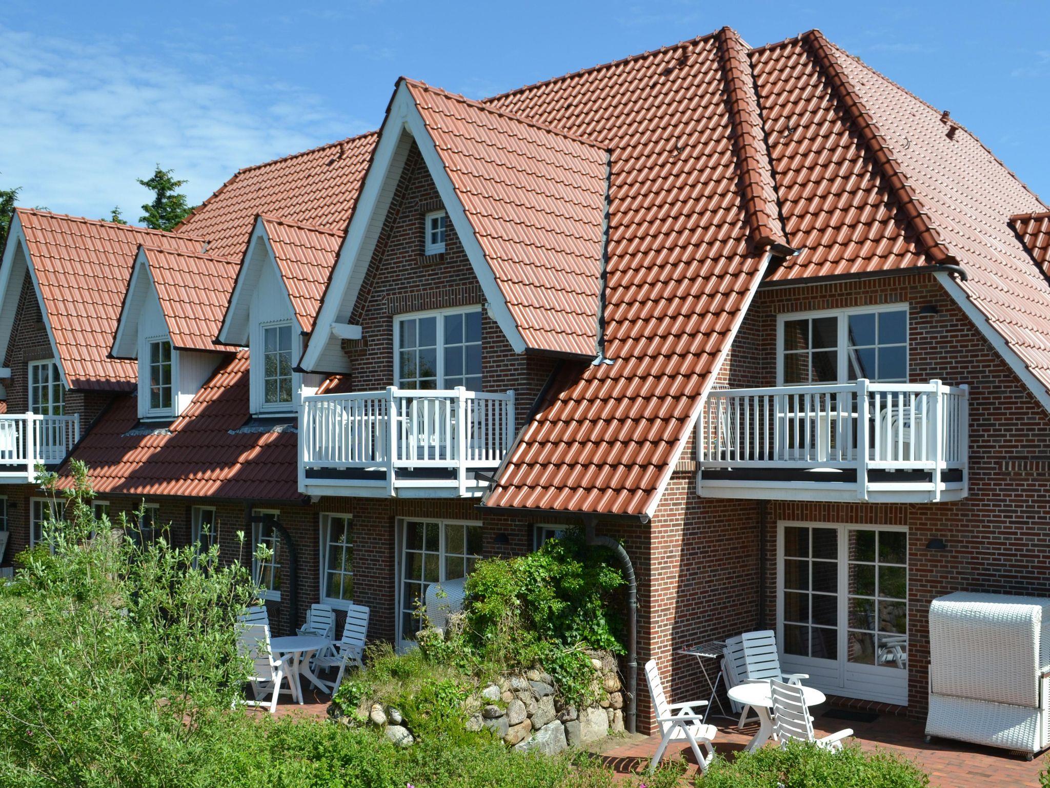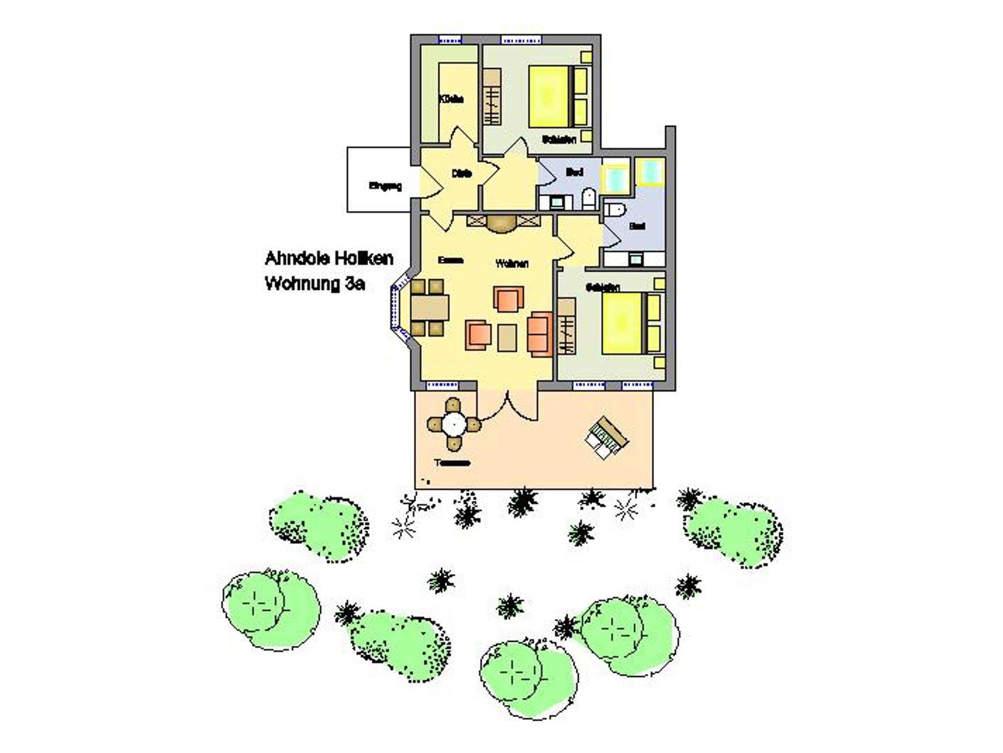 Eingangsdiele mit Garderobe, großzügiger Wohn-Essbereich mit direktem Zugang auf eine große, durch Friesenwälle und Gehölze abgeschirmte Terrasse in Westlage mit Gartenmöbeln und einem Strandkorb, zwei Schlafzimmer mit Doppelbetten, zwei Duschbäder/WC, separate Küche. Im Untergeschoss des mittleren Einganges befindet sich eine Gemeinschaftssauna mit Ruheraum, verschiedene Duschen, Fußbäder, WC. Umkleideraum, Solarium, Fitnessraum, Tischtennis. Im Außenbereich befindet sich ein Spielplatz für die Kleinsten, Stellplatz, Fahrradständer und ein wunderschön angelegtes Gartengelände umsäumt von Grünland.