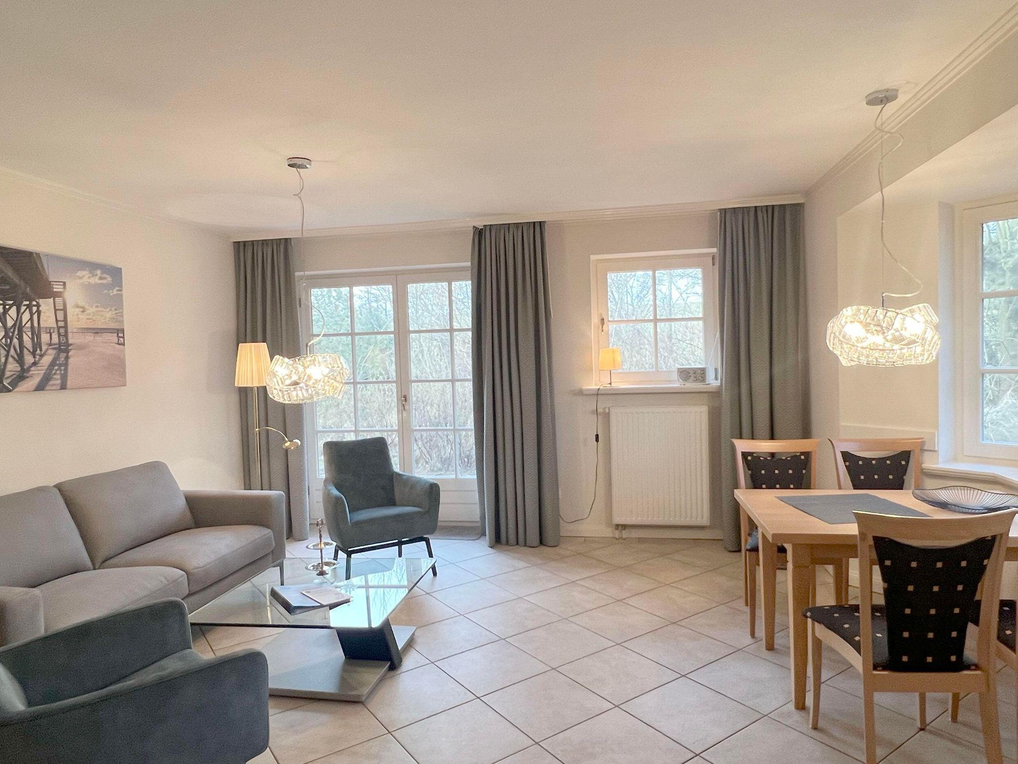 Eingangsdiele mit Garderobe, großzügiger Wohn-Essbereich mit direktem Zugang auf eine große, durch Friesenwälle und Gehölze abgeschirmte Terrasse in Westlage mit Gartenmöbeln und einem Strandkorb, zwei Schlafzimmer mit Doppelbetten, zwei Duschbäder/WC, separate Küche. Im Untergeschoss befindet sich eine Gemeinschaftssauna mit Ruheraum, verschiedenen Duschen, Fußbäder, WC. Umkleideraum, Solarium, Fitnessraum, Tischtennis. Im Außenbereich befindet sich ein Spielplatz für die Kleinsten, Stellplatz, Fahrradständer und ein wunderschön angelegtes Gartengelände umsäumt von Grünland.