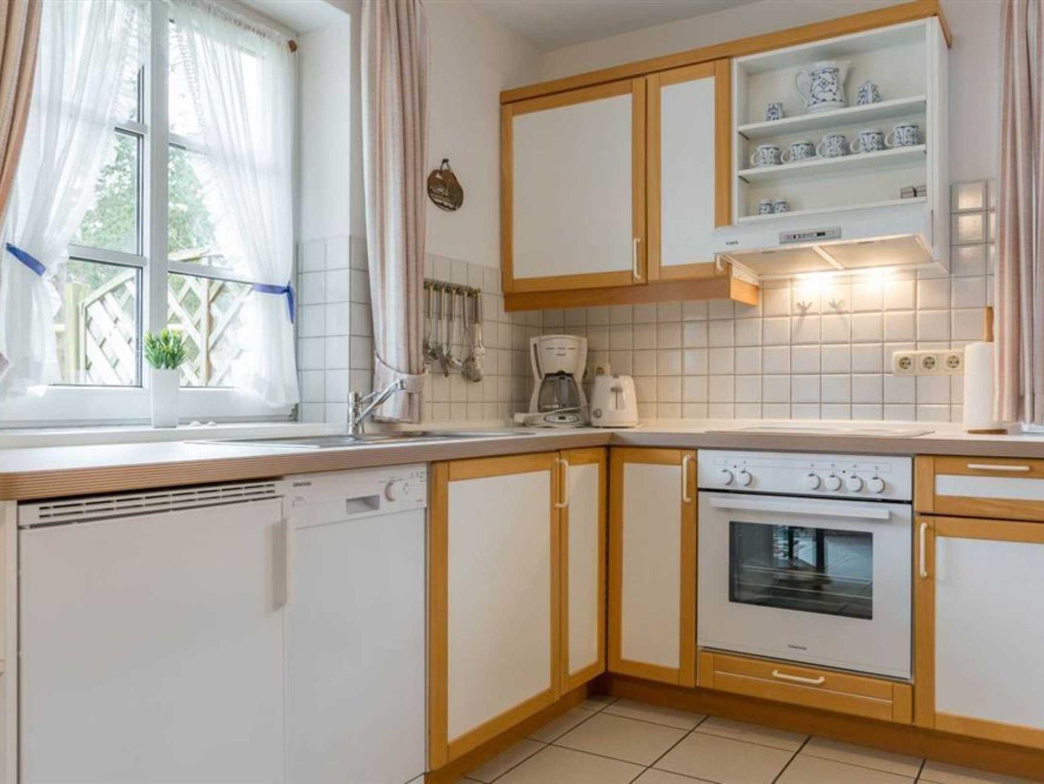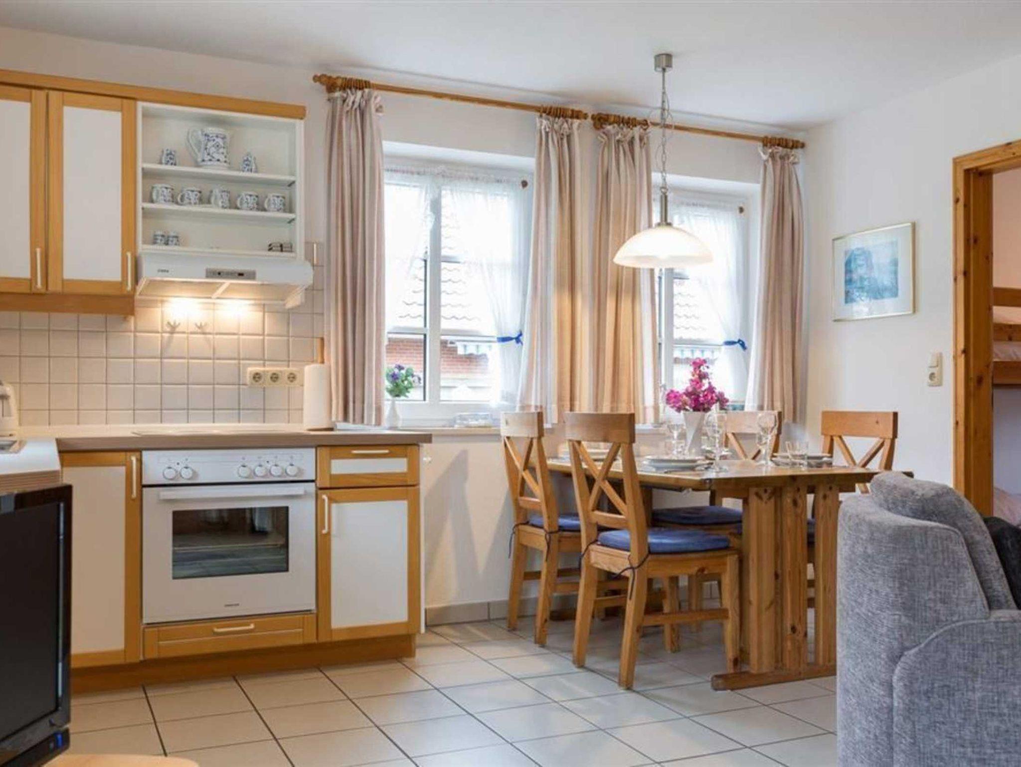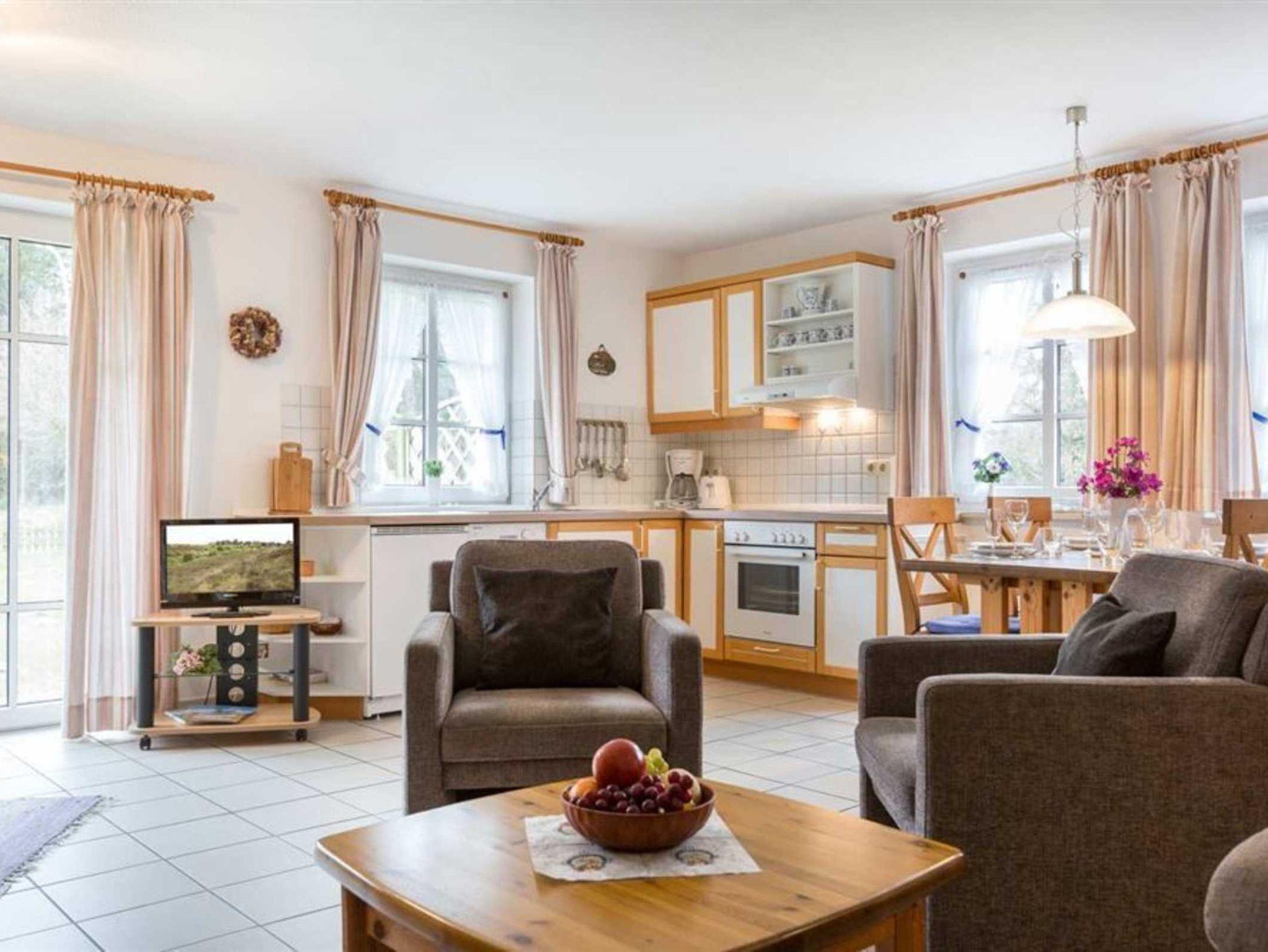 Wohnzimmer mit Sofa für 2 Personen, 2 Sesseln, TV (Kabel), Esstisch mit 4 Stühlen und 2 Einzelbetten (je 90x200cm) im nordirschen Alkovenstil. Abstellraum mit Haushaltsgeräten. Direkter Zugang zur möblierten Gartenterrasse nach Südwesten. Offene Küche mit Backofen, Mikrowelle, Geschirrspüler und Kühlschrank mit Gefrierfach.