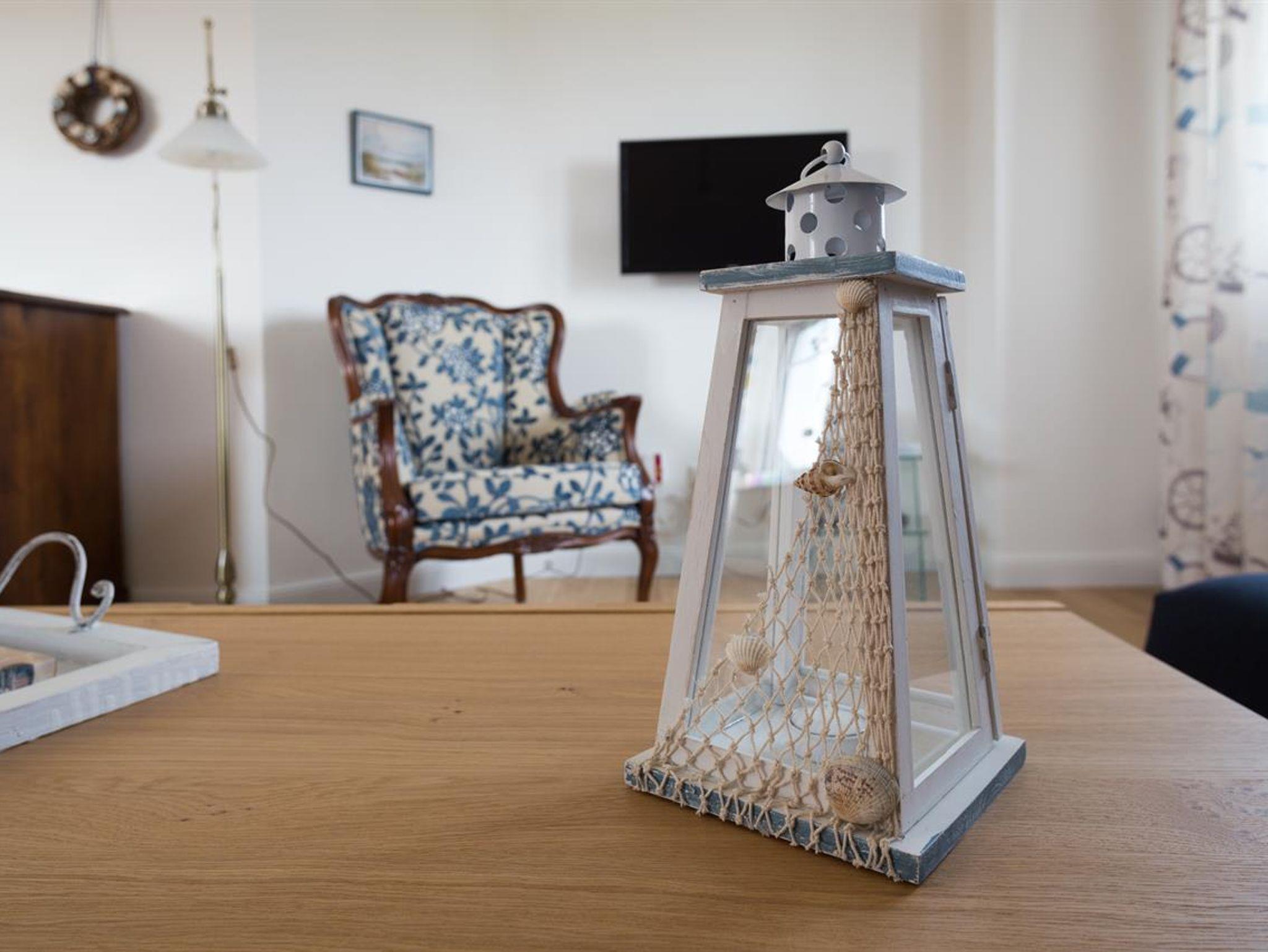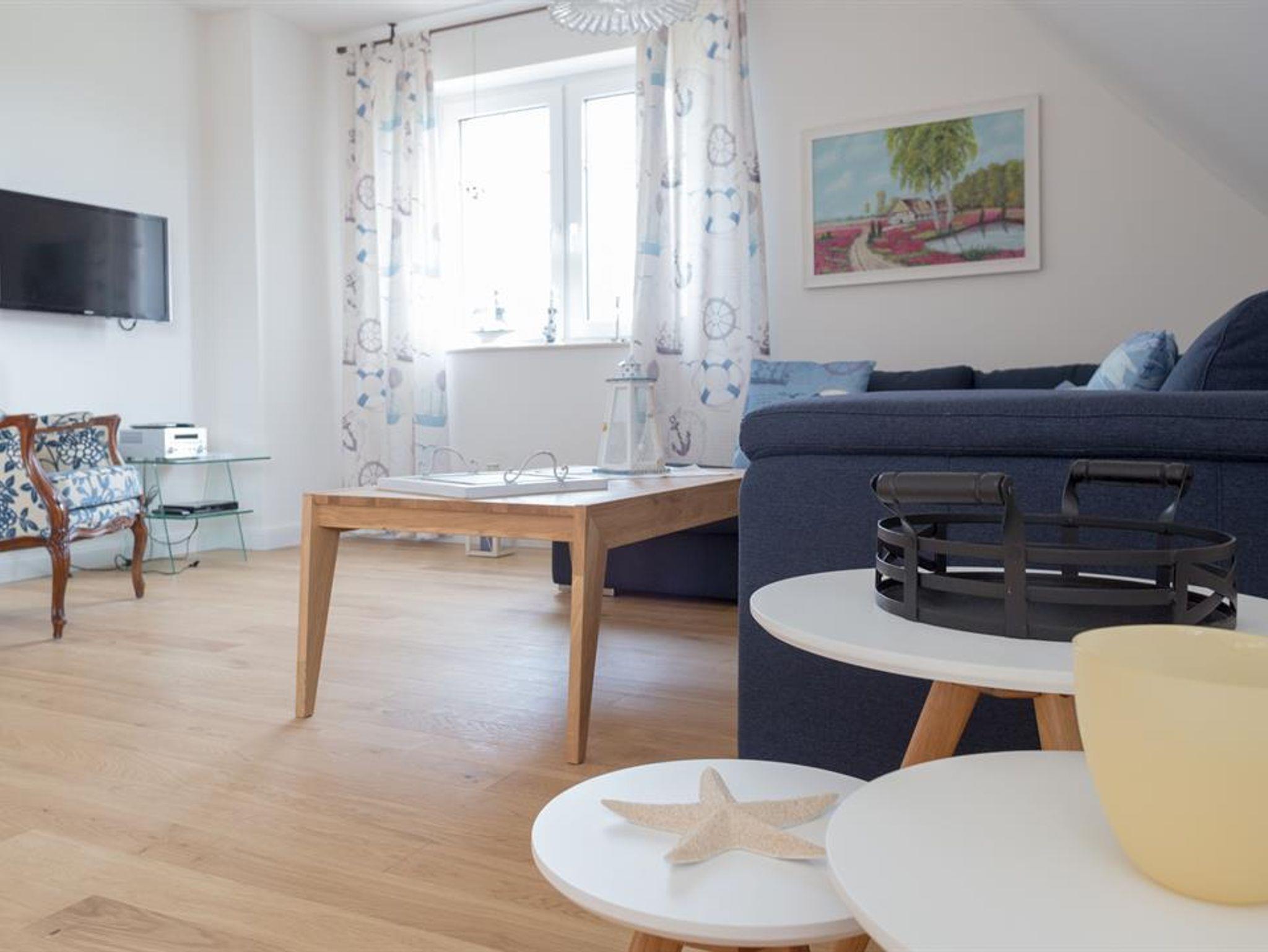 Das Wohnzimmer vermittelt u.a. mit dem beleuchteten Bullauge und dem englischen Teewagen eine maritime Atmossphäre.