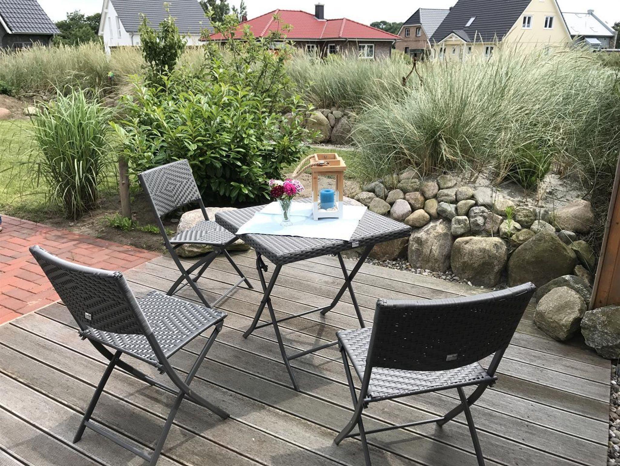 Die Holzbohlenterrasse im Garten bietet die Möglichkeit zum Sonnenbad und Seeluft tanken